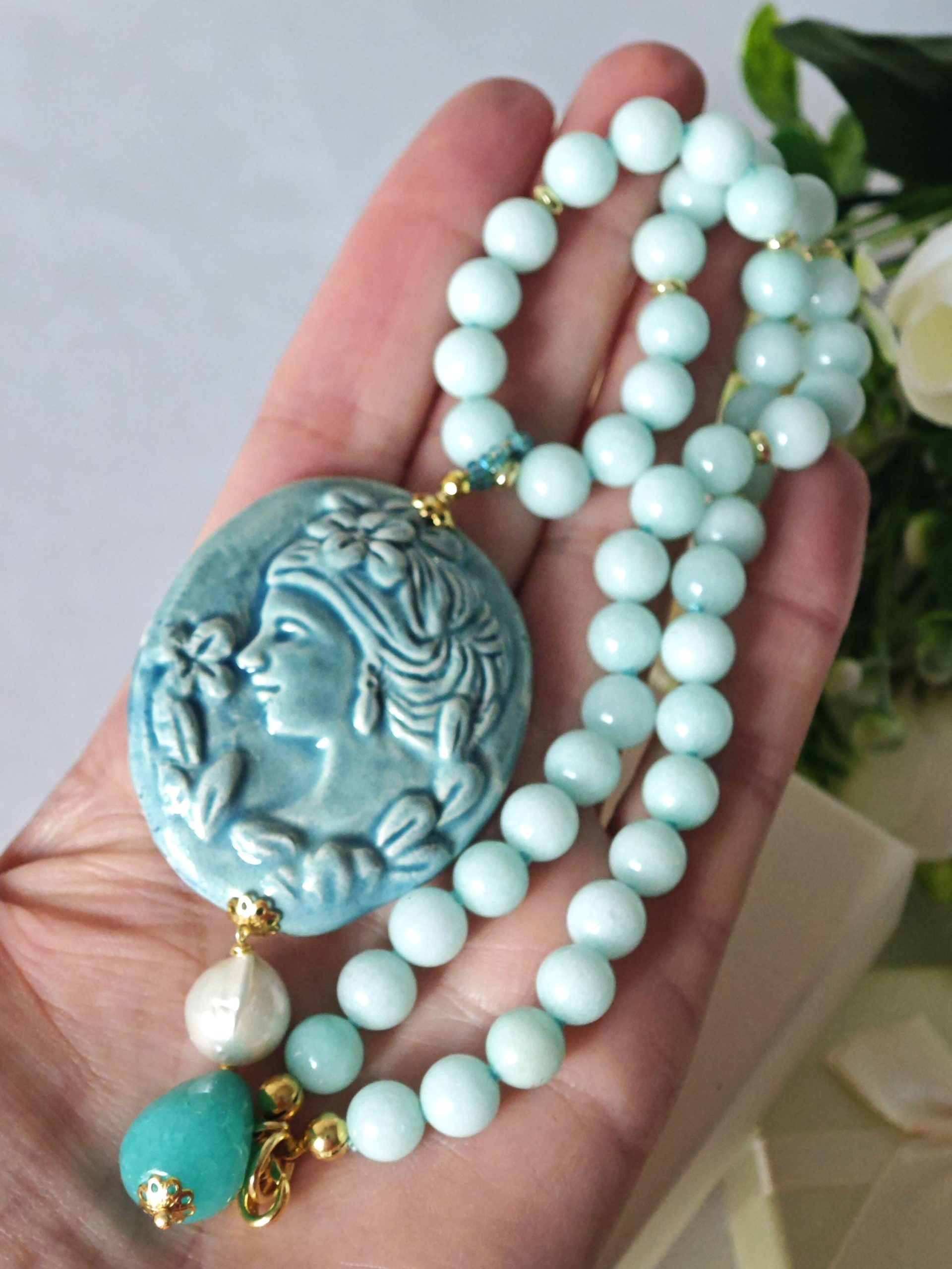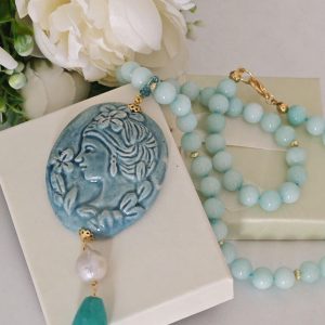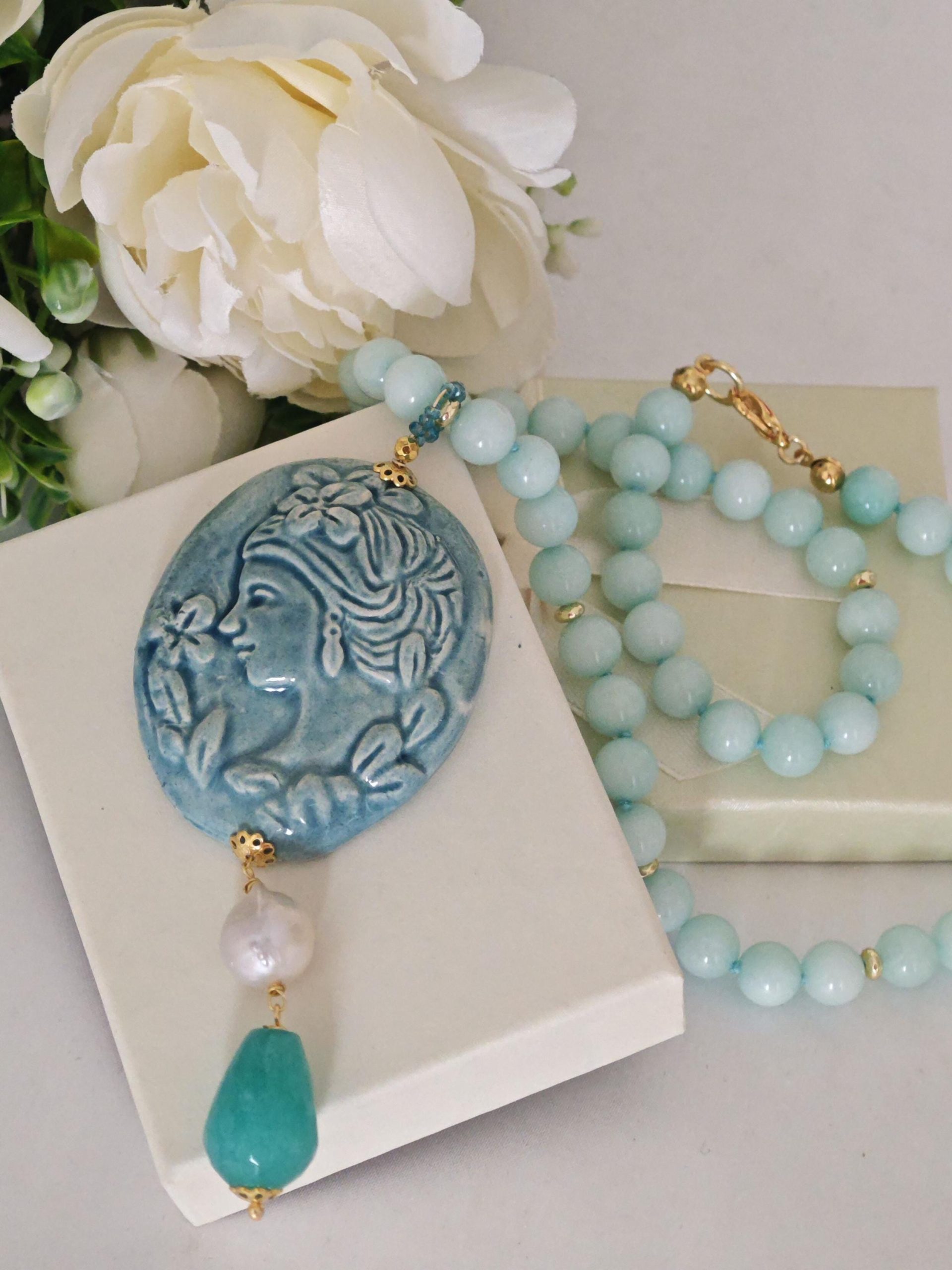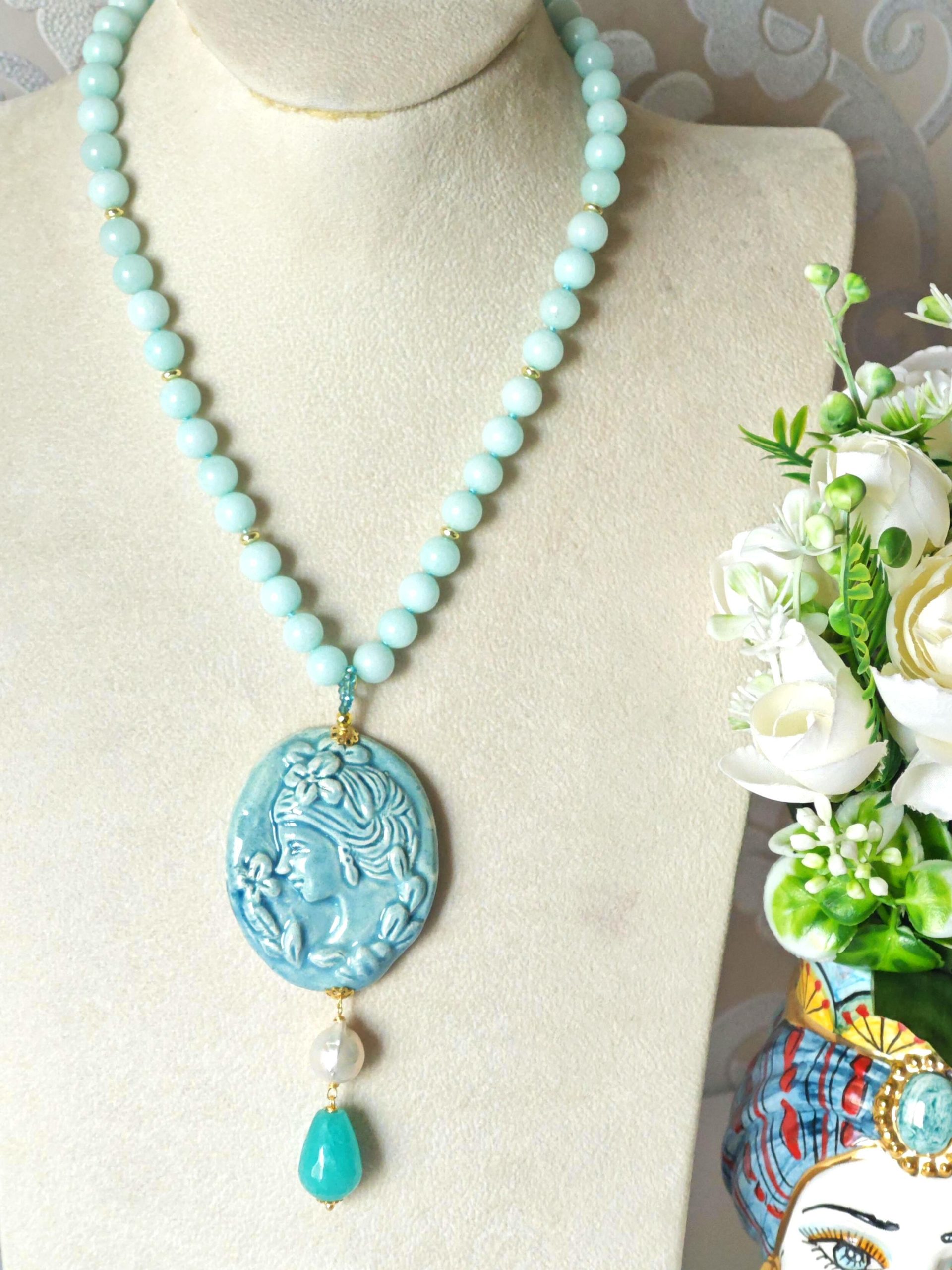 Collana cammeo ceramica di Caltagirone con pietre dure giada celeste, gioielli italiani