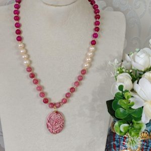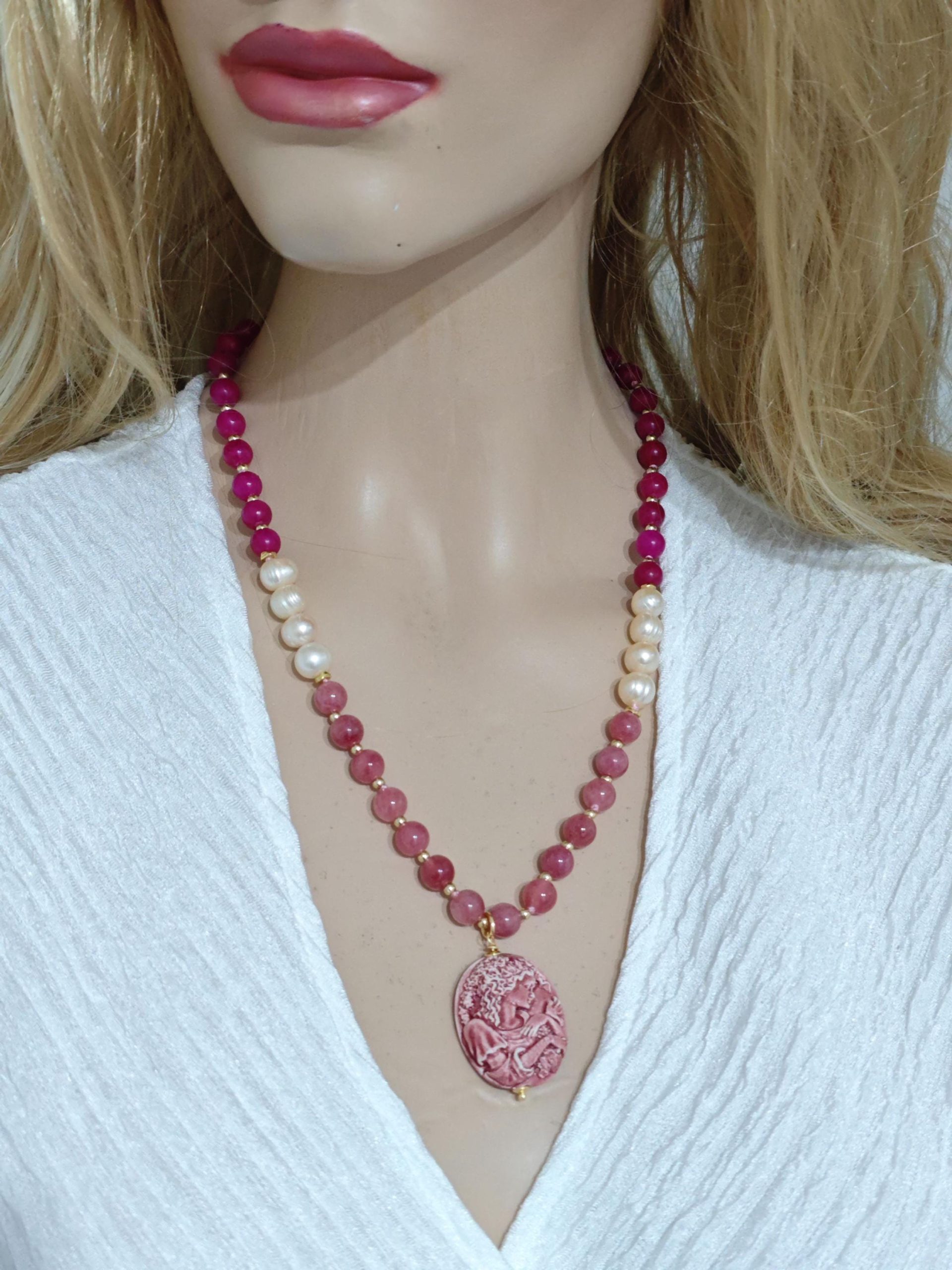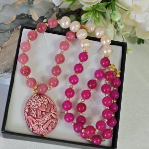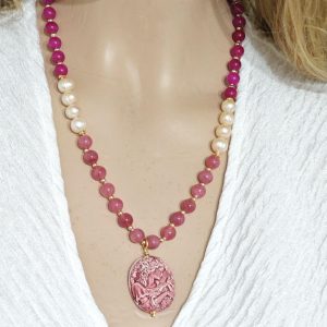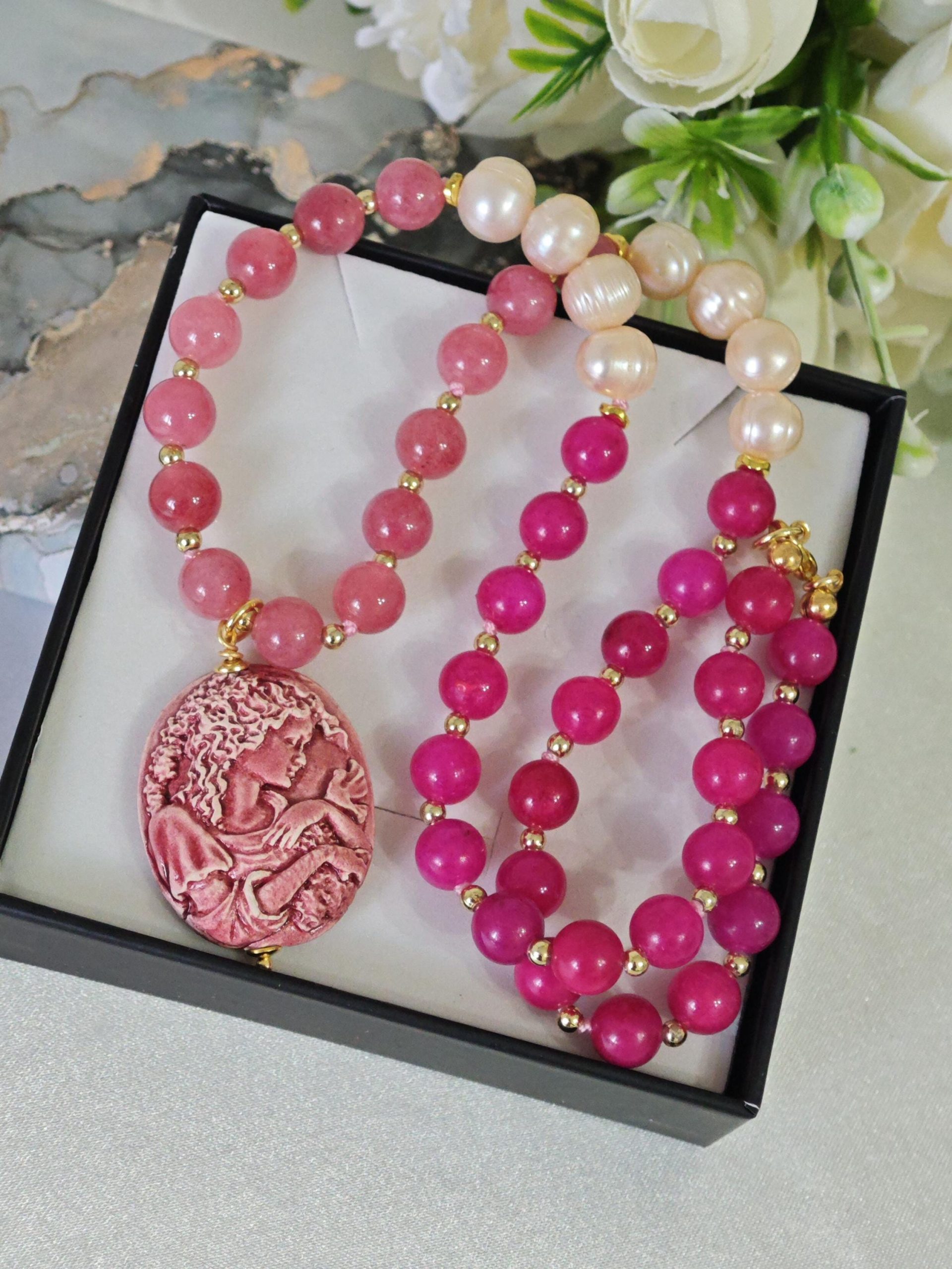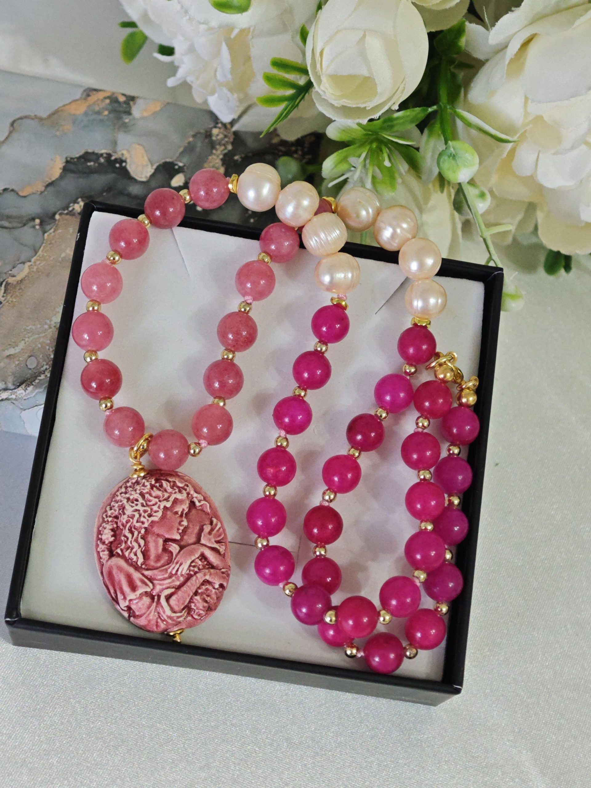 Collana girocollo realizzata a mano con pietre dure giada rosa 8 mm e perle naturali rosa con pendente cammeo in ceramica di Caltagirone realizzata e dipinta a mano 3×2,7 cm dimensioni , chiusura a moschettone in otone dorato.
