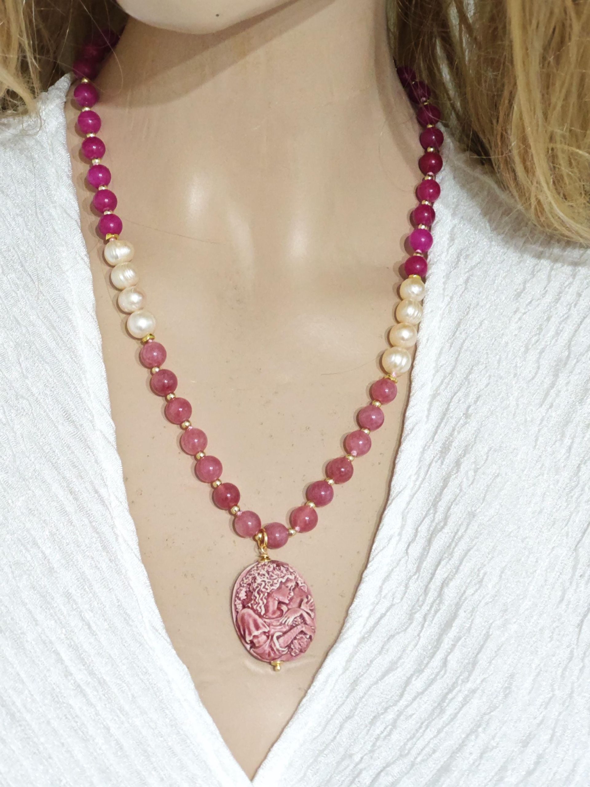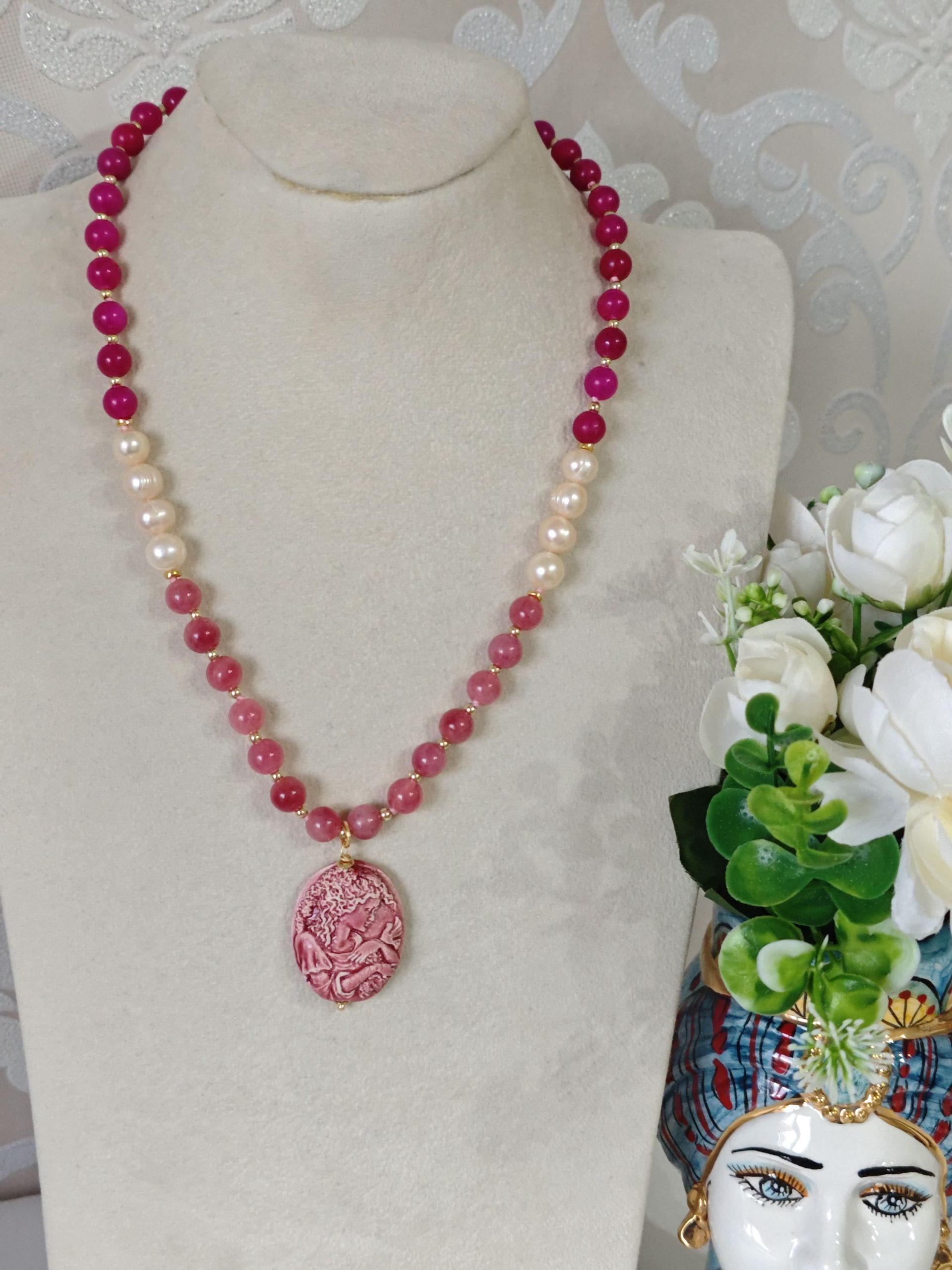Collana cammeo ceramica di Caltagirone con pietre dure giada rosa e perle, collana siciliana