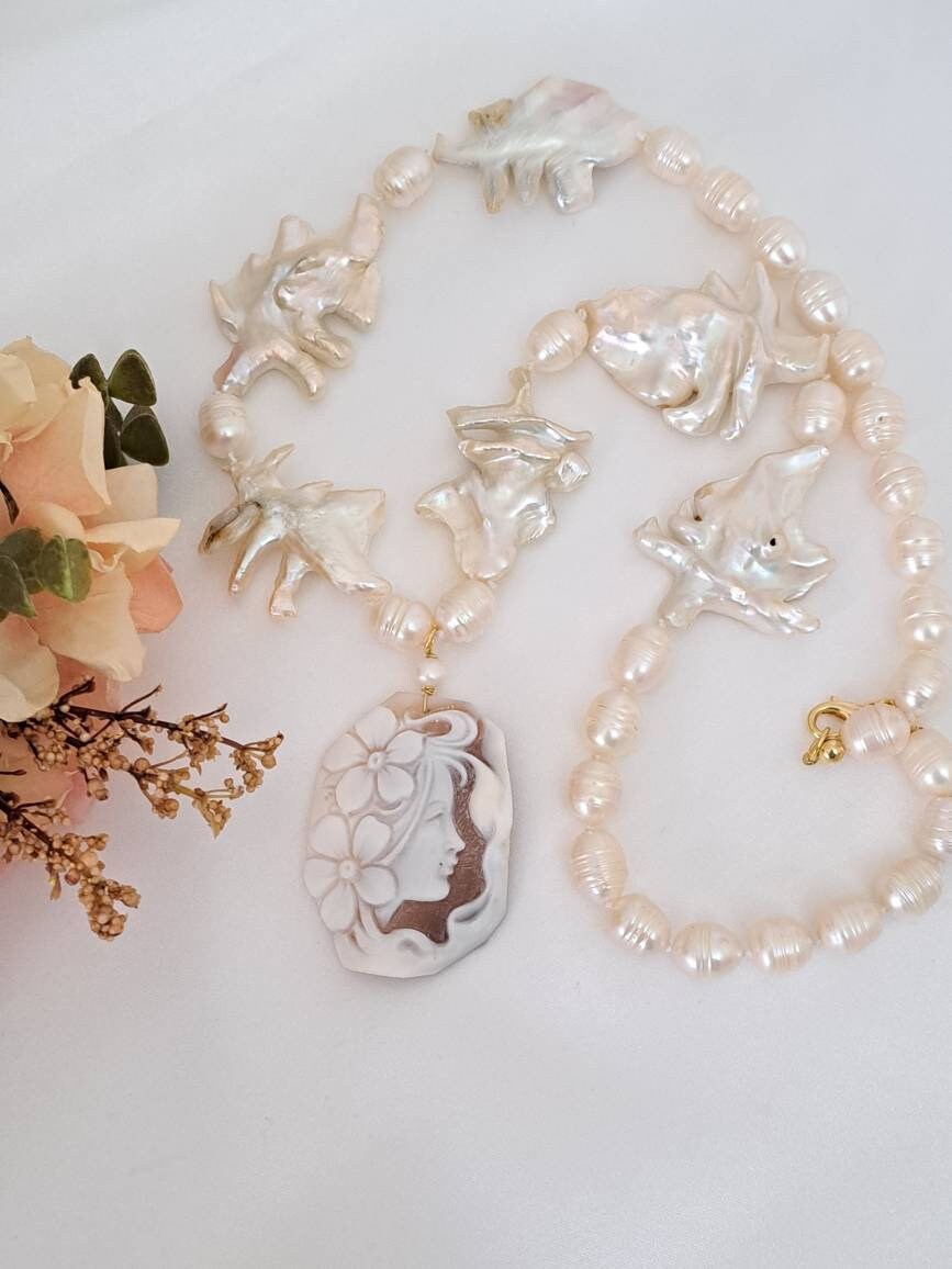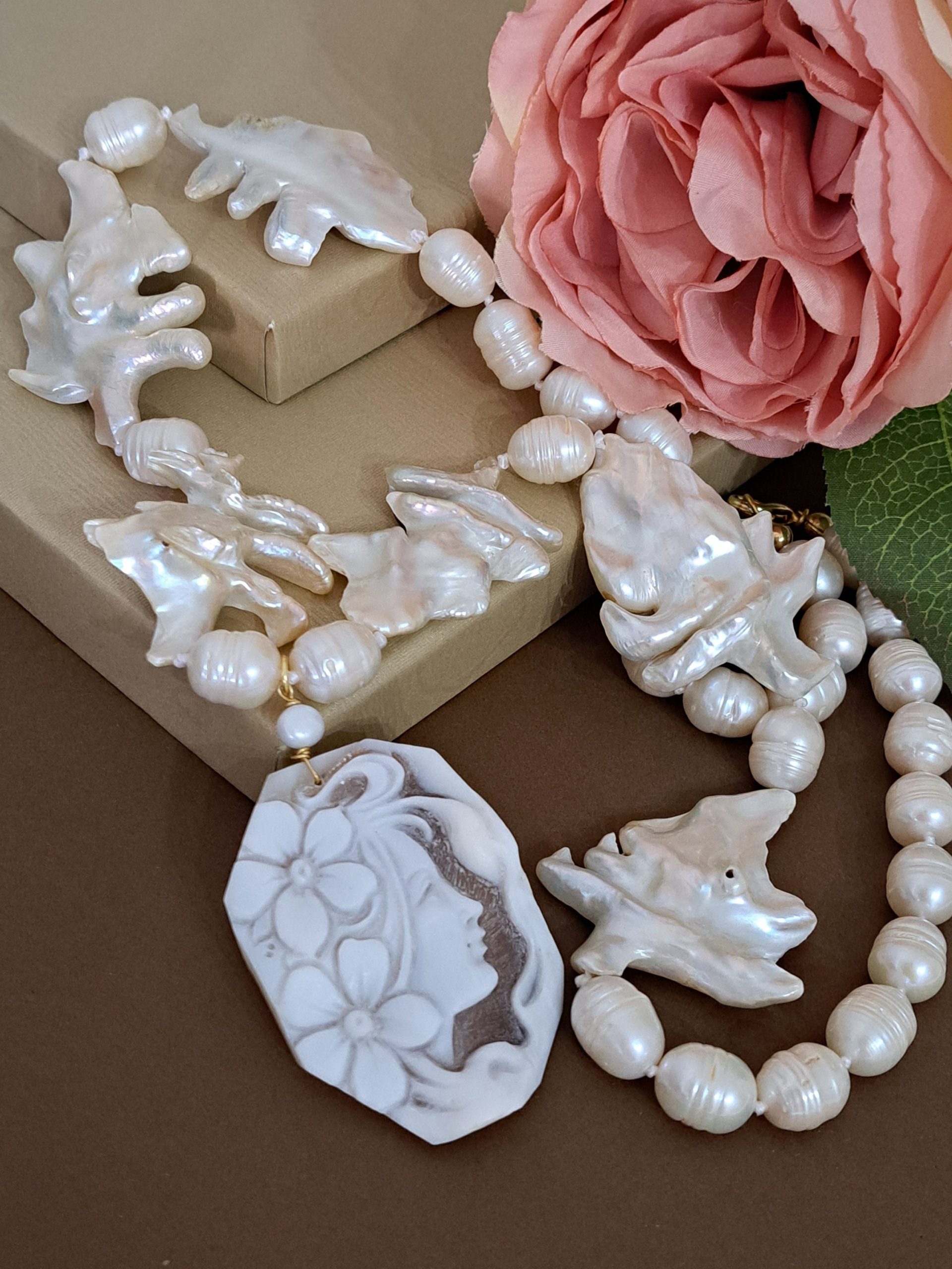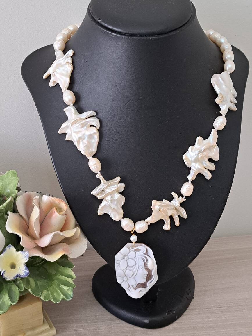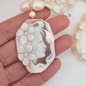 Collana cammeo conchiglia, collana perle barocche bianche, gioielli italiani, cammeo necklace