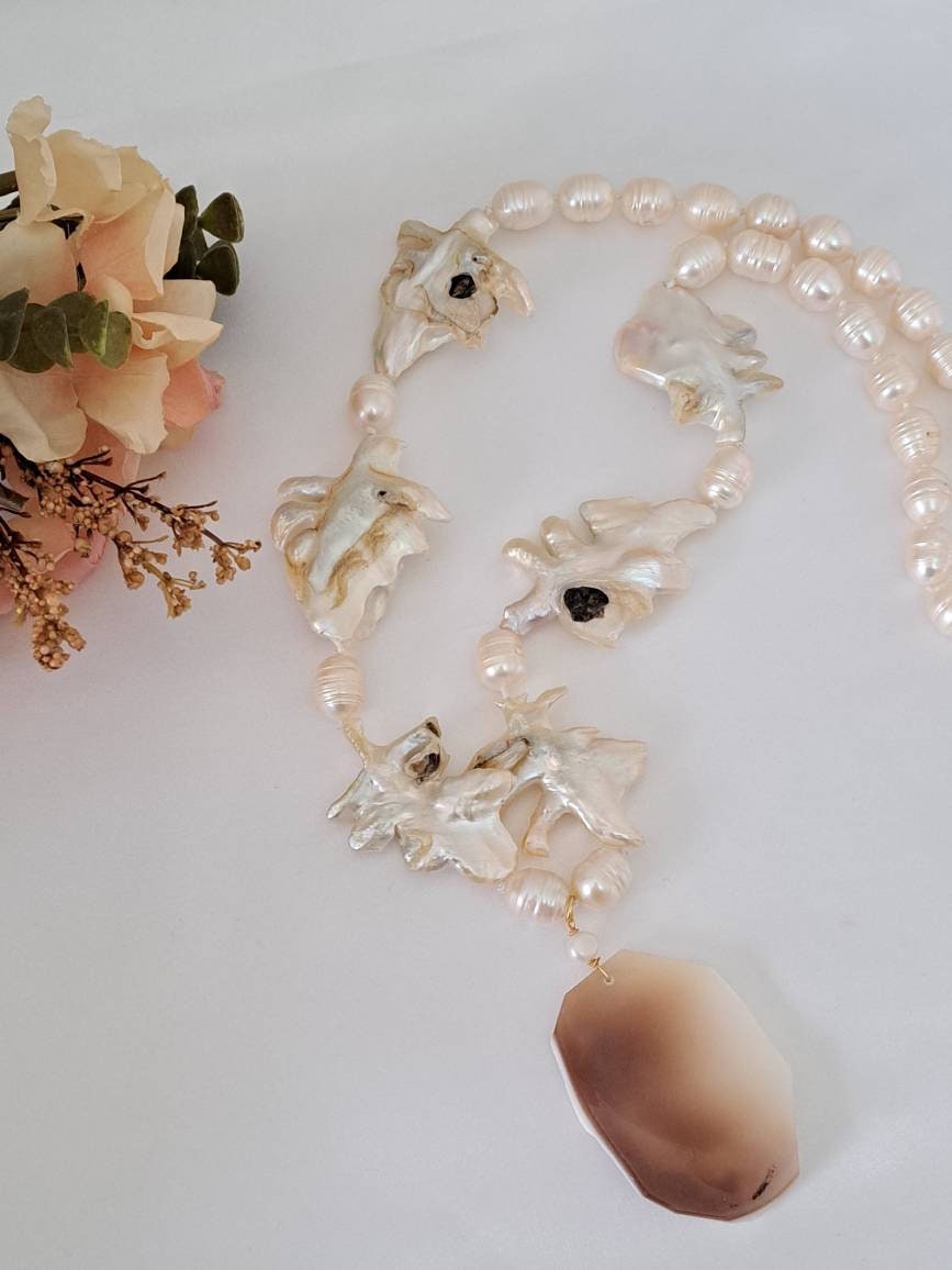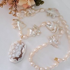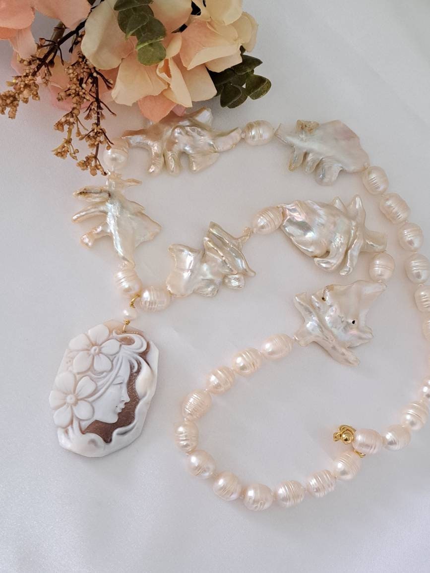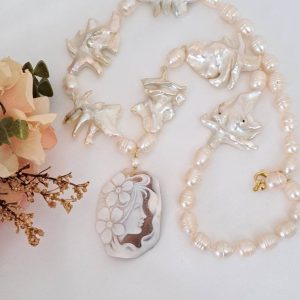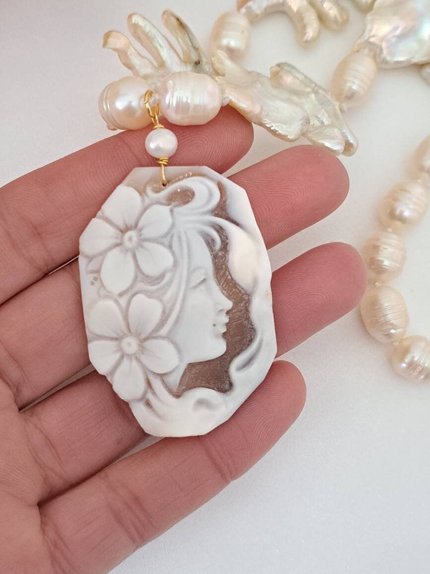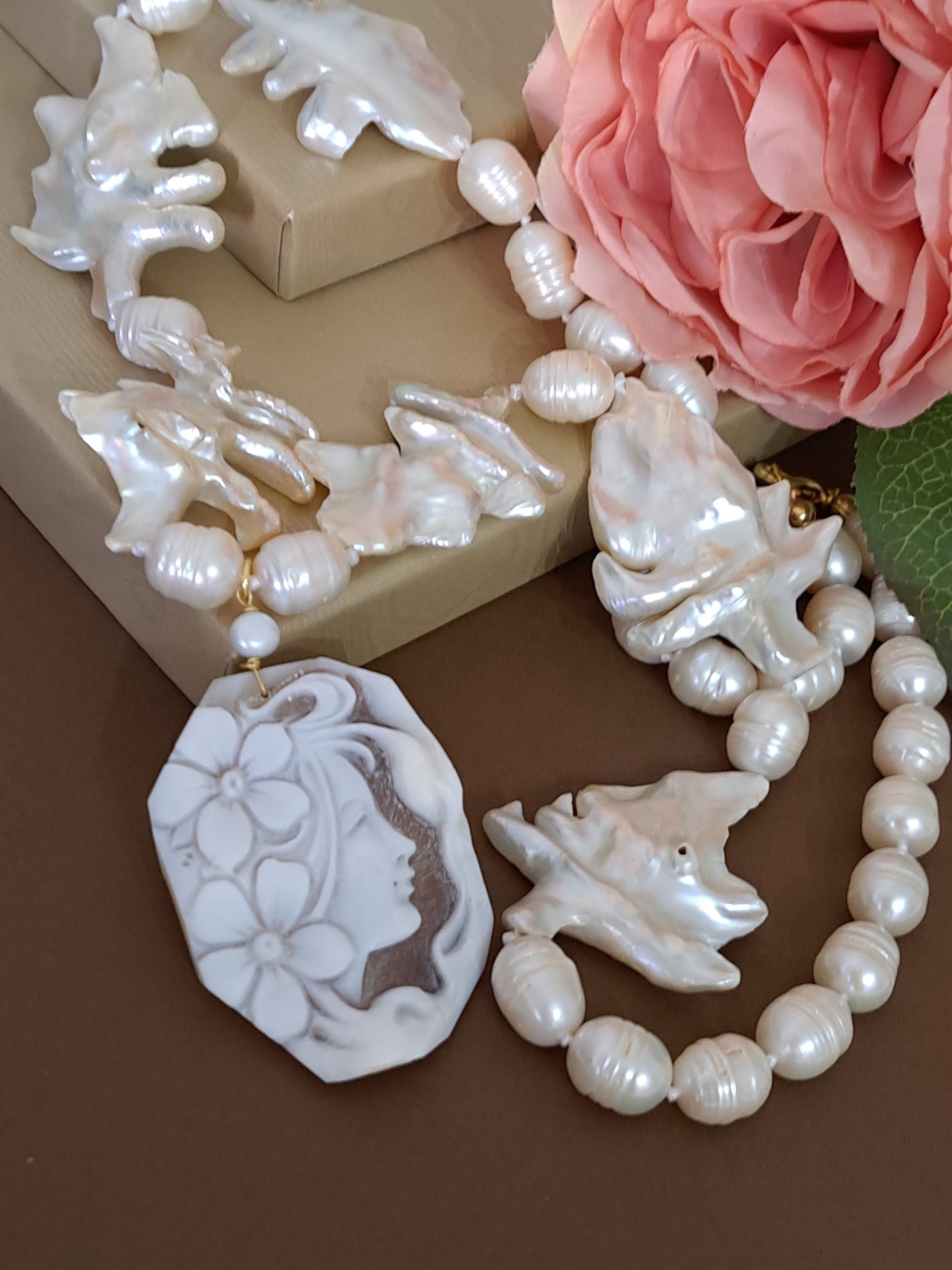 Collana cammeo conchiglia, collana perle barocche bianche, gioielli italiani, cammeo necklace