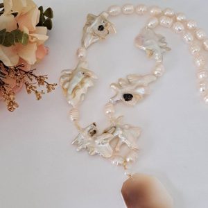 Collana cammeo conchiglia con perle bianche e pietre quarzo citrino, gioielli italiani