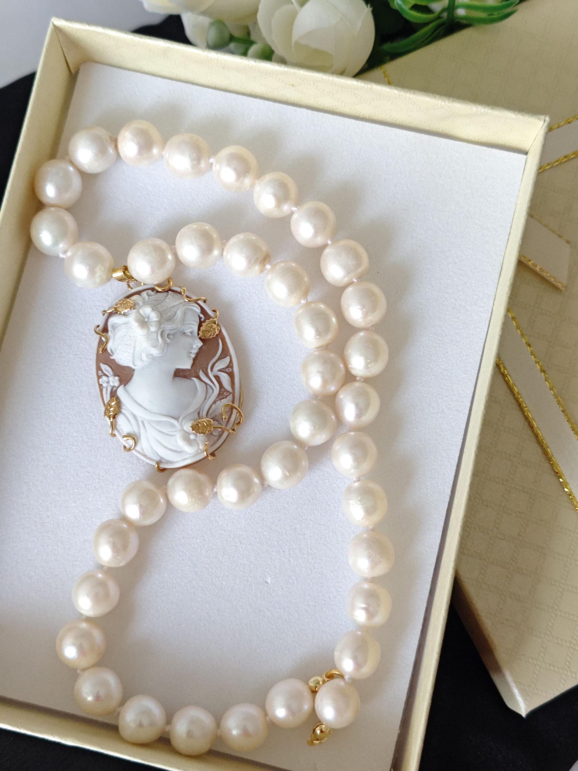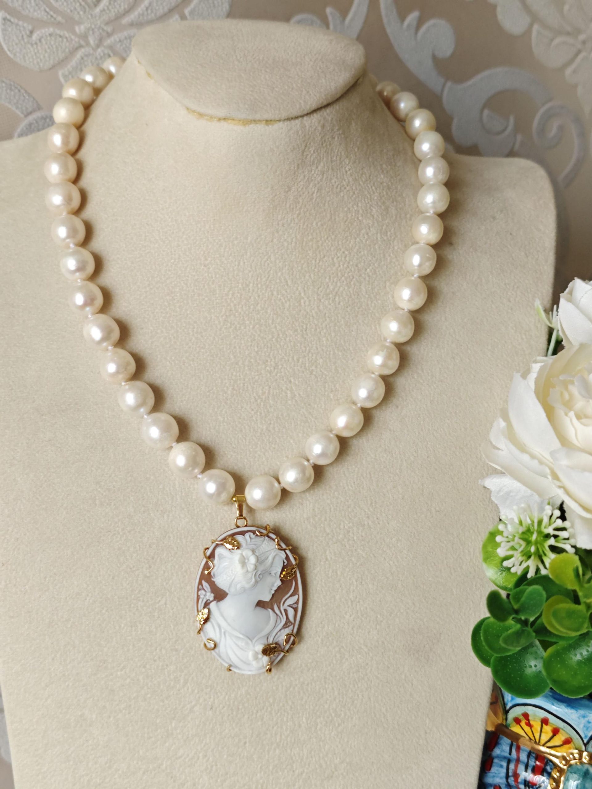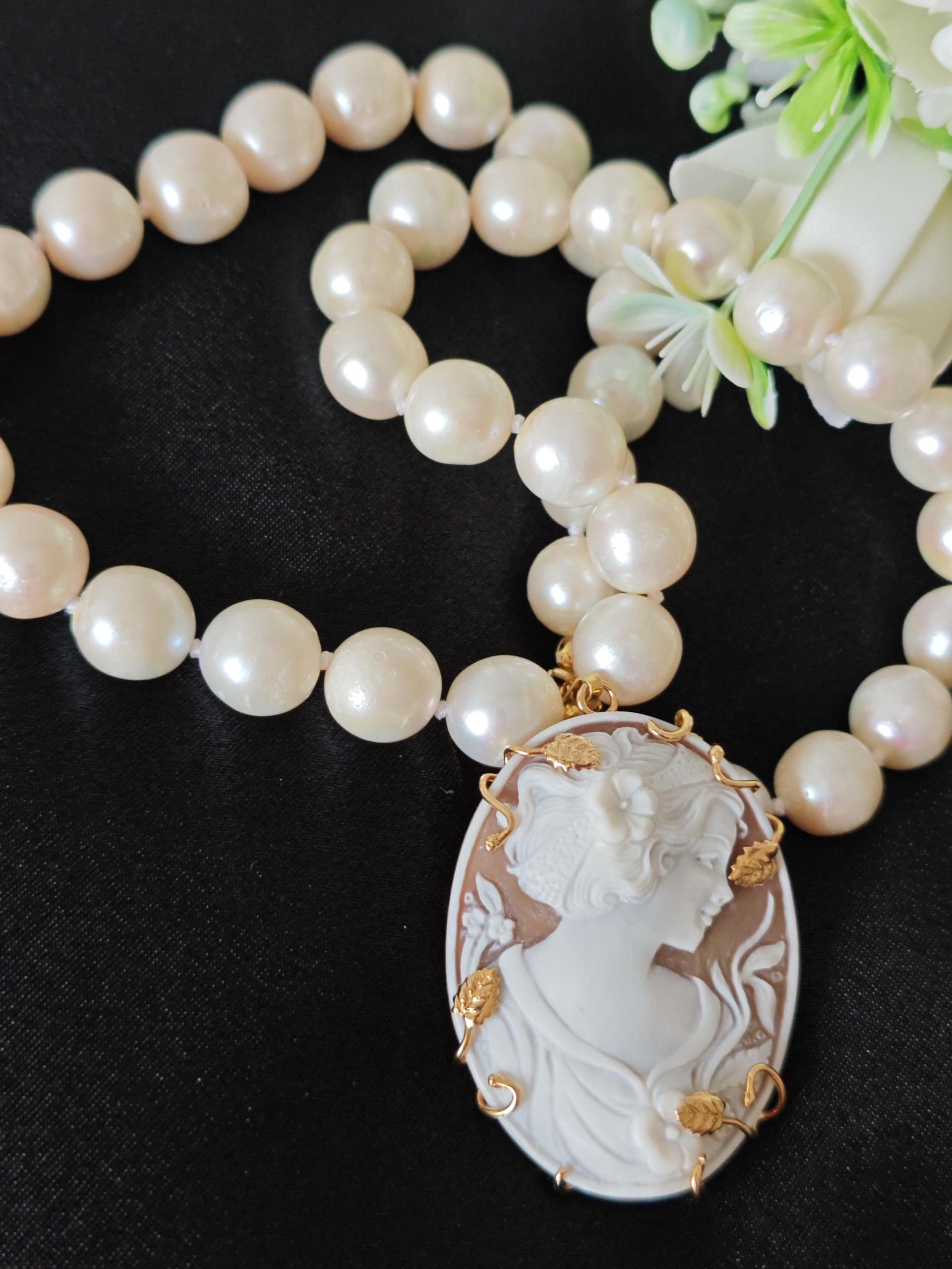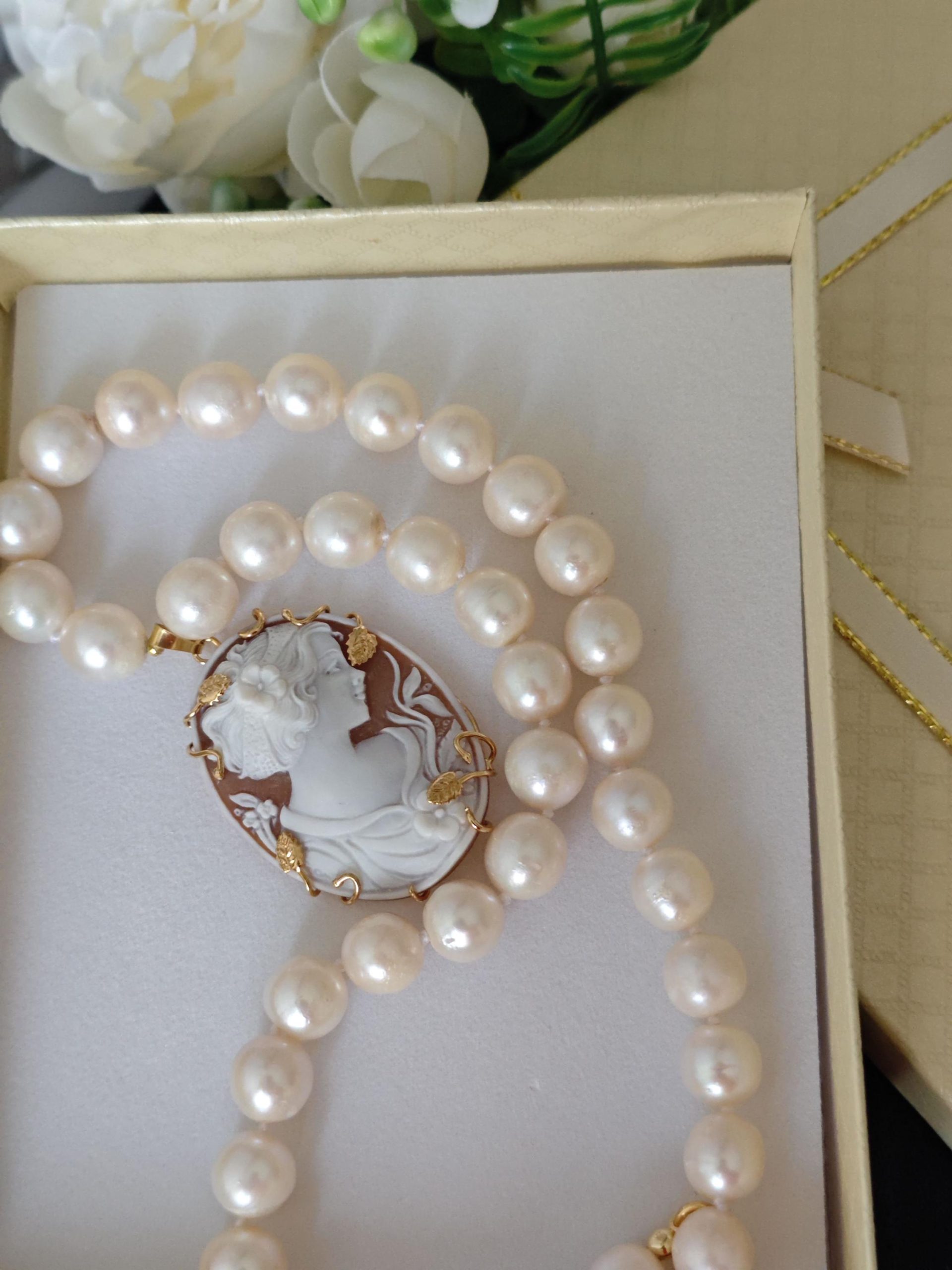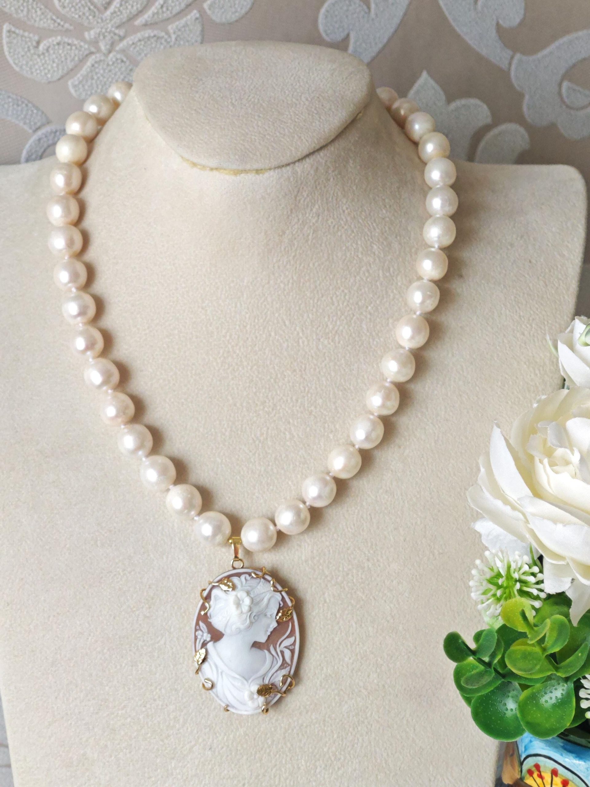 Collana cammeo conchiglia, collana perle bianche, gioielli italiani, cammeo necklace