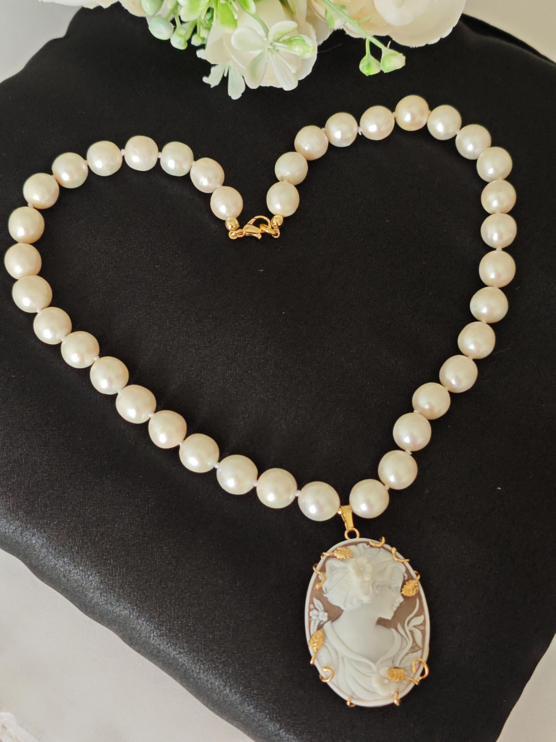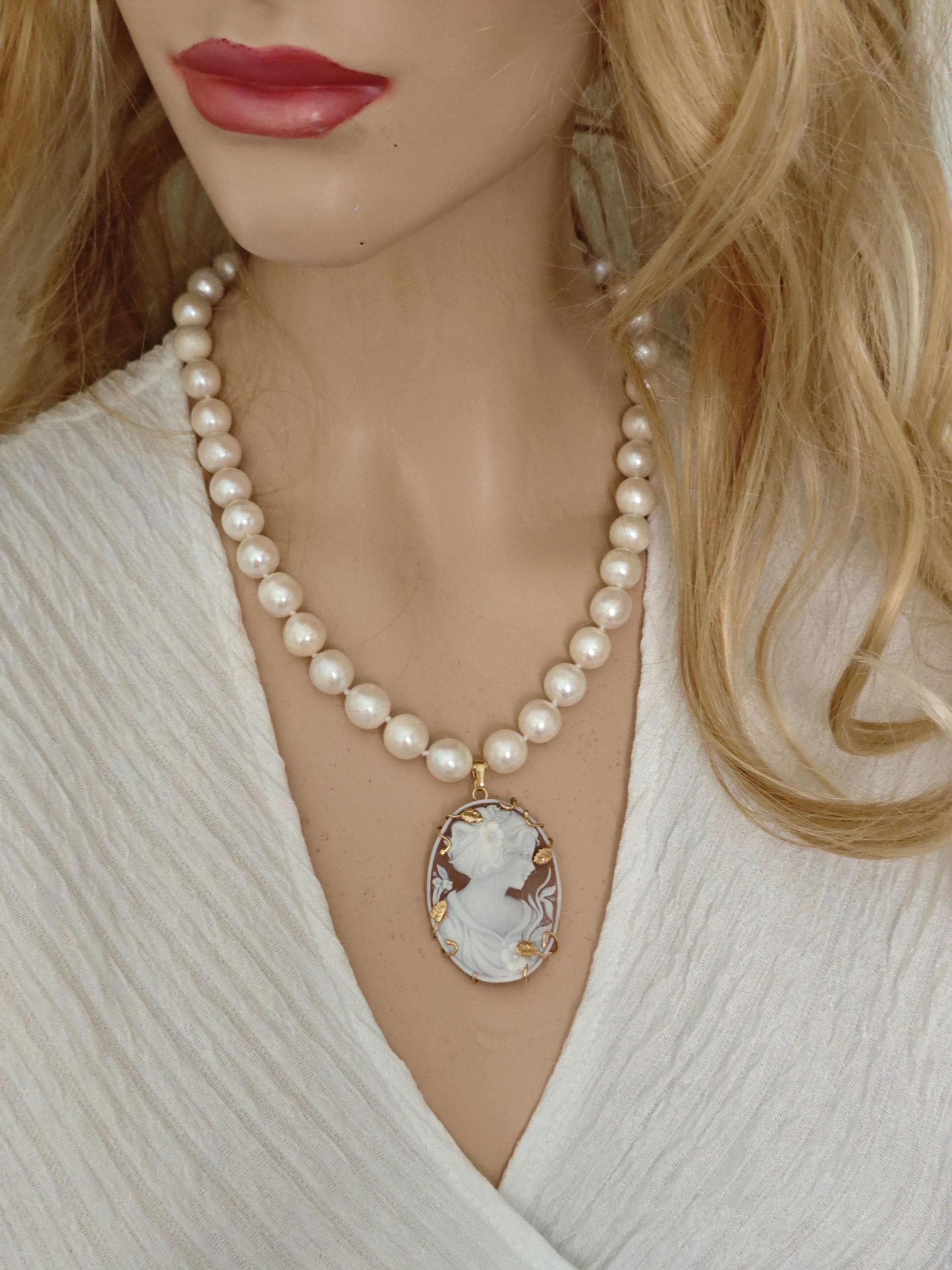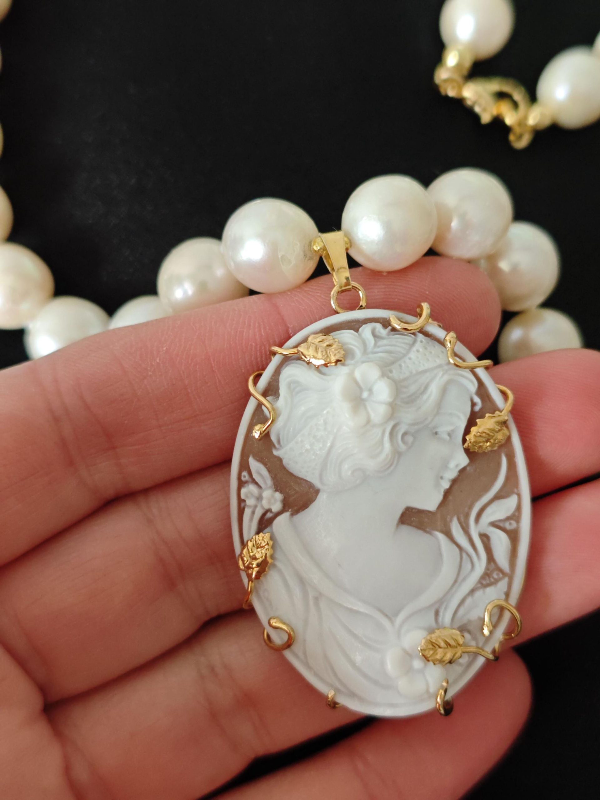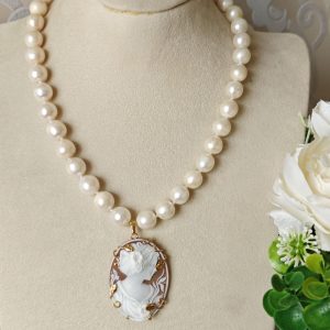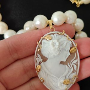 Collana girocollo annodata a mano con perle bianche naturali 10/12 mm, pendente cammeo autentico in conchiglia sardonica scolpito a mano a Torre del greco raffigurante volto di donna , 4,5×3,5 cm dimensioni , incastonato con cornice in argento 925 placcato oro , chiusura a moschettone in argento 925 placcato oro.
