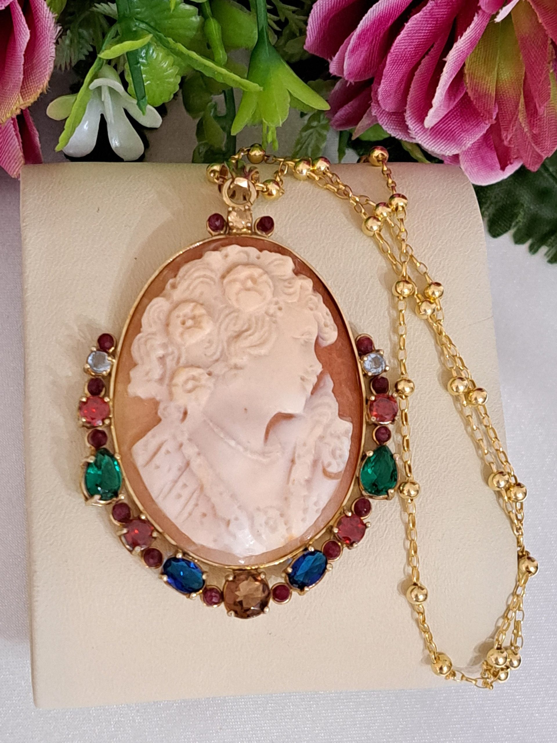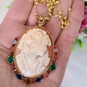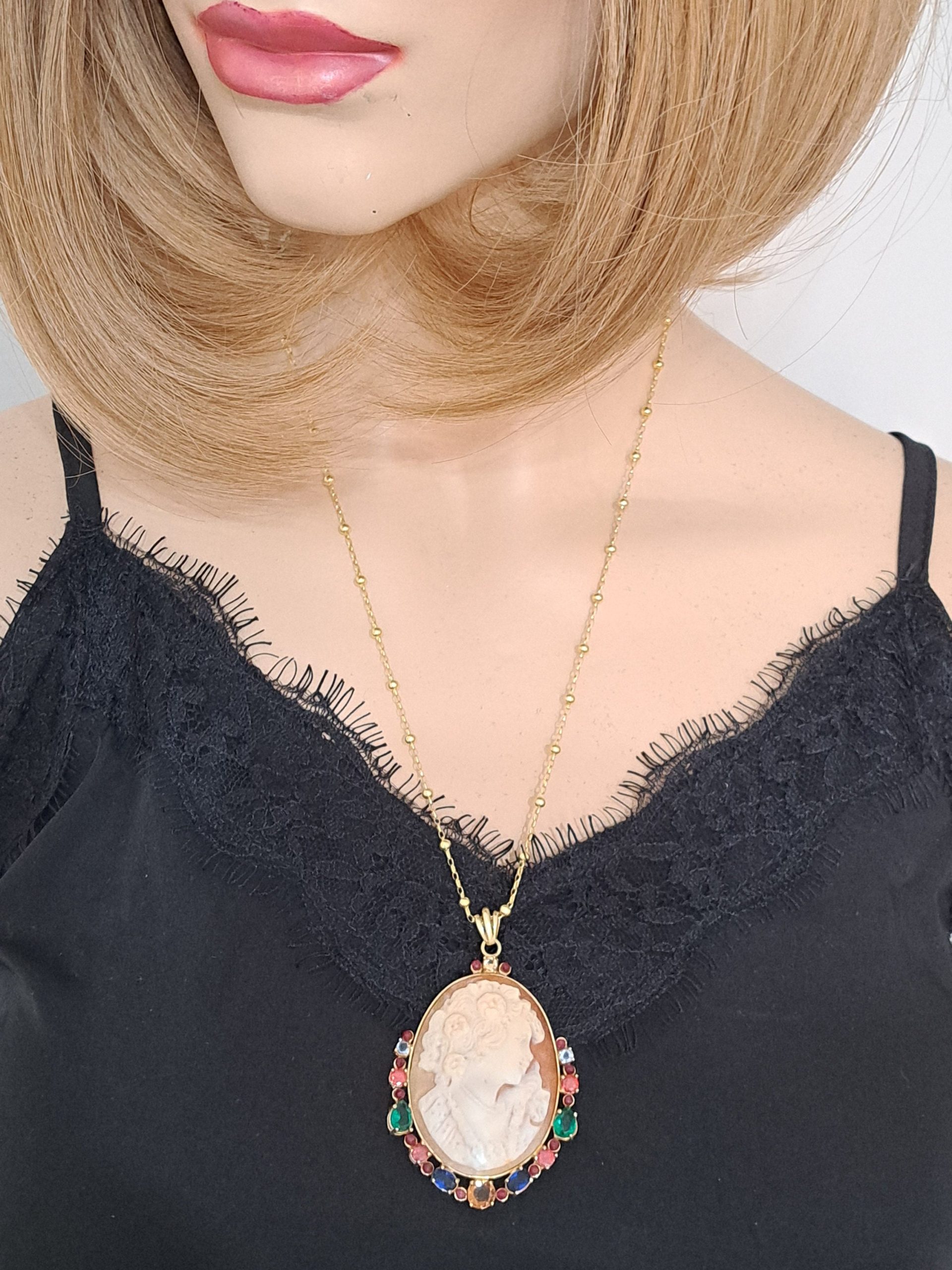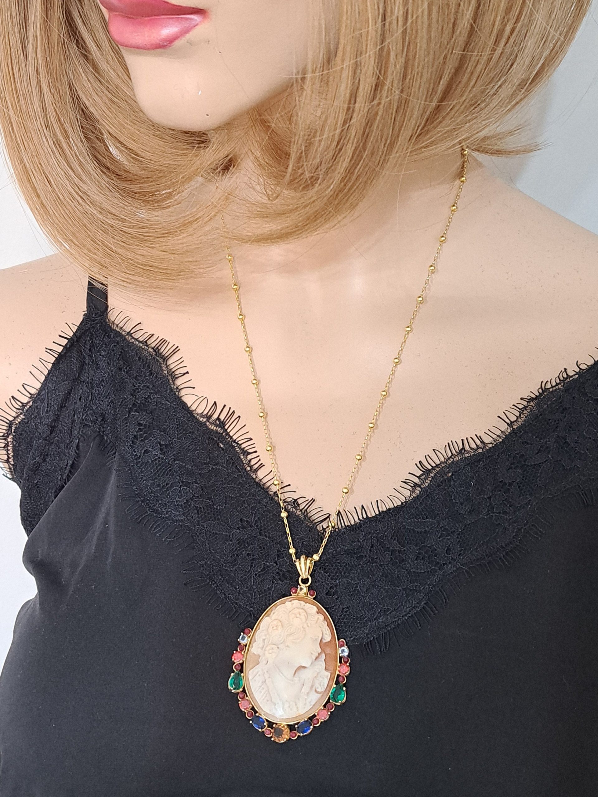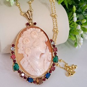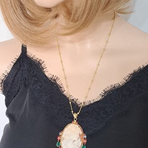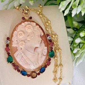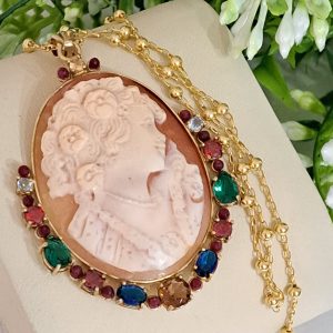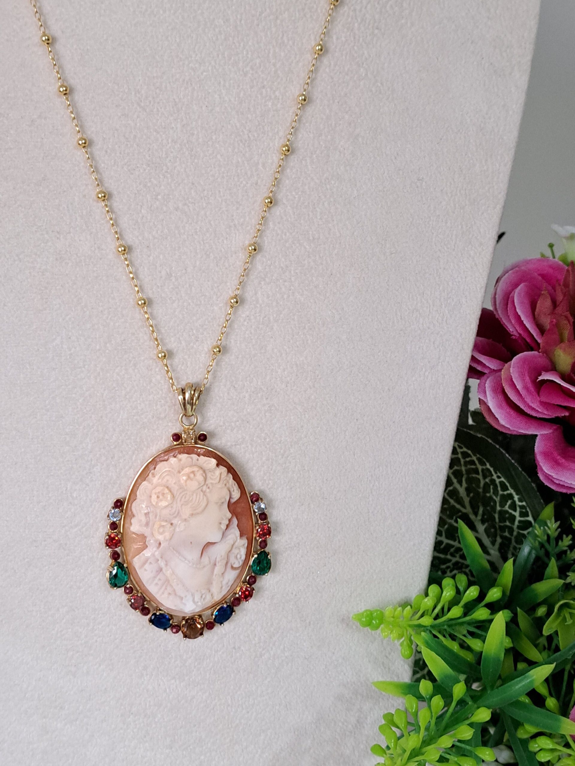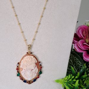 Collana con catena in argento 925 placcato oro , pendente cammeo autentico in conchiglia sardonica scolpito a mano a Torre del greco raffigurante volto di donna 4,5×3,5 cm dimensioni , incastonato con cornice in argento 925 placcato oro con pietre multicolore , chiusura a moschettone in argento 925 placcato oro.
