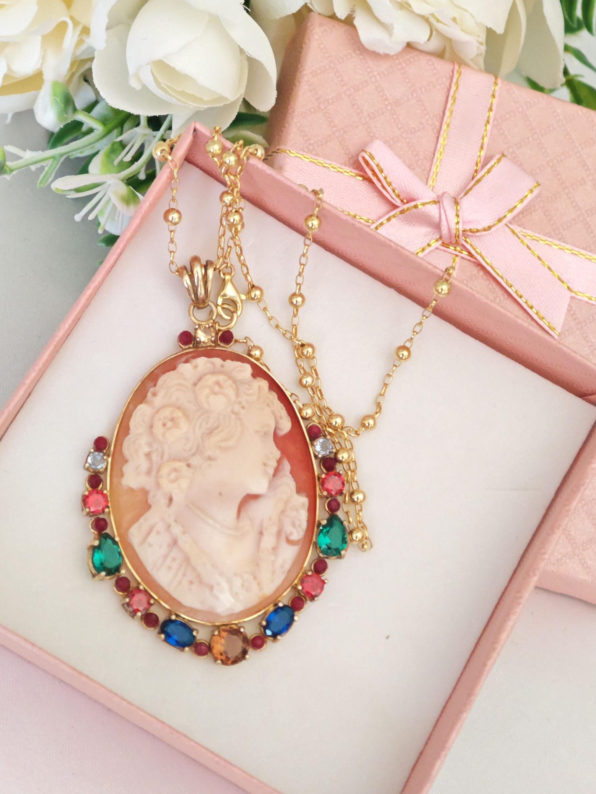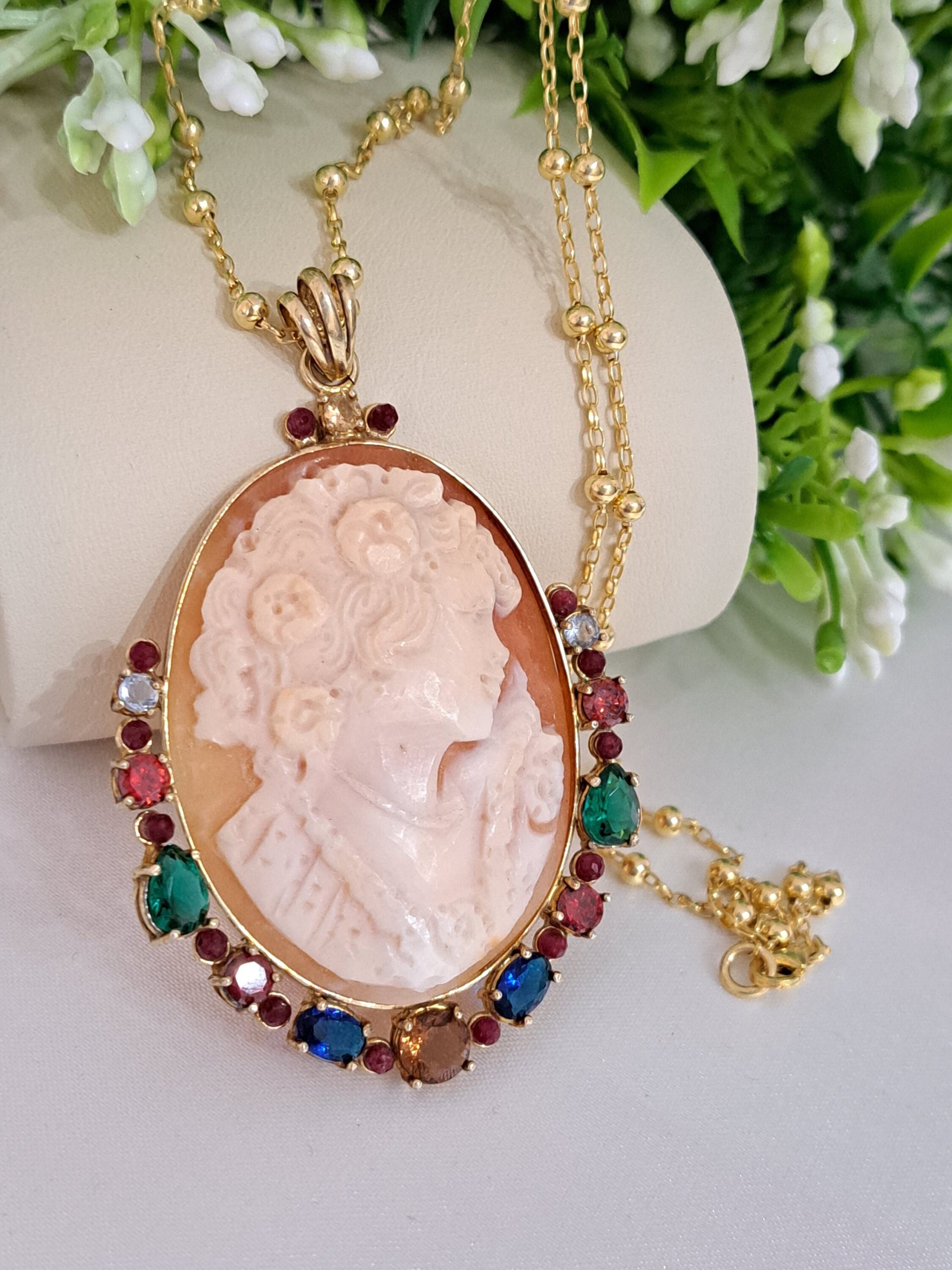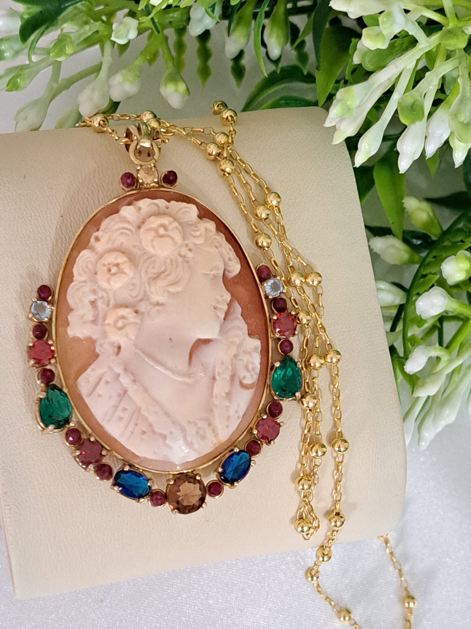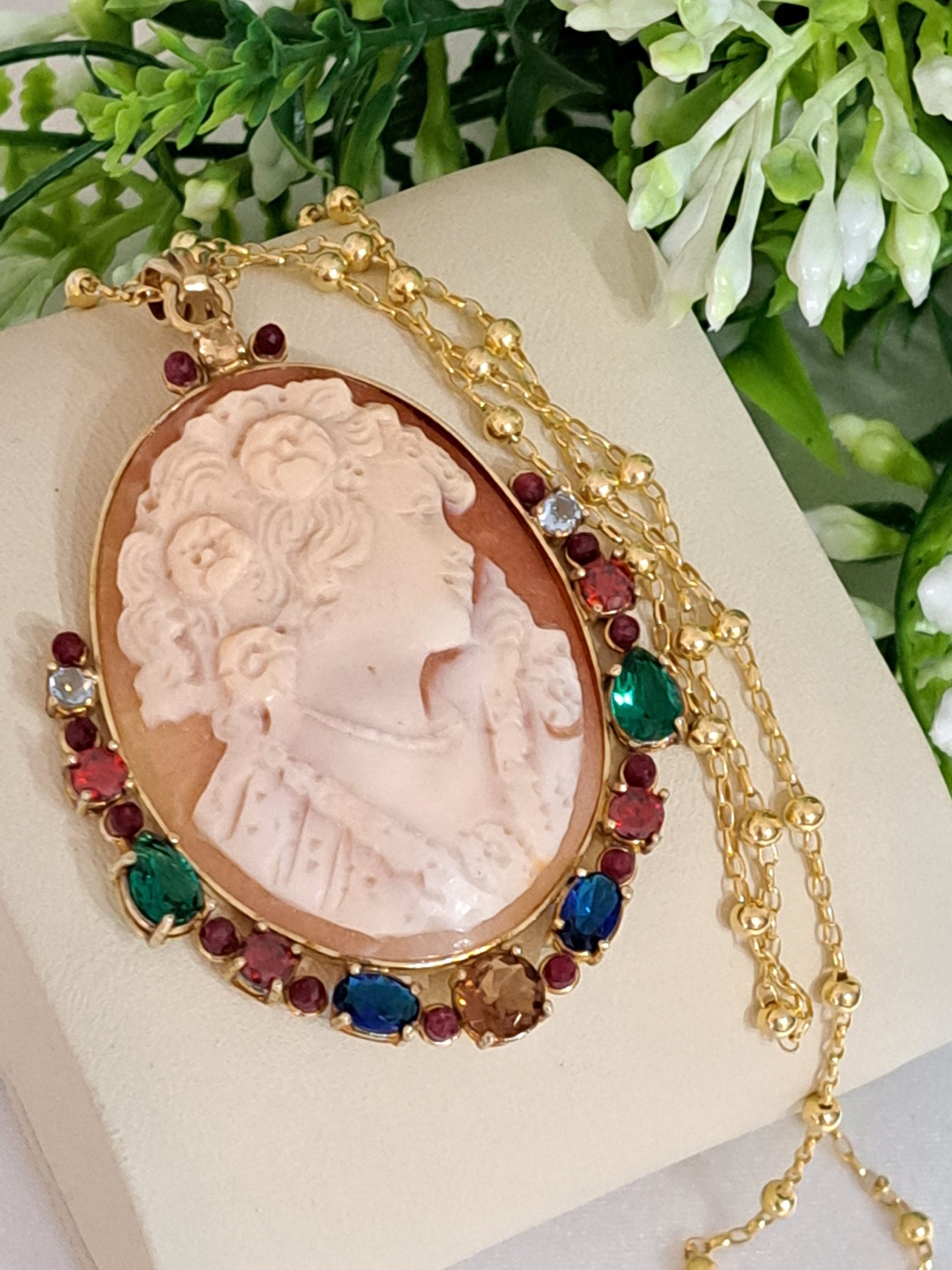 Collana con catena in argento 925 placcato oro , pendente cammeo autentico in conchiglia sardonica scolpito a mano a Torre del greco raffigurante volto di donna 4,5×3,5 cm dimensioni , incastonato con cornice in argento 925 placcato oro con pietre multicolore , chiusura a moschettone in argento 925 placcato oro.
