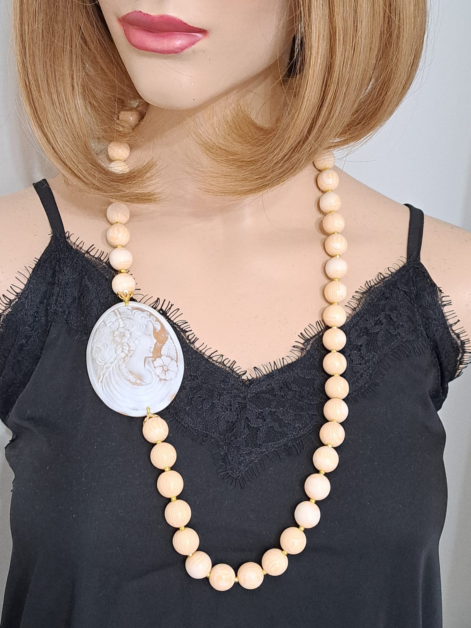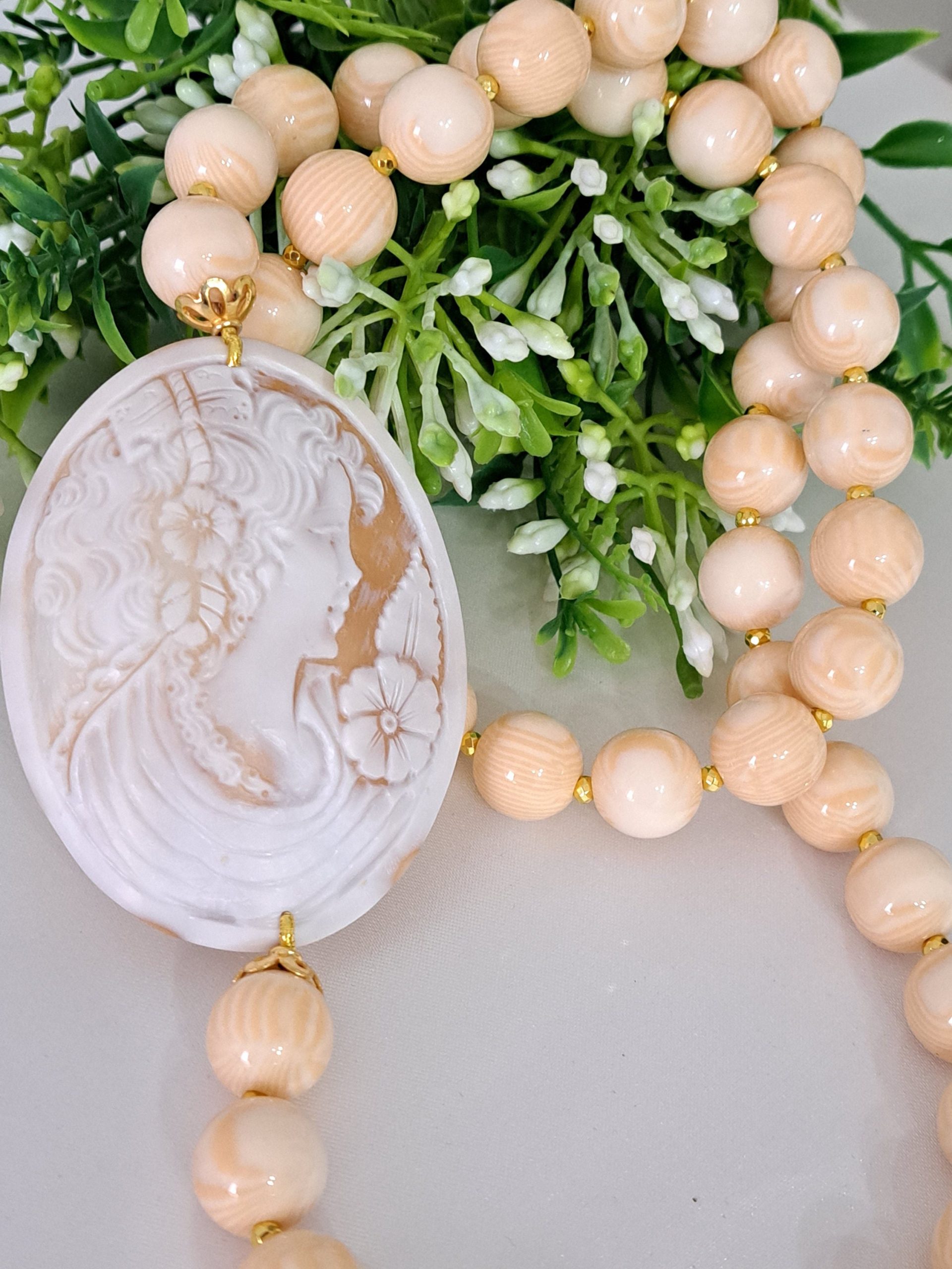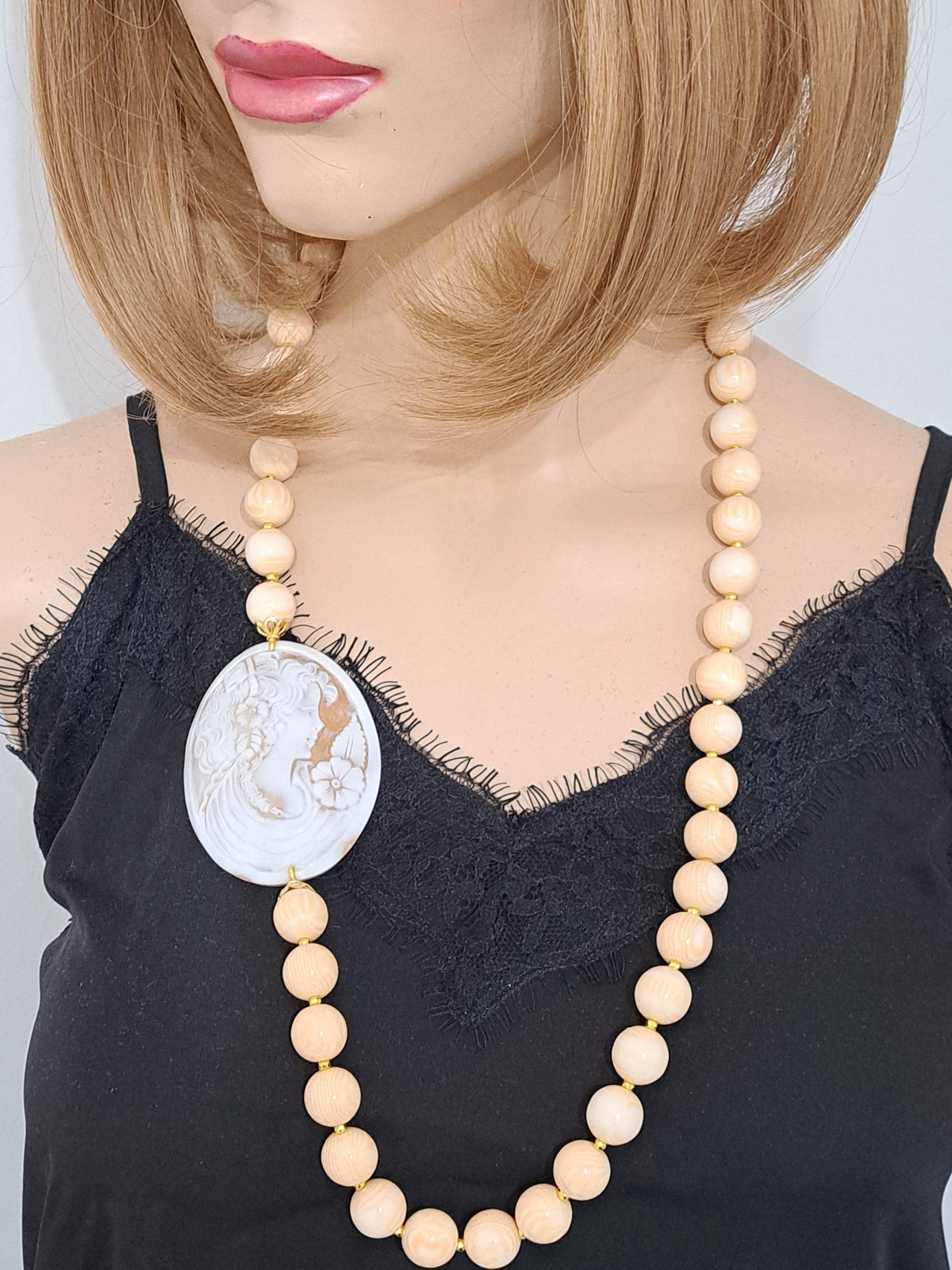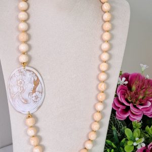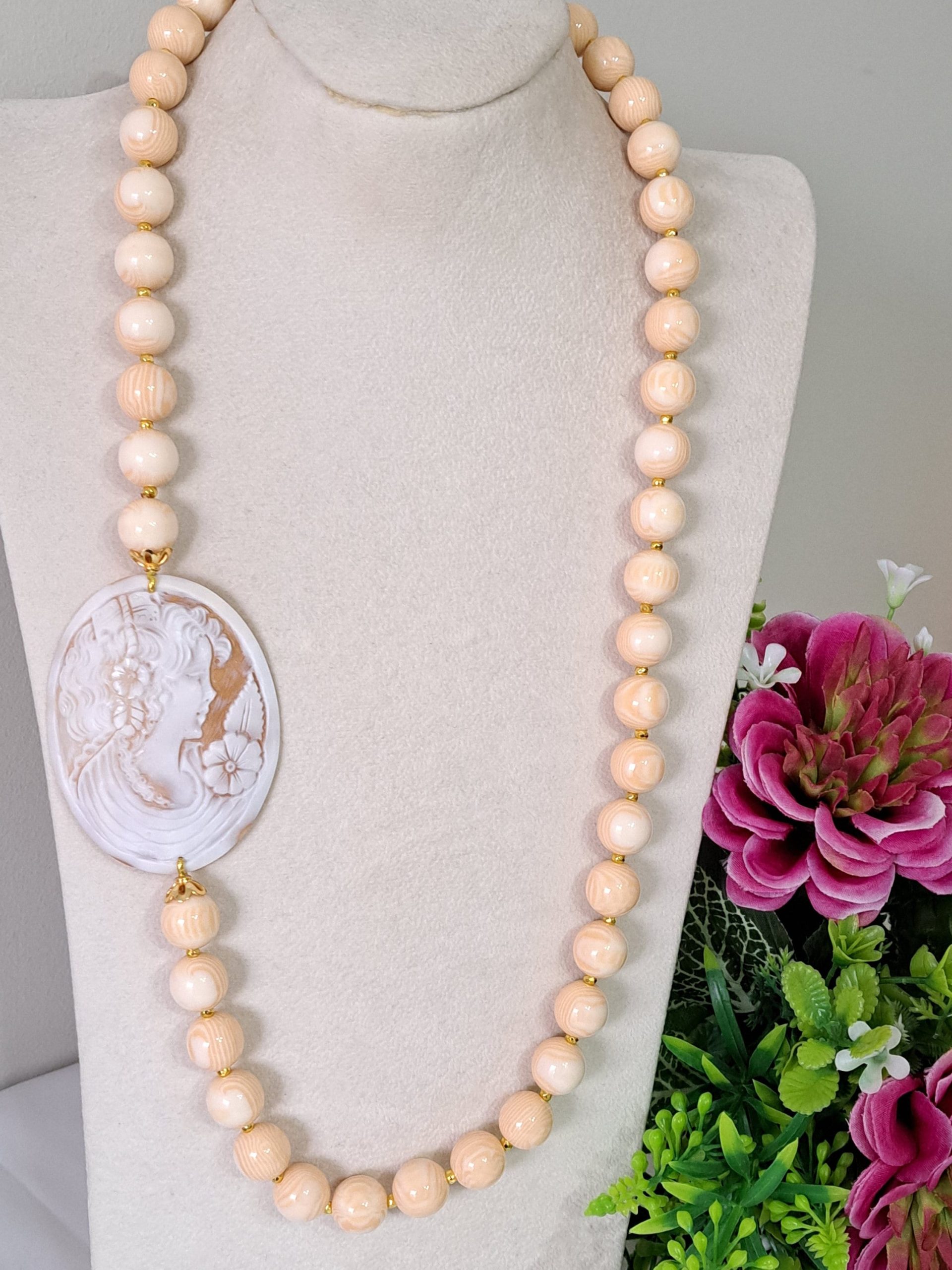 Collana cammeo conchiglia sardonica , collana perle avorio , gioielli italiani