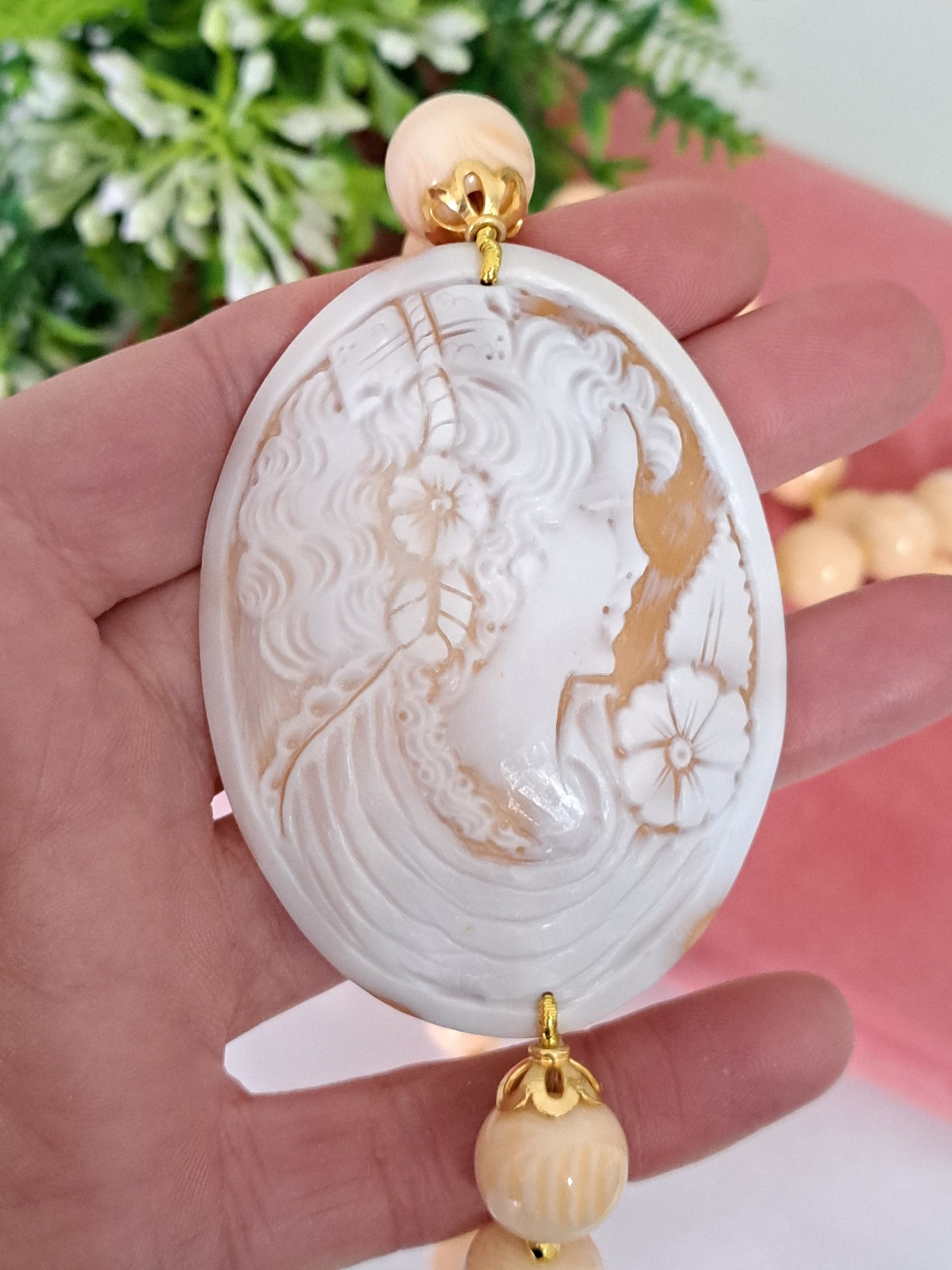 Collana realizzata a mano con cammeo autentico in conchiglia sardonica scolpito a mano a Torre del greco raffigurante volto di donna 7×5,5 cm dimensioni e con perle avorio imitazione 14 mm.