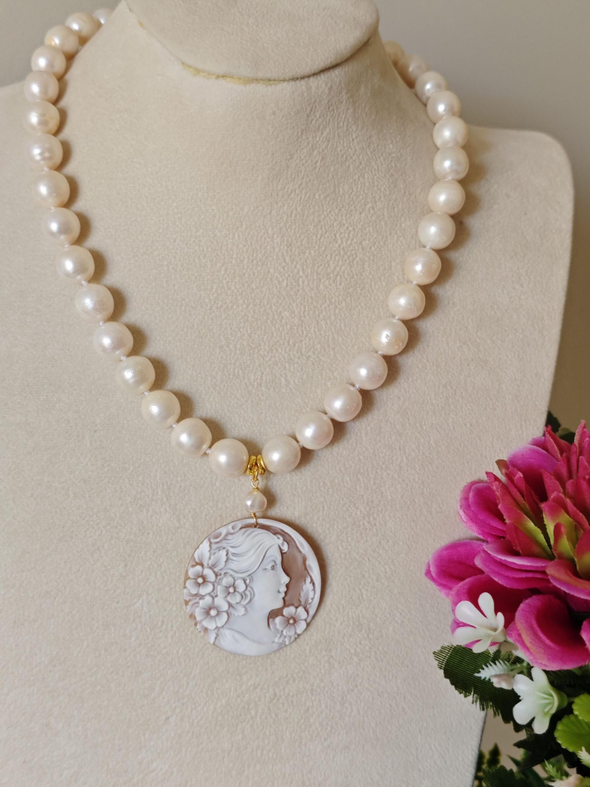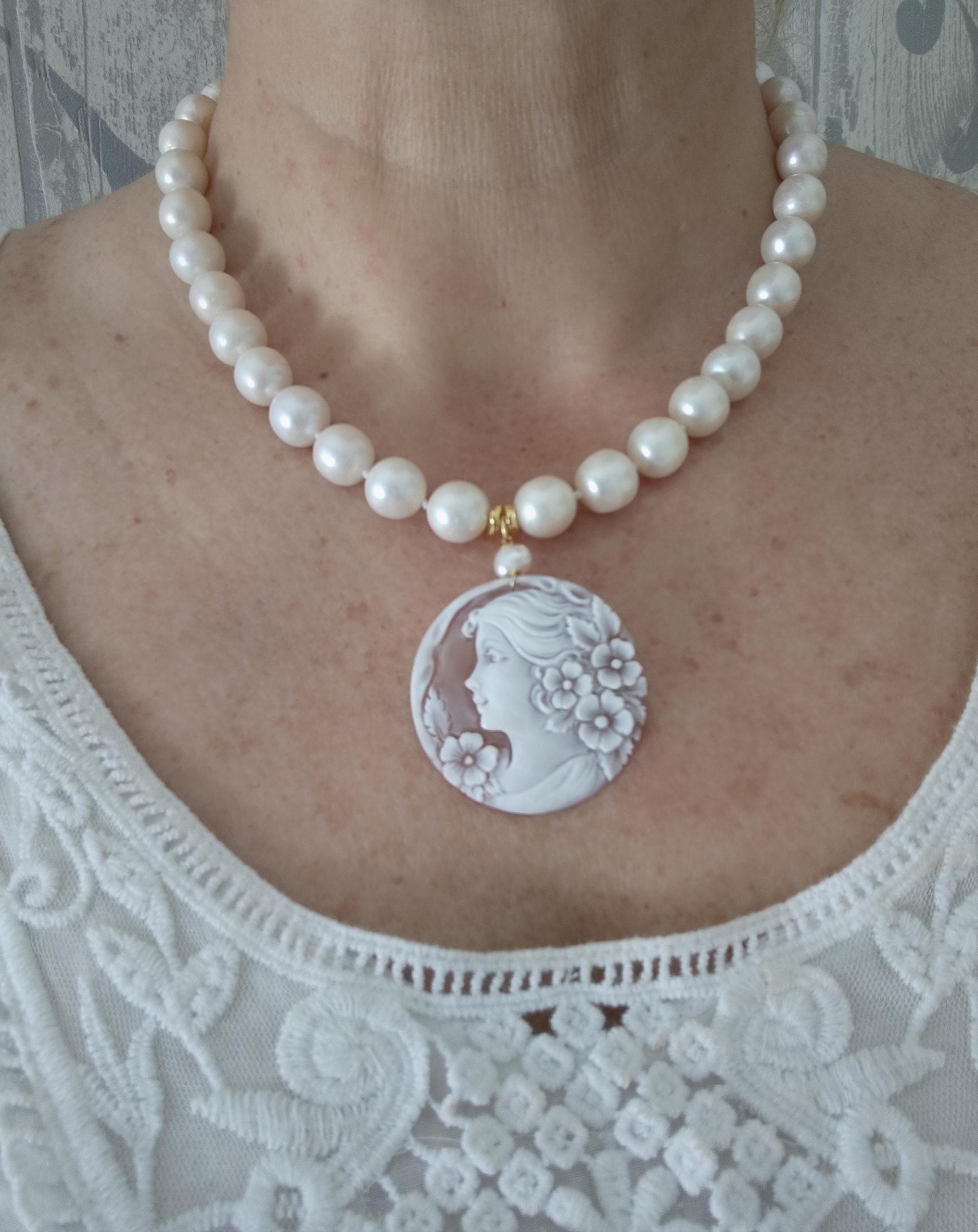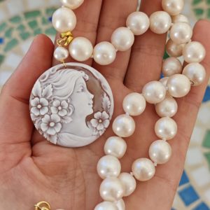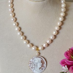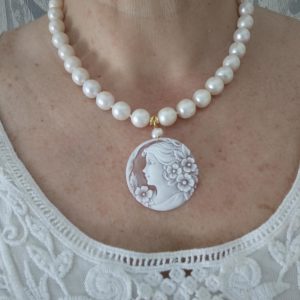 Collana cammeo conchiglia sardonica , collana perle bianche, gioielli italiani