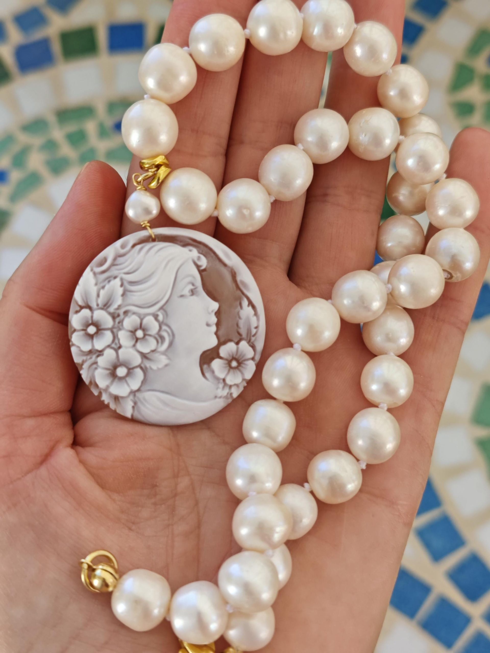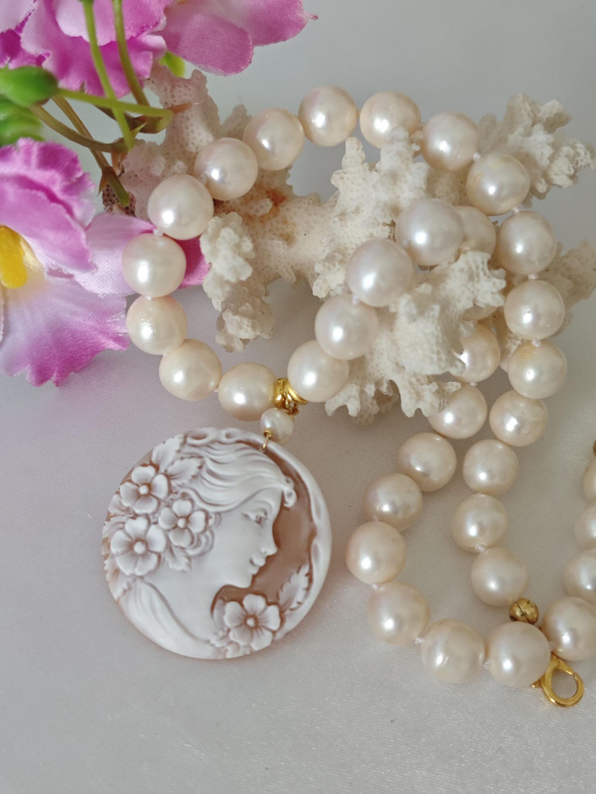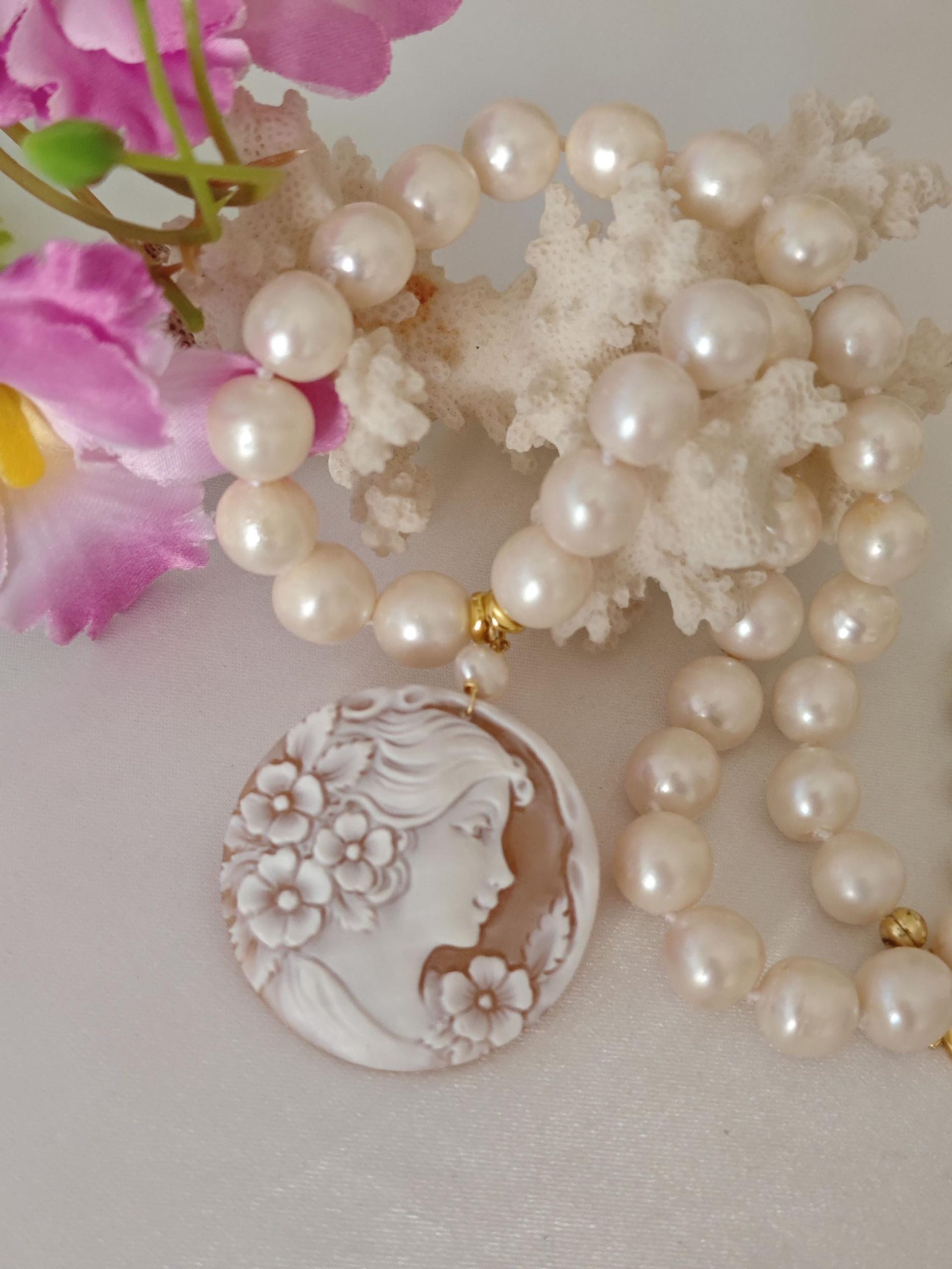 Collana cammeo conchiglia sardonica , collana perle bianche, gioielli italiani