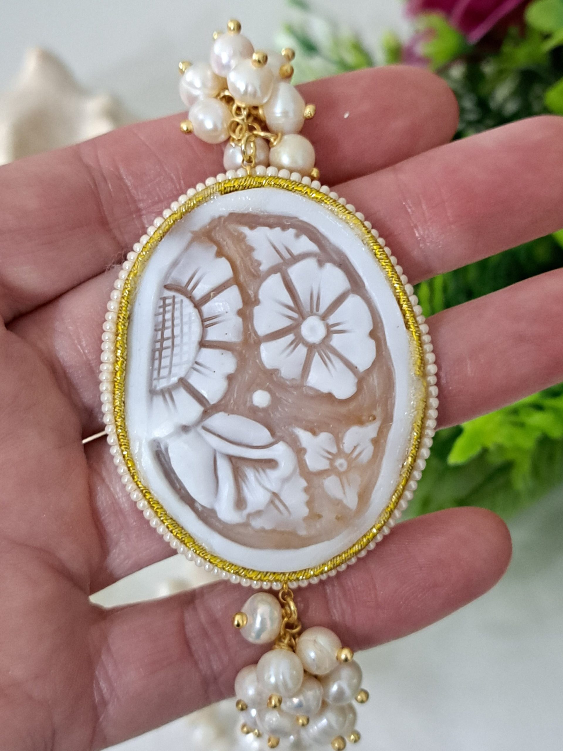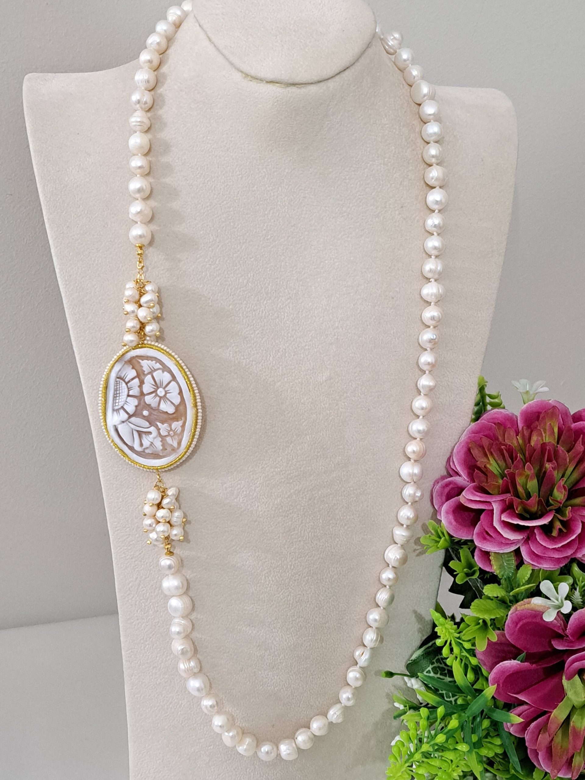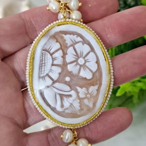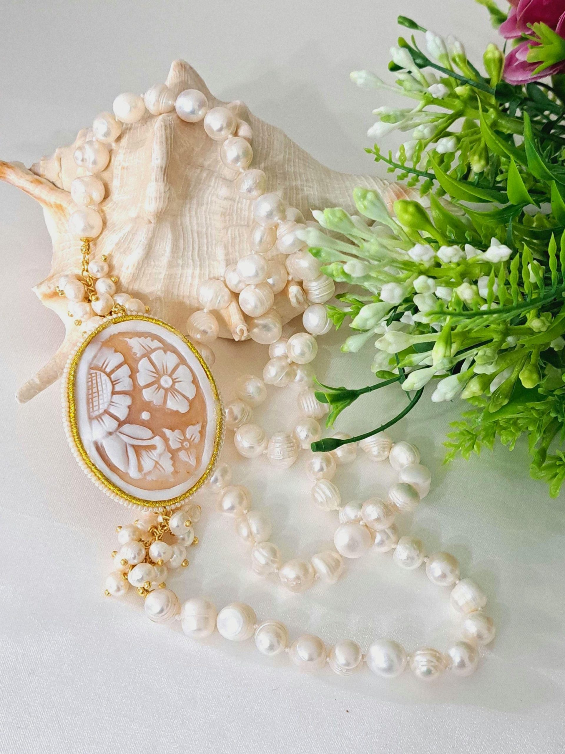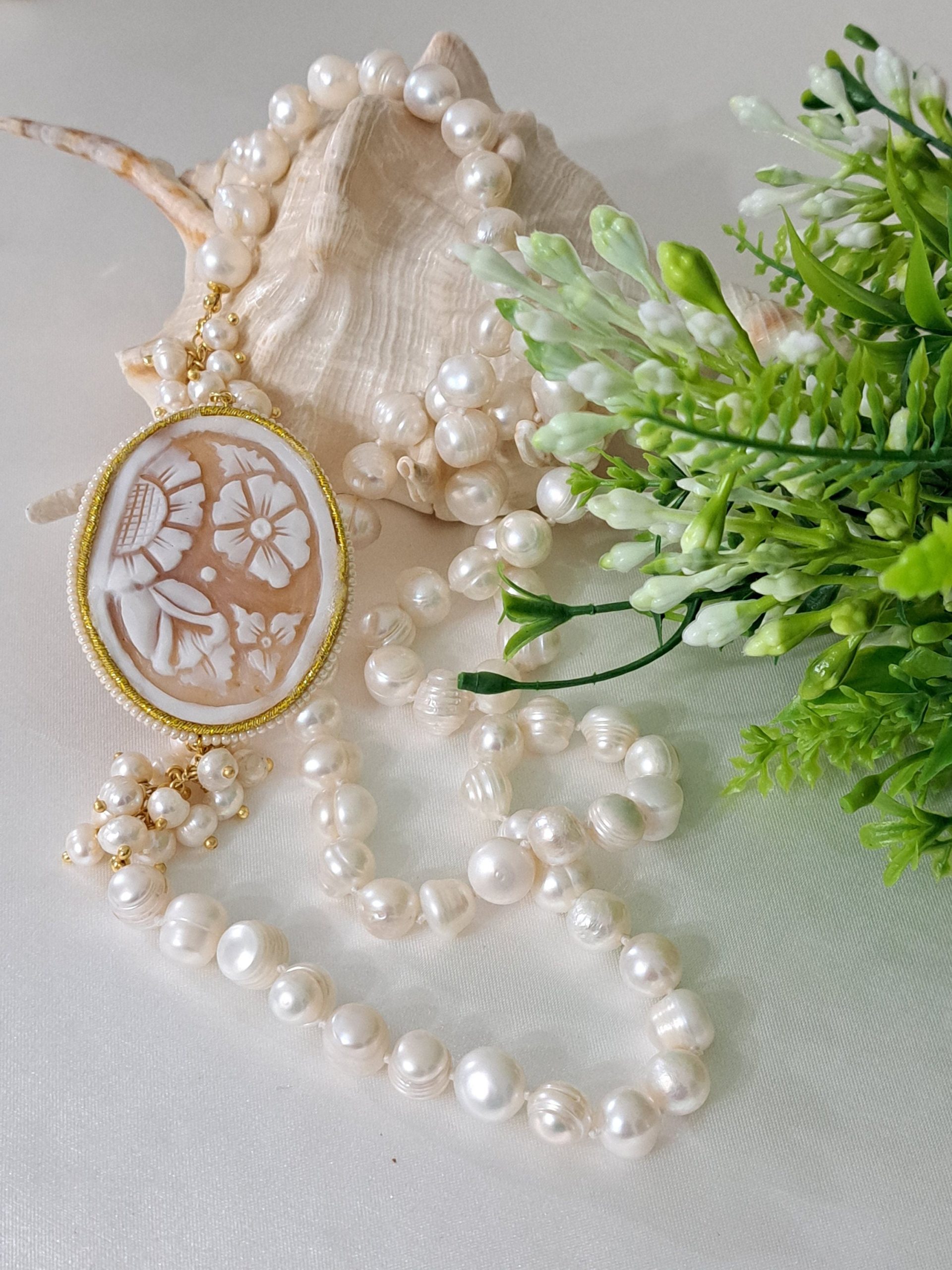 Collana con perle bianche naturali annodate a mano con cammeo autentico in conchiglia sardonica scolpita a mano a Torre del greco 5,5×4,3 cm dimensioni , raffigurante fiori ,con cornice perline bianche naturali.