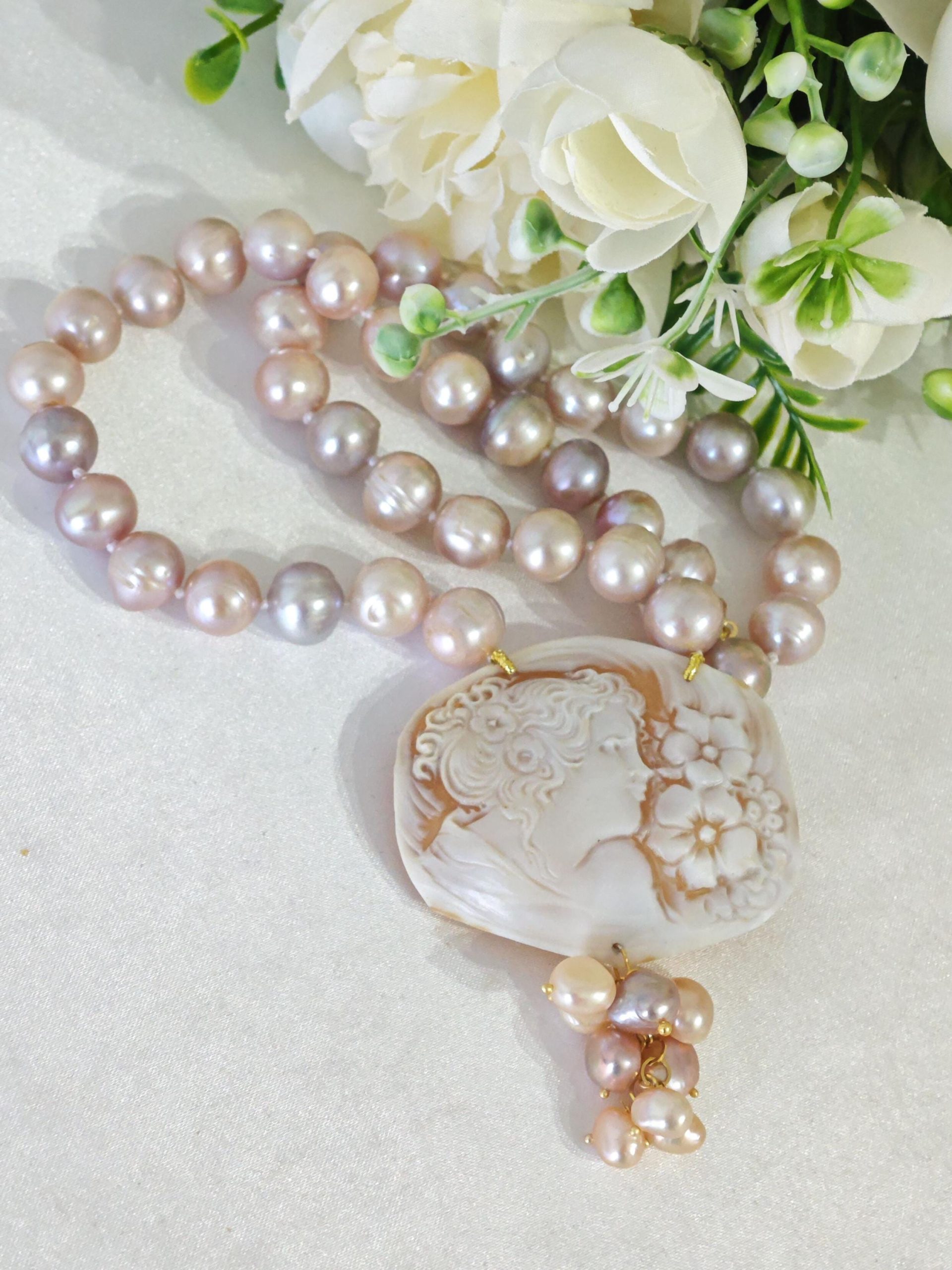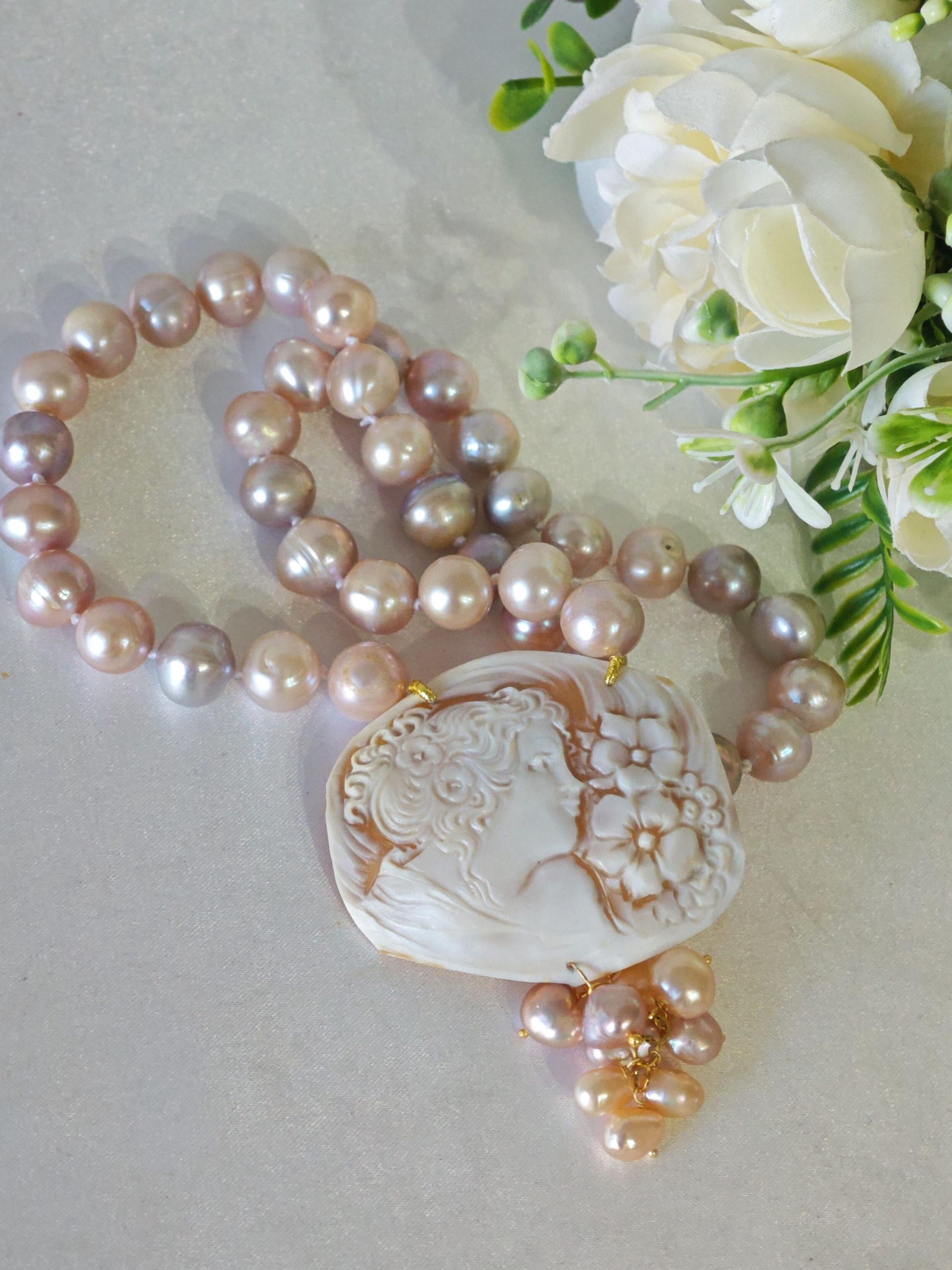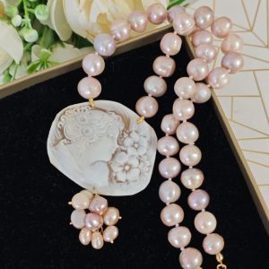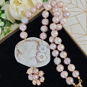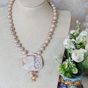 Collana girocollo annodata a mano con perle naturali rosa/malva 10/11 mm e pendente cammeo autentico in conchiglia sardonica scolpita a mano a Torre del greco 5,5×4,5 cm dimensioni raffigurante volto di donna con grappolo perline naturali rosa.