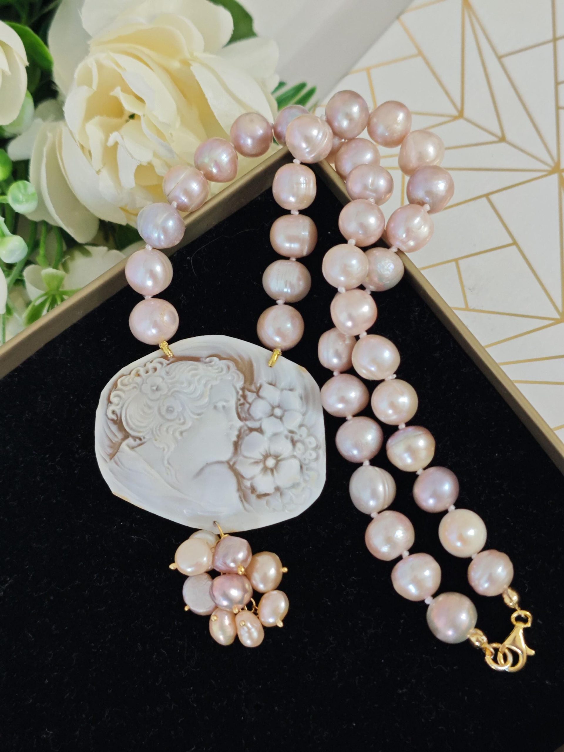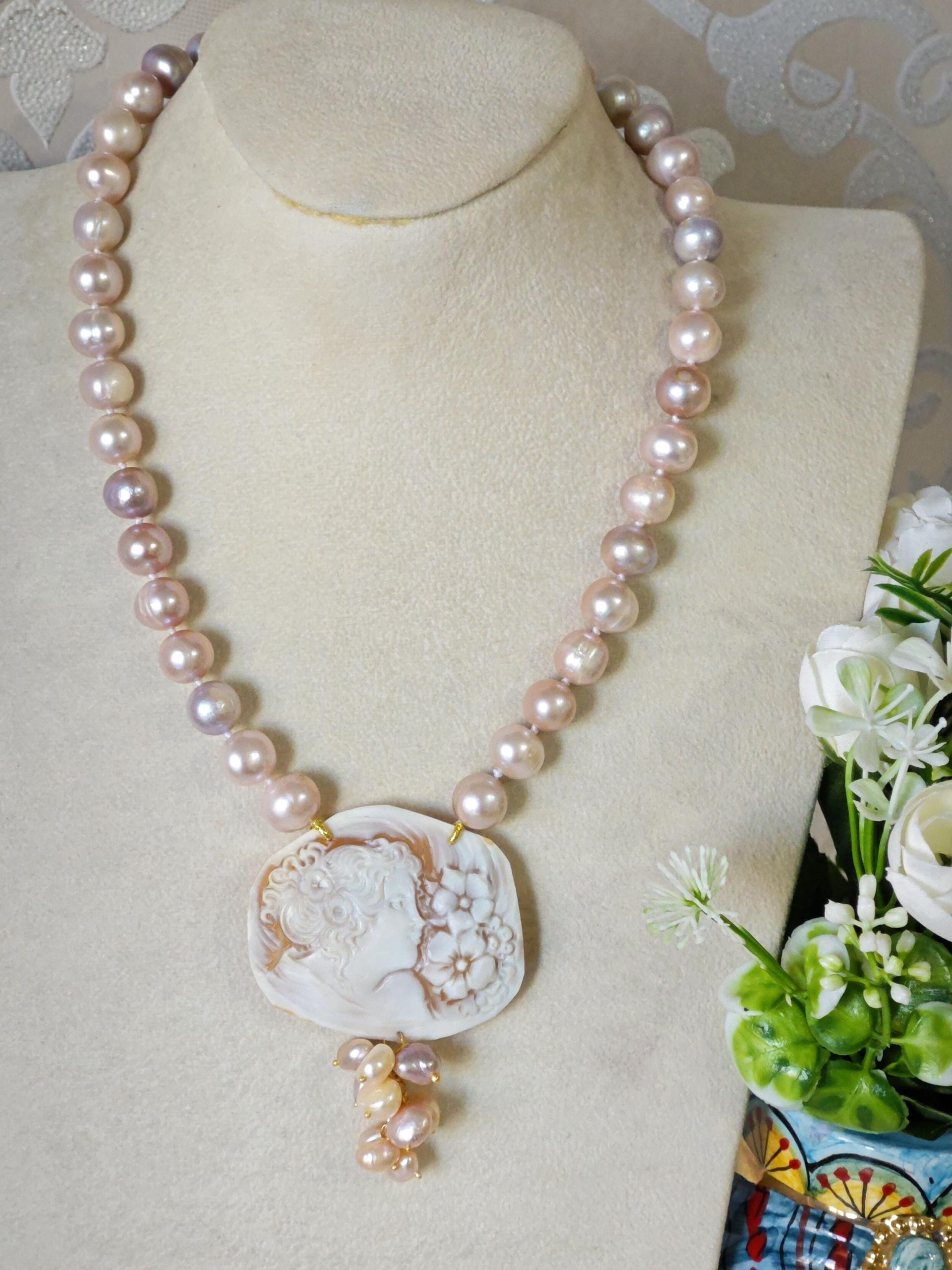 Collana cammeo conchiglia sardonica , collana perle rosa , gioielli italiani