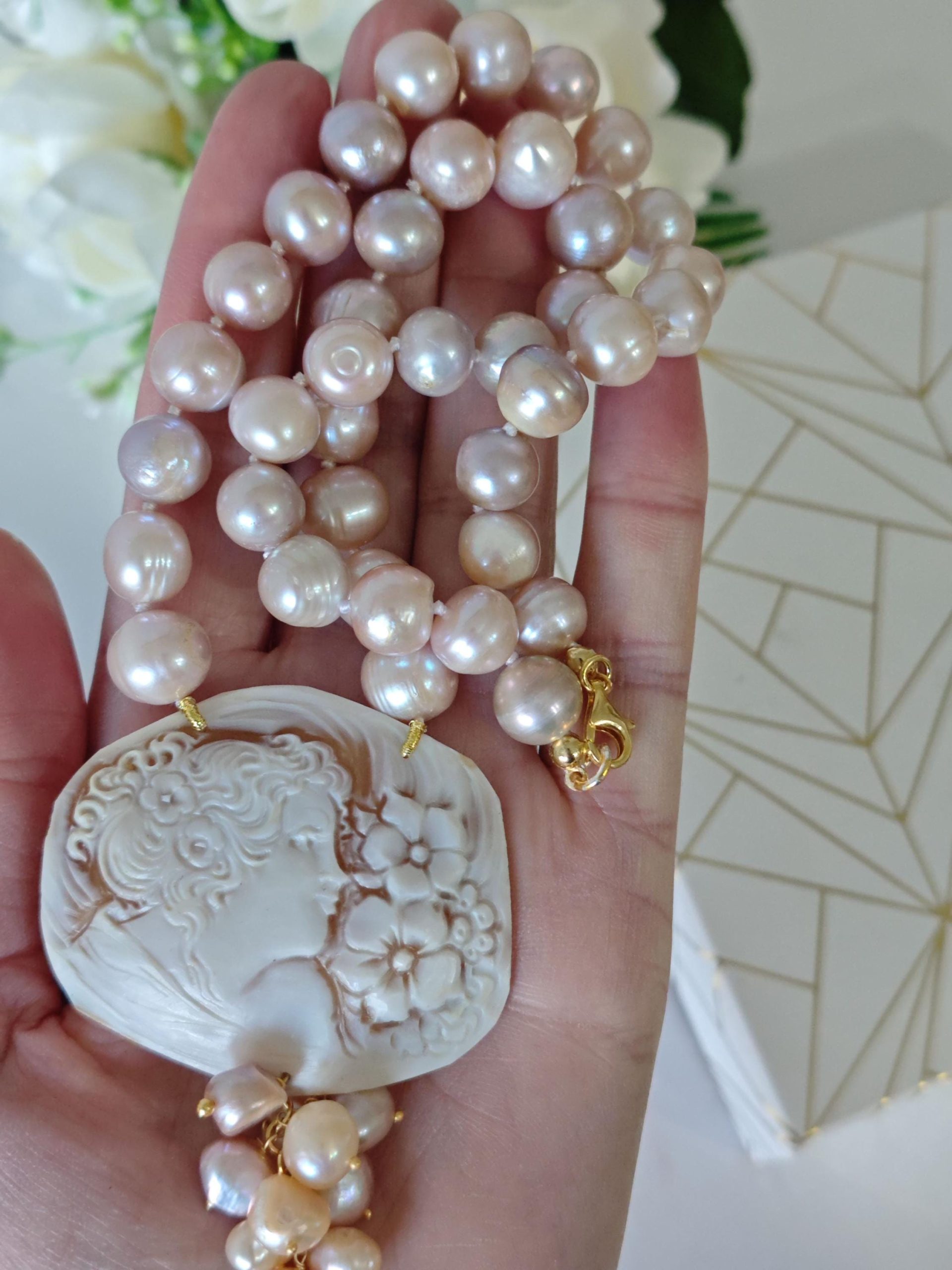 Collana cammeo conchiglia, collana perle barocche bianche, gioielli italiani, cammeo necklace