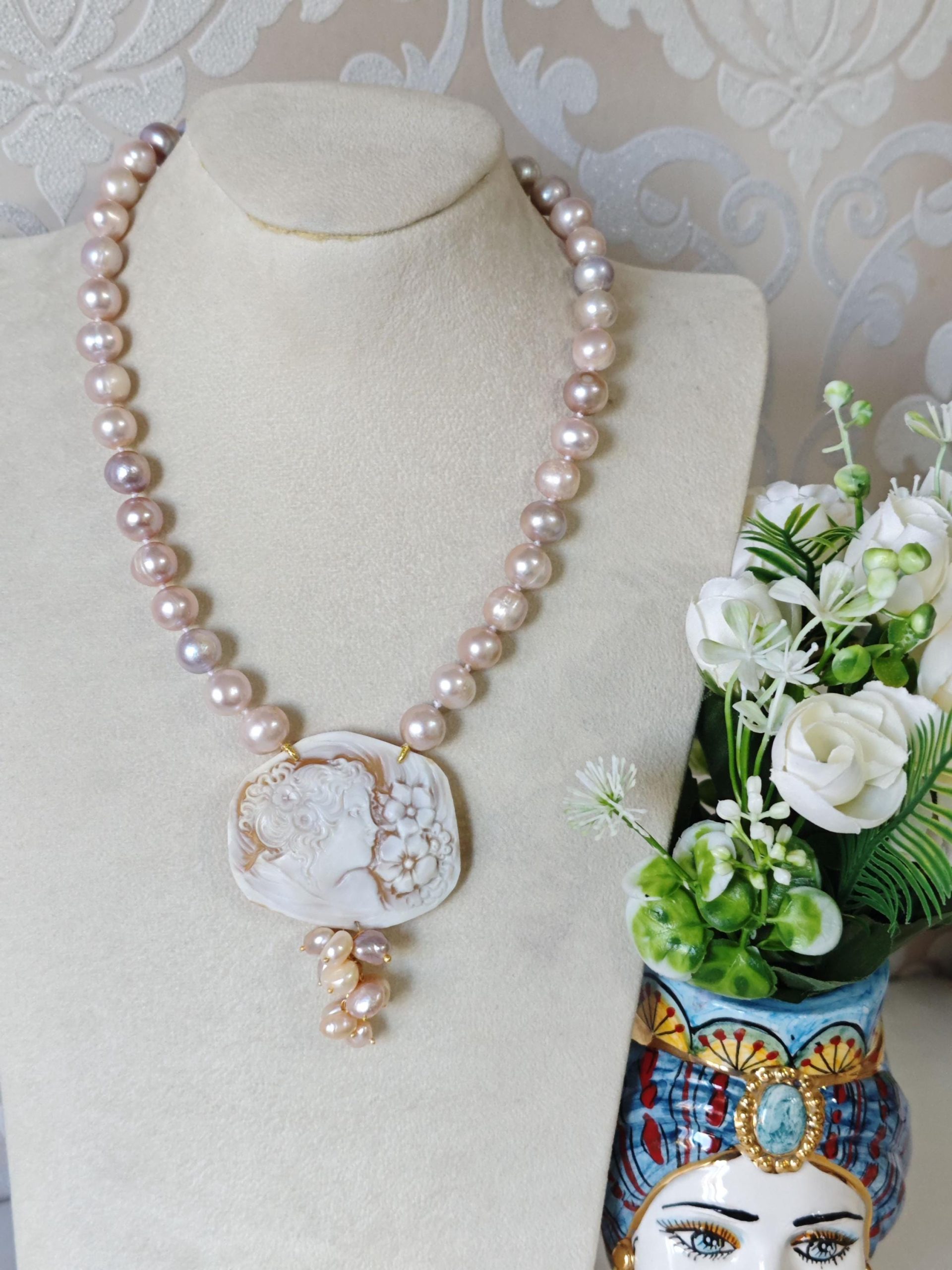Collana cammeo conchiglia sardonica con fiori ceramica di Caltagirone e perle bianche barocche , gioielli italiani