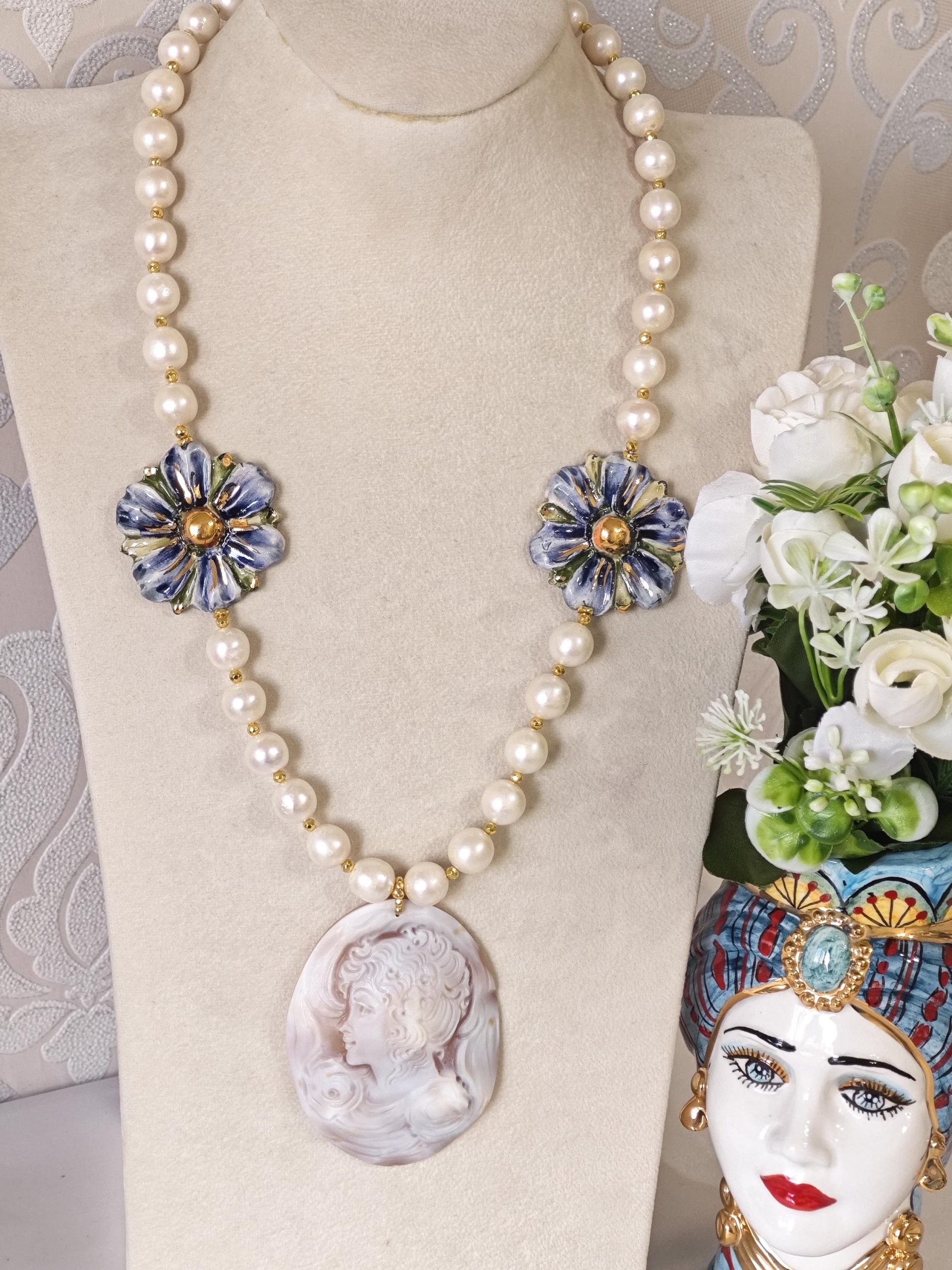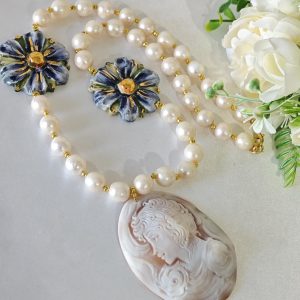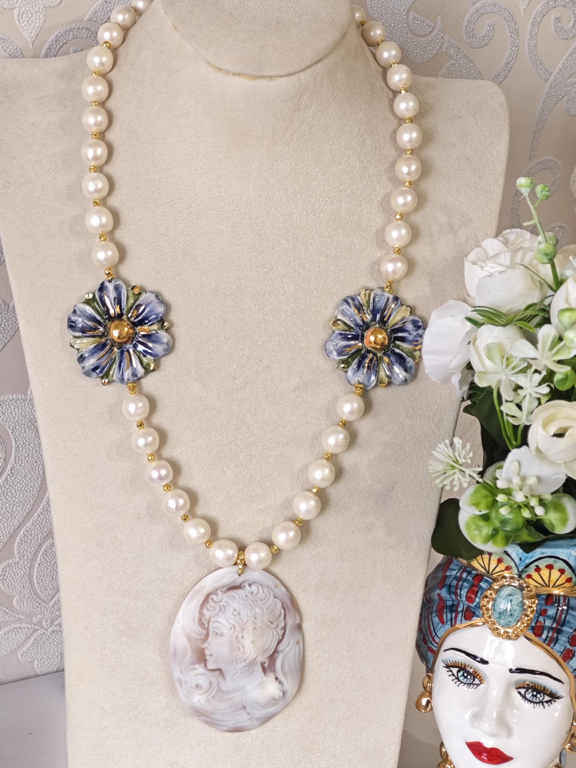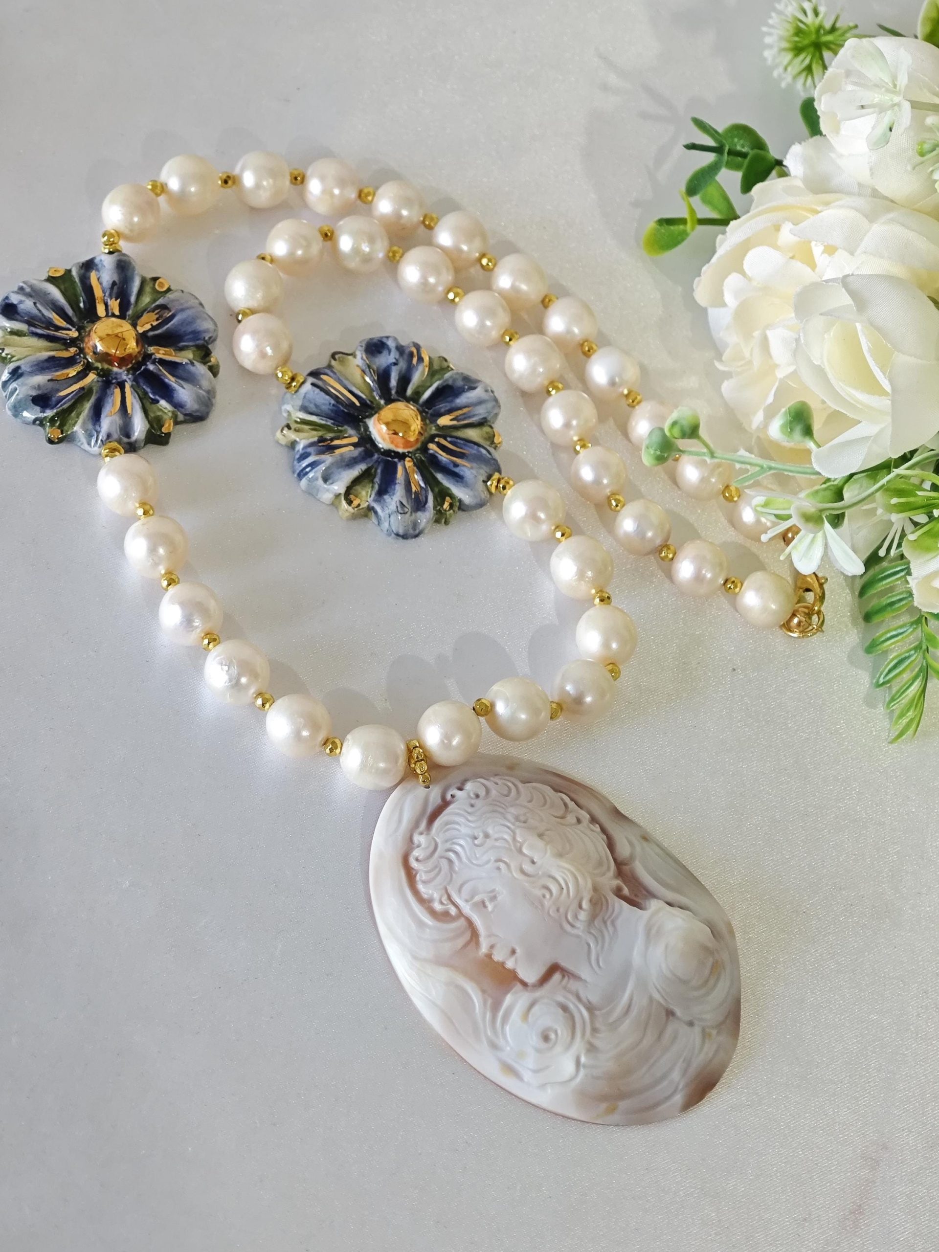 Collana cammeo conchiglia sardonica con fiori ceramica di Caltagirone e perle bianche barocche , gioielli italiani