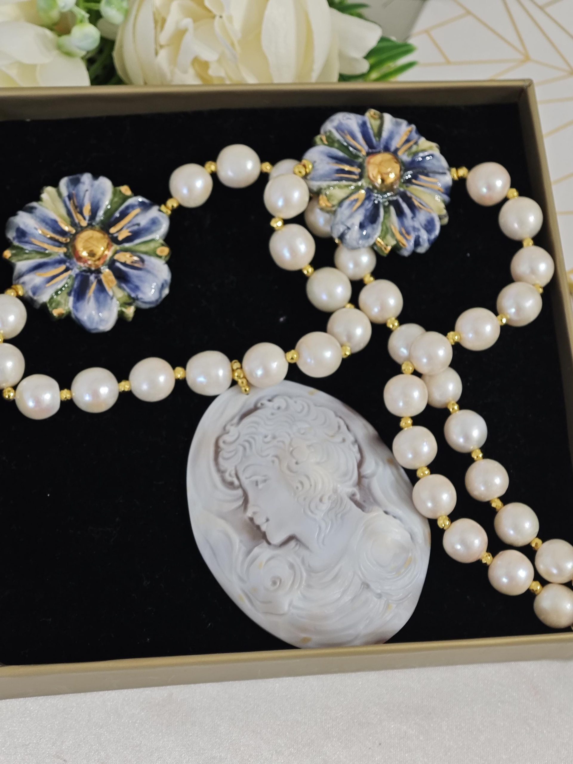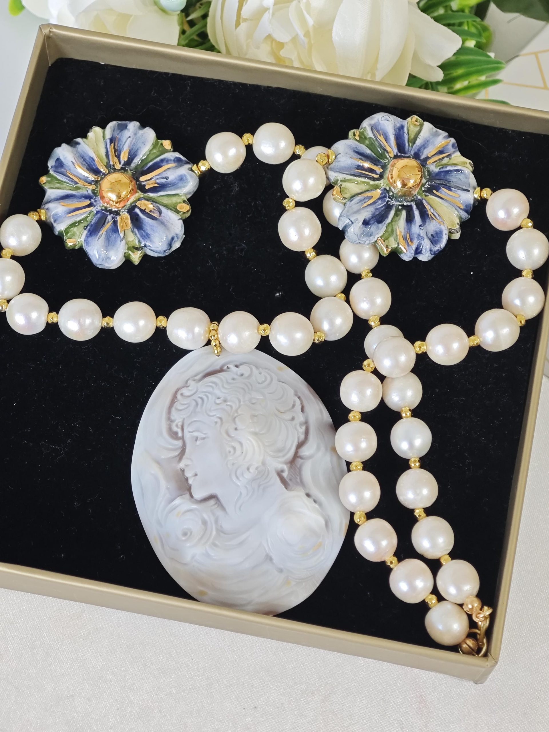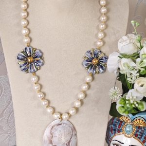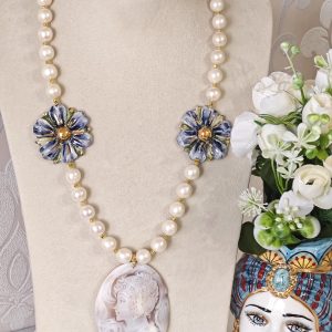 Collana cammeo conchiglia sardonica con fiori ceramica di Caltagirone e perle bianche barocche , gioielli italiani