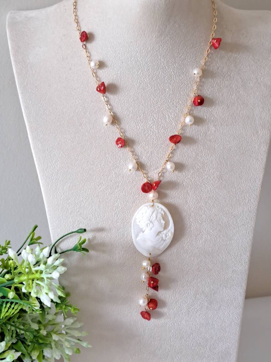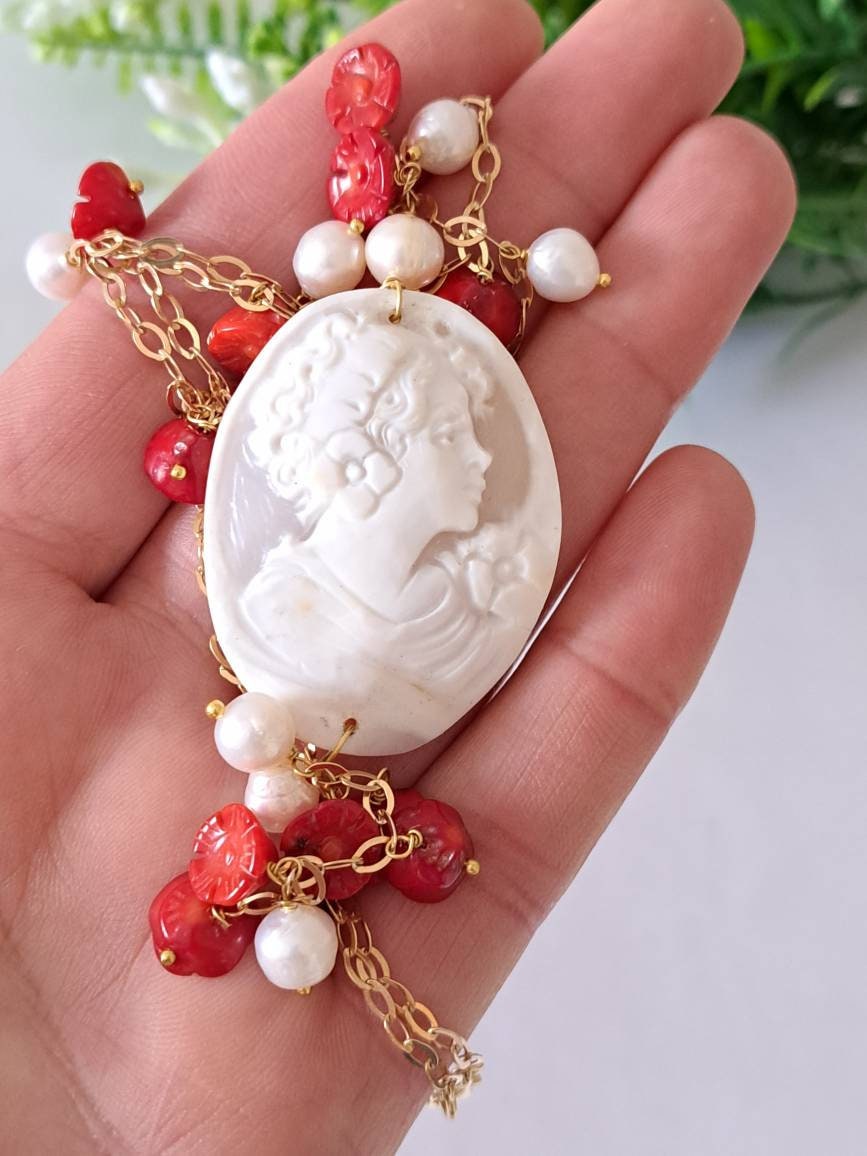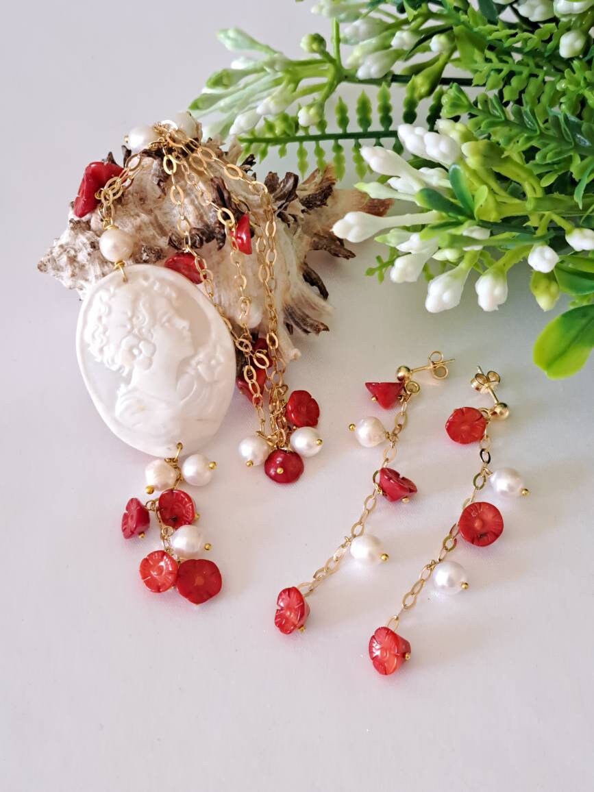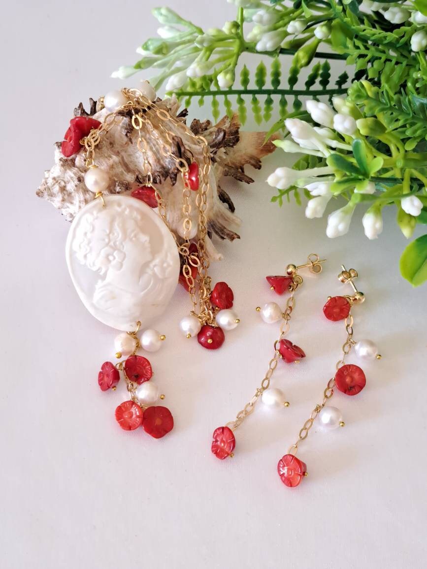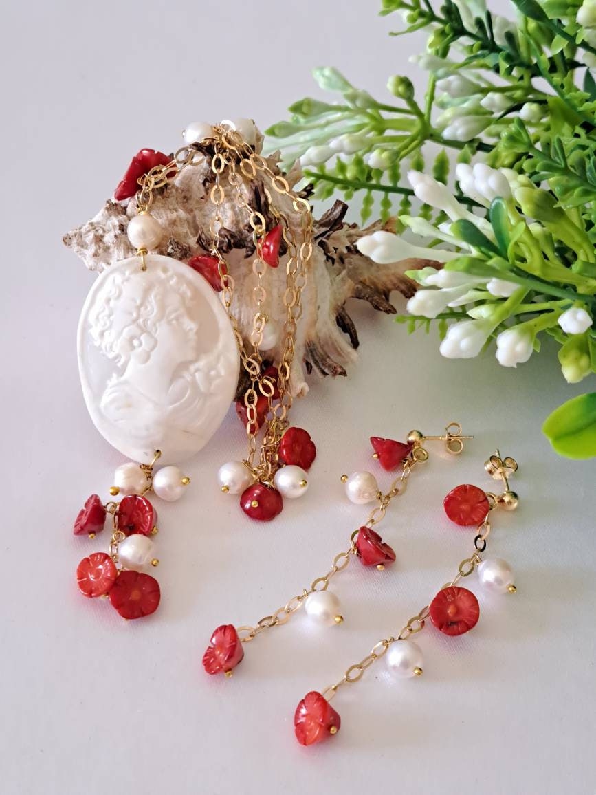 Collana cammeo conchiglia sardonica con perle barocche bianche e fiori corallo rosso e argento 925 placcato oro, collana con orecchini