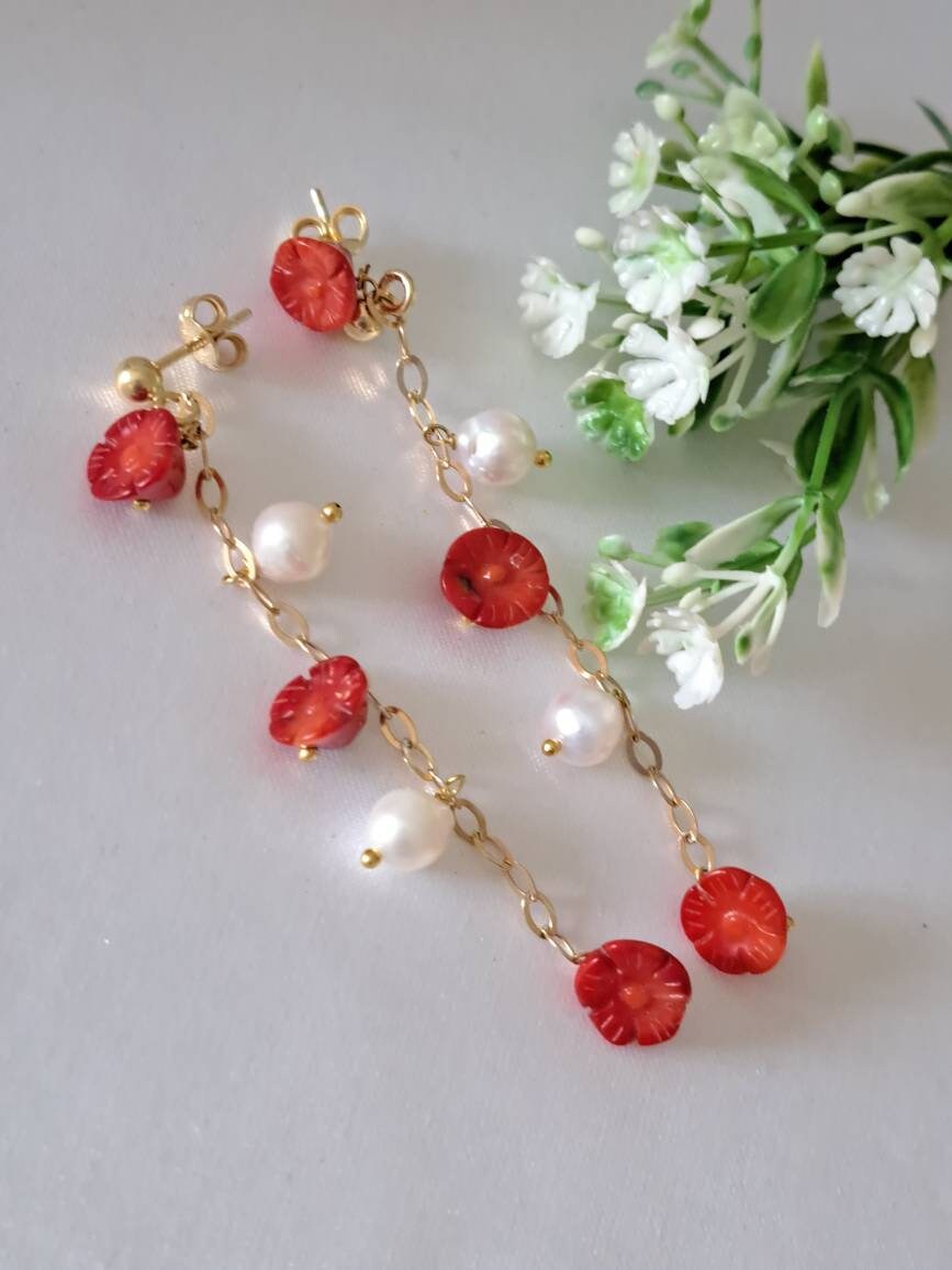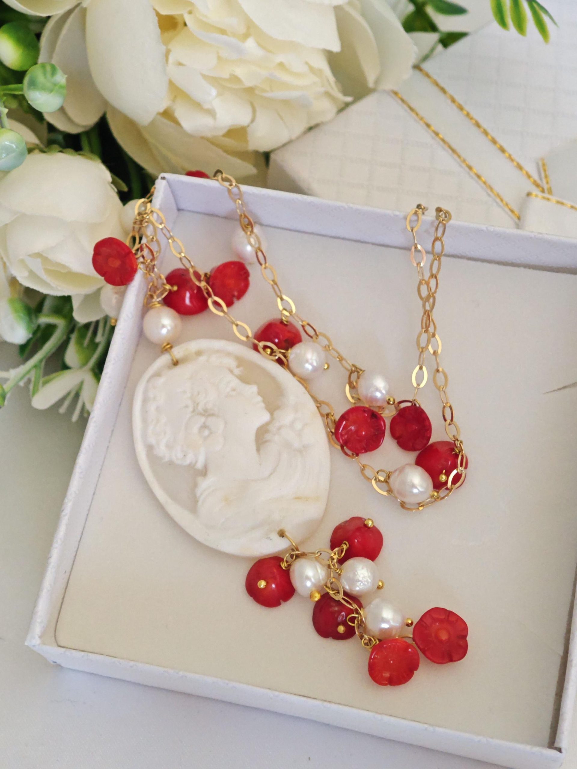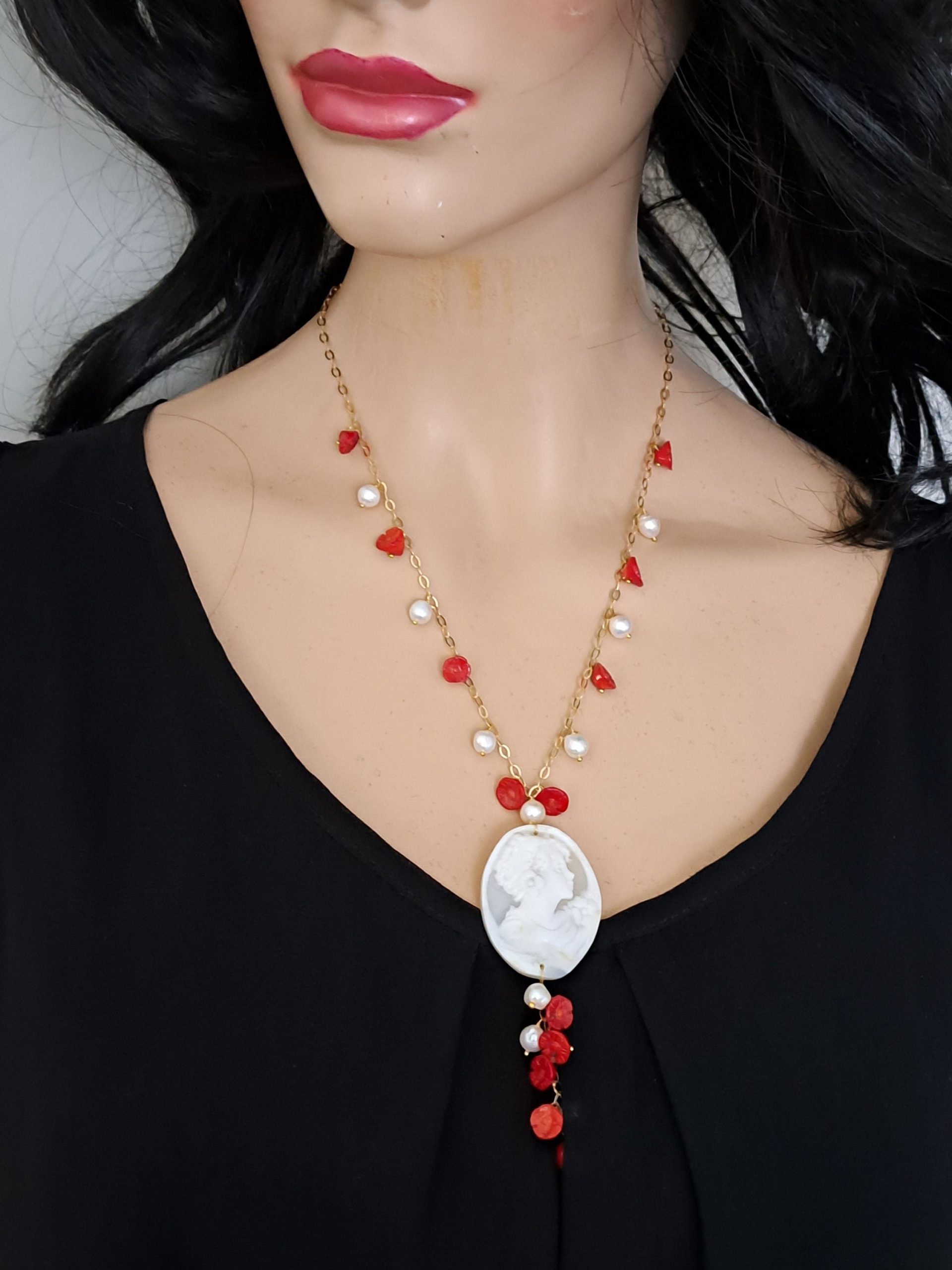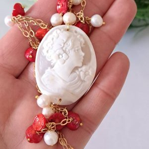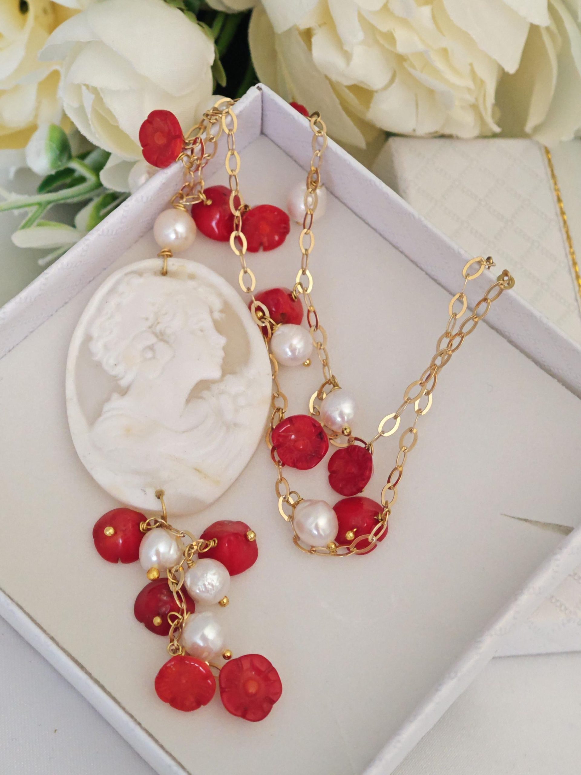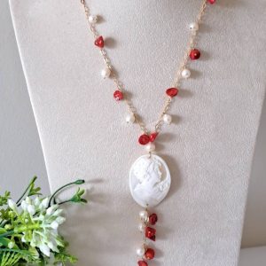 Collana realizzata a mano con catena argento 925 placcato oro, perle barocche bianche piccole e fiori corallo rosso bambù e camme oconchiglia sardonica scolpito a mano a Torre del greco, 4×3,2 cm dimensioni.
