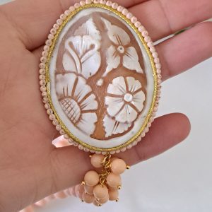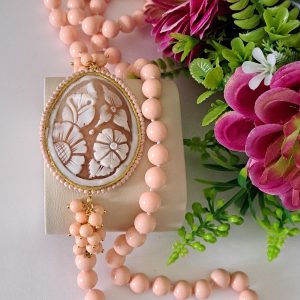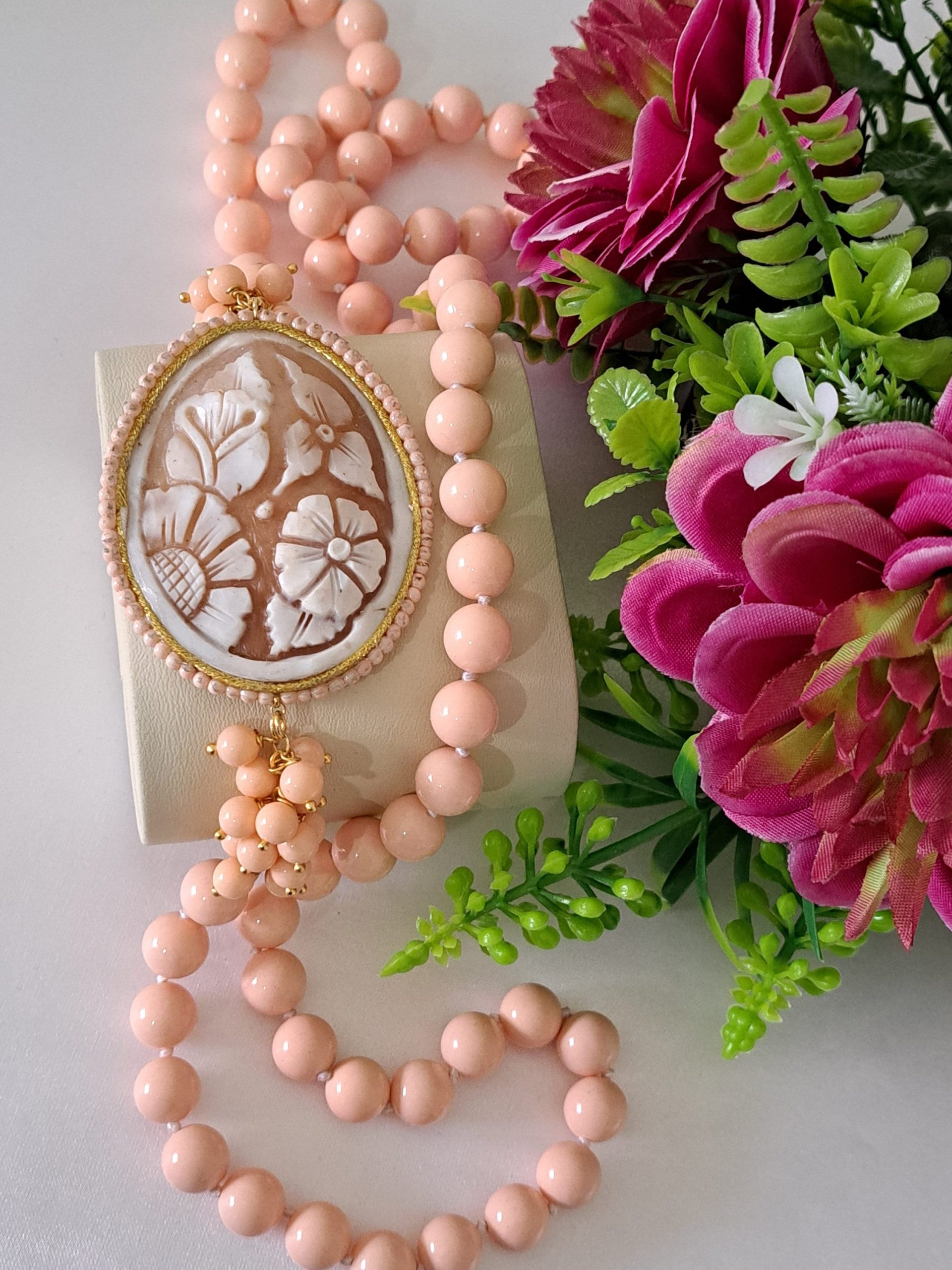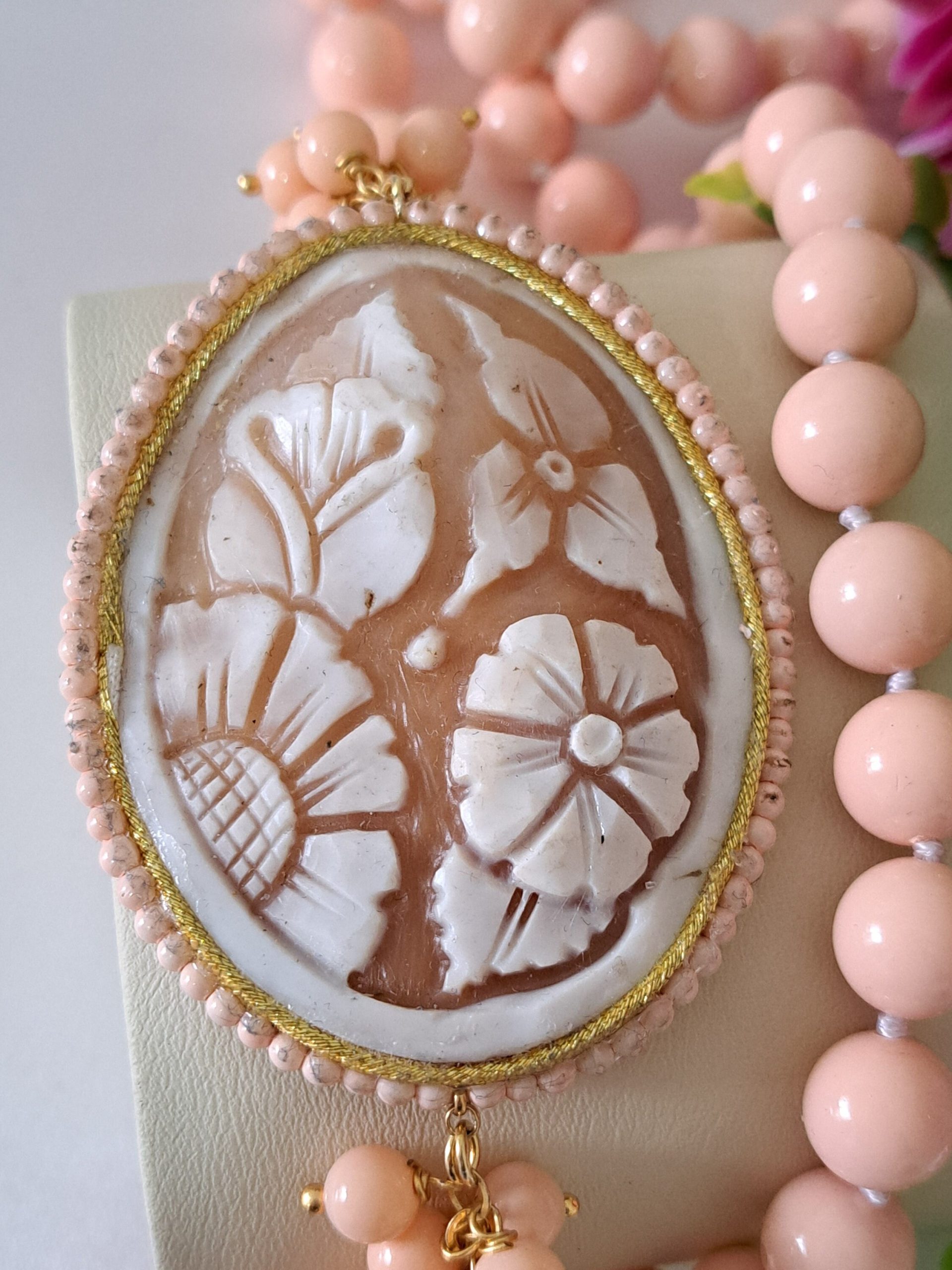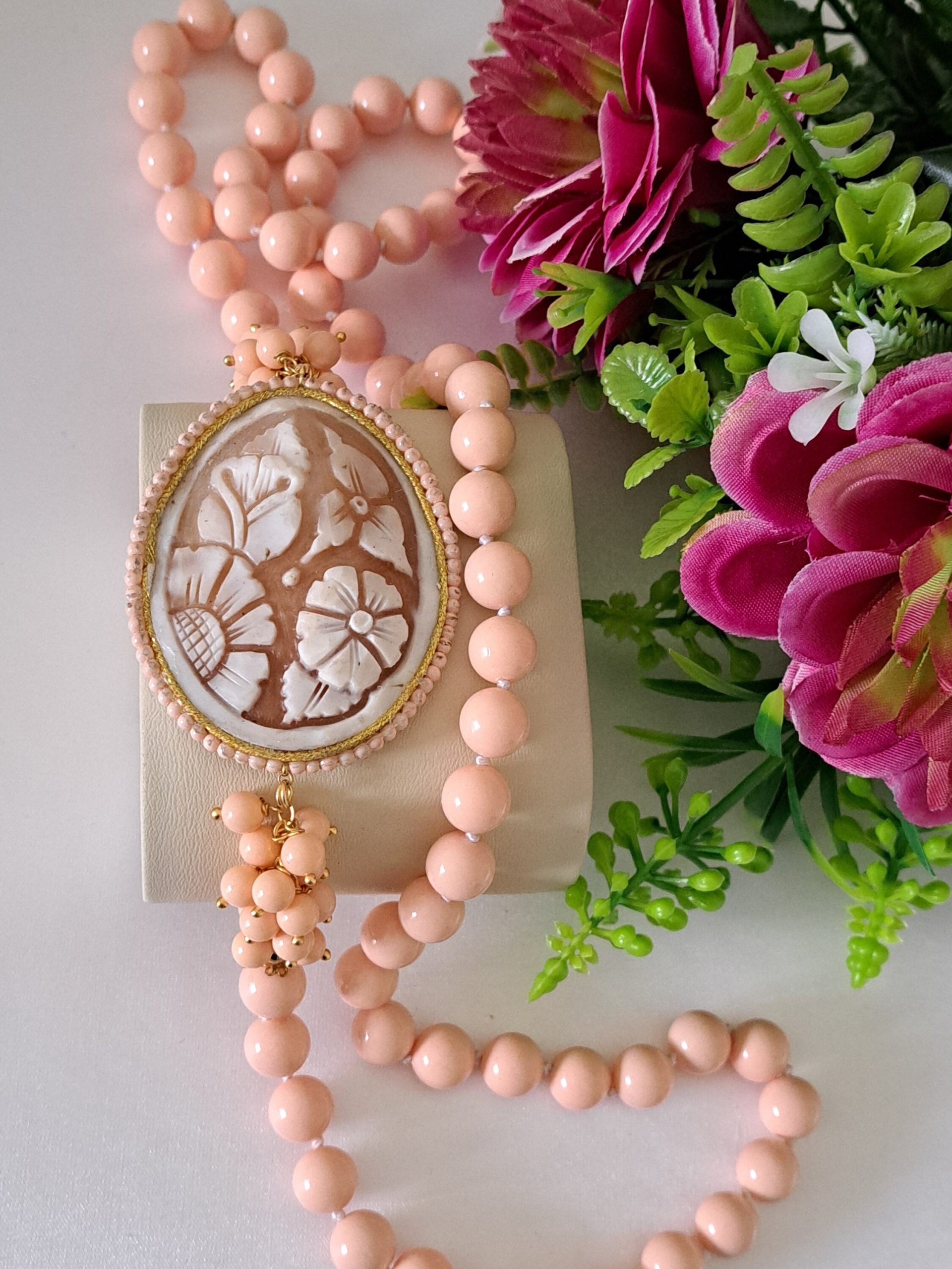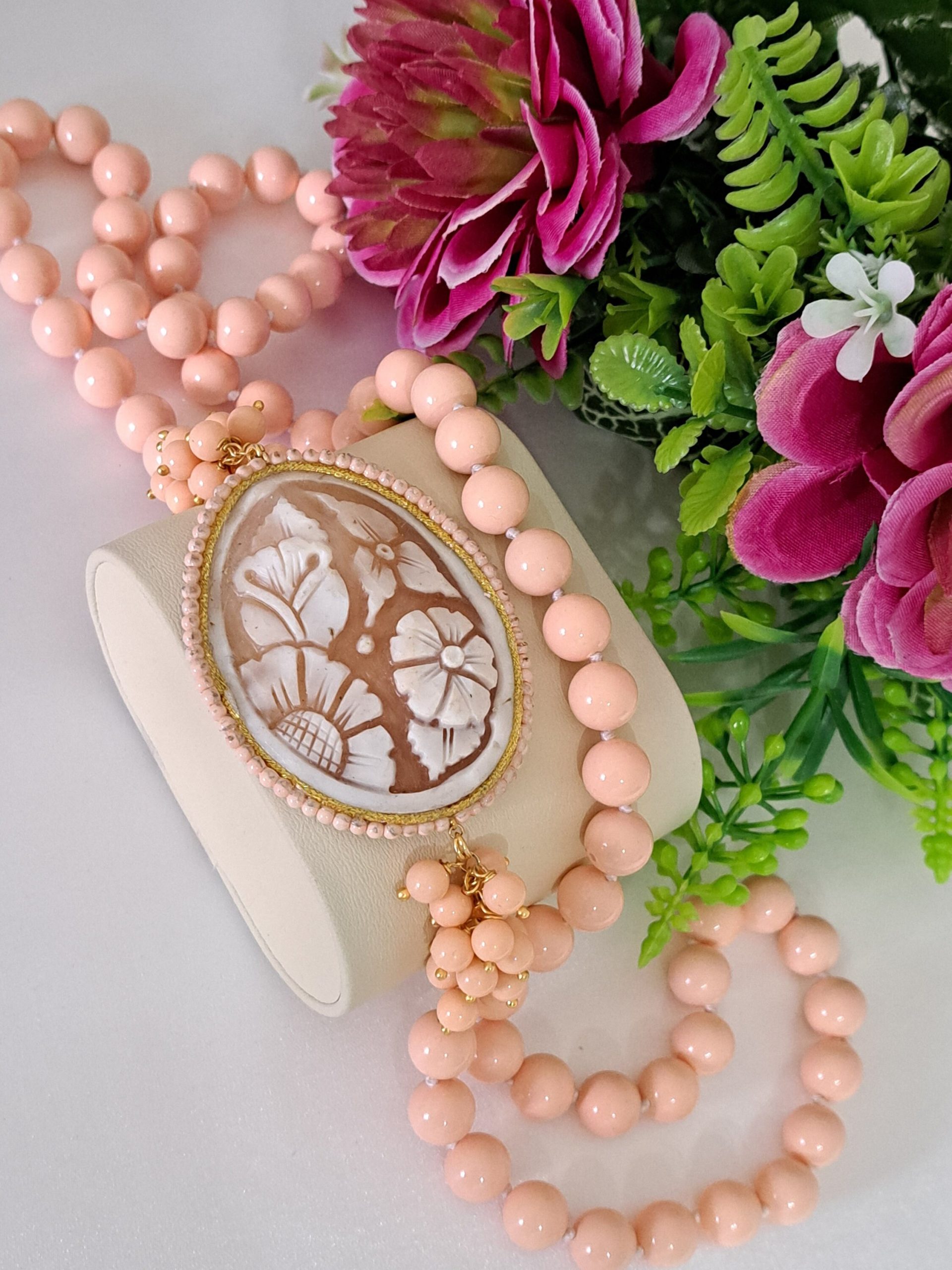 Collana annodata a mano con perle pasta di corallo rosa imitazione 12 mm e con cammeo autentico in conchiglia sardonica scolpito a mano a Torre del greco raffigurante fiori 5×4 cm dimensioni con cornice e grappoli laterali in perle pasta di corallo rosa imitazione.