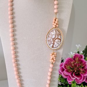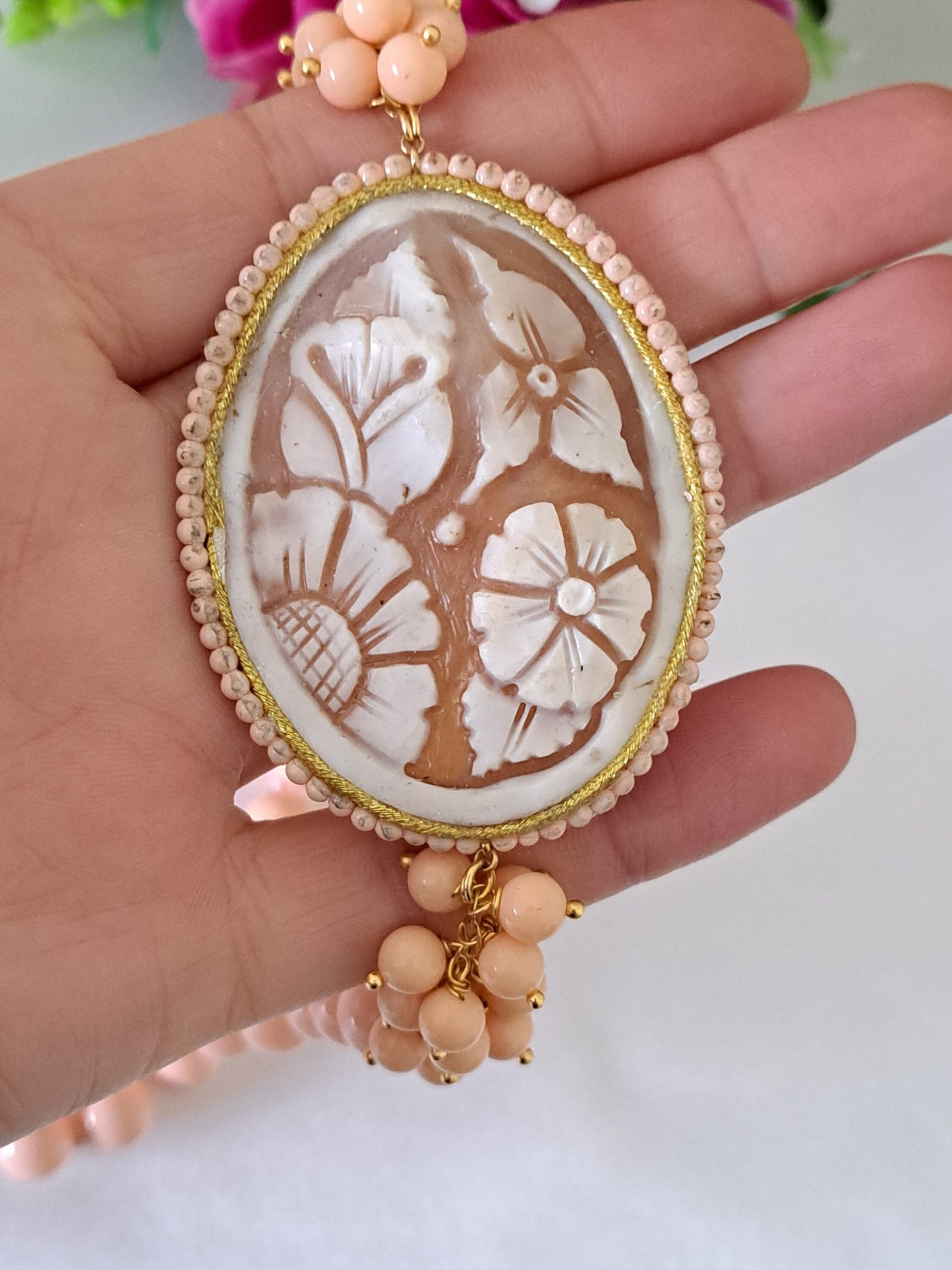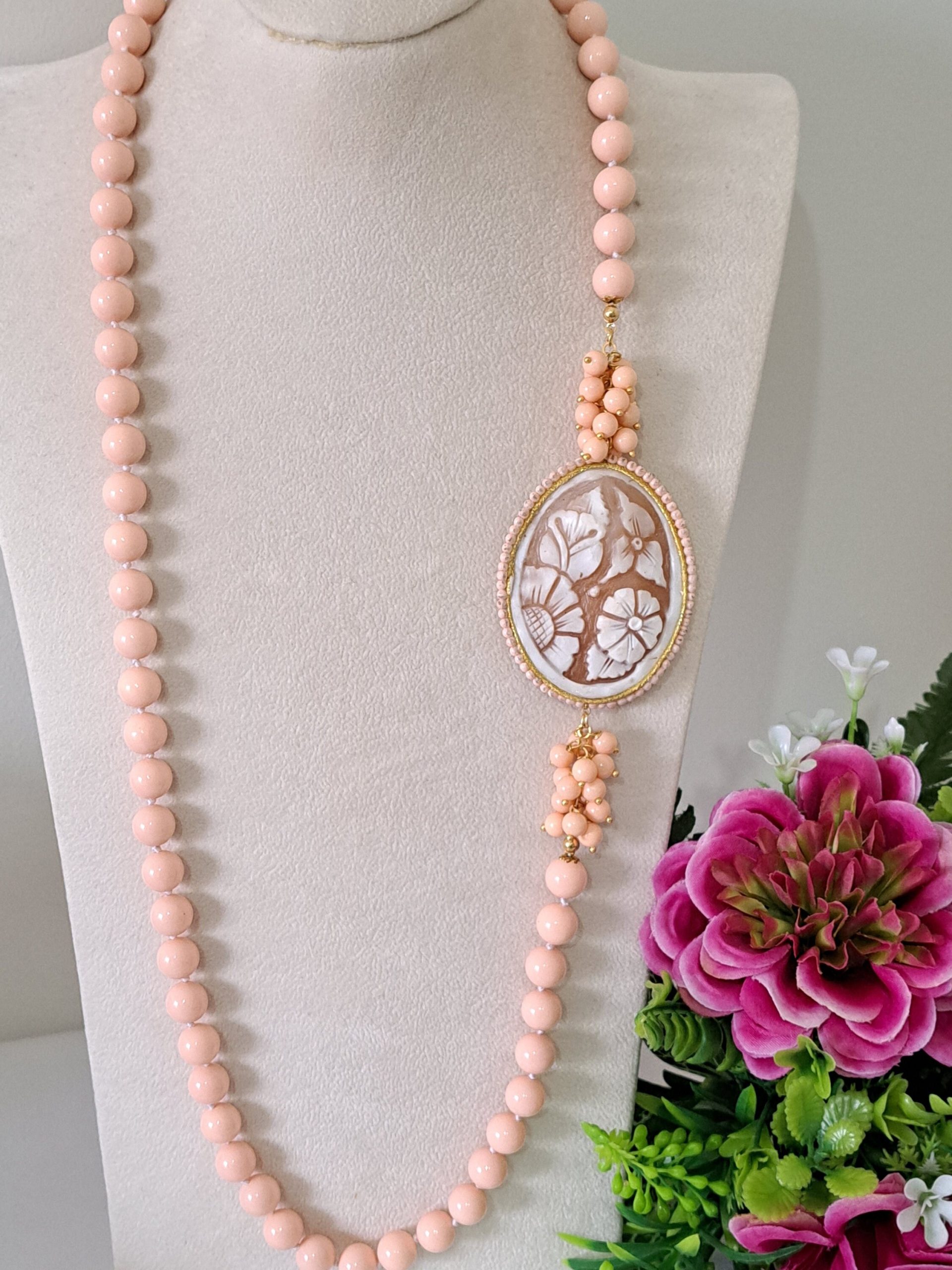 Collana cammeo conchiglia sardonica con perle pasta di corallo rosa , gioielli italiani