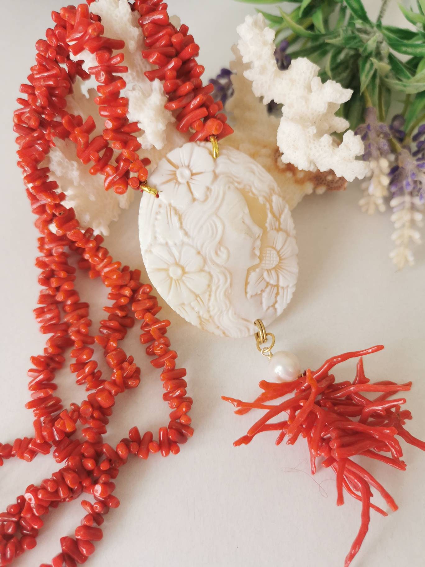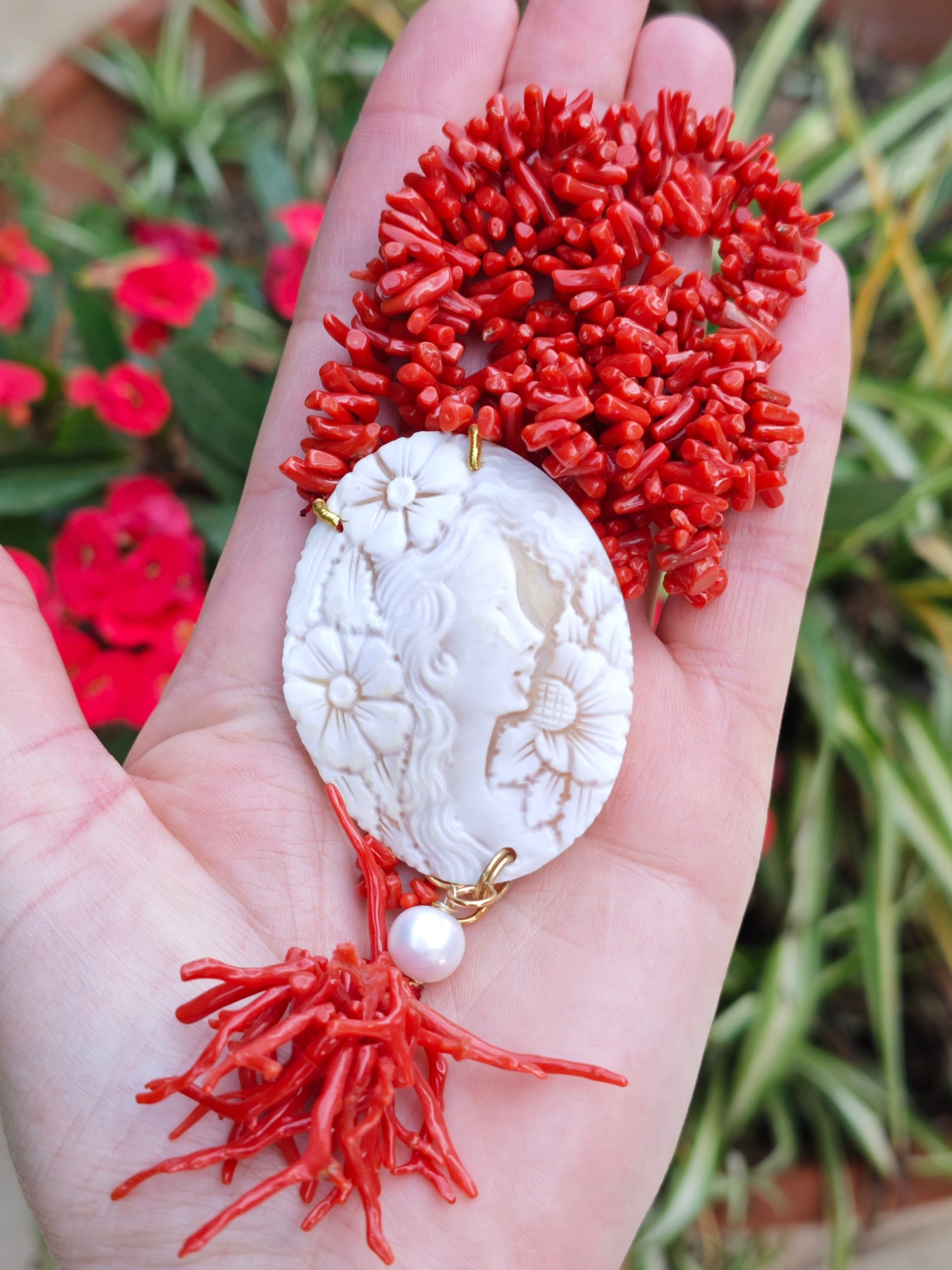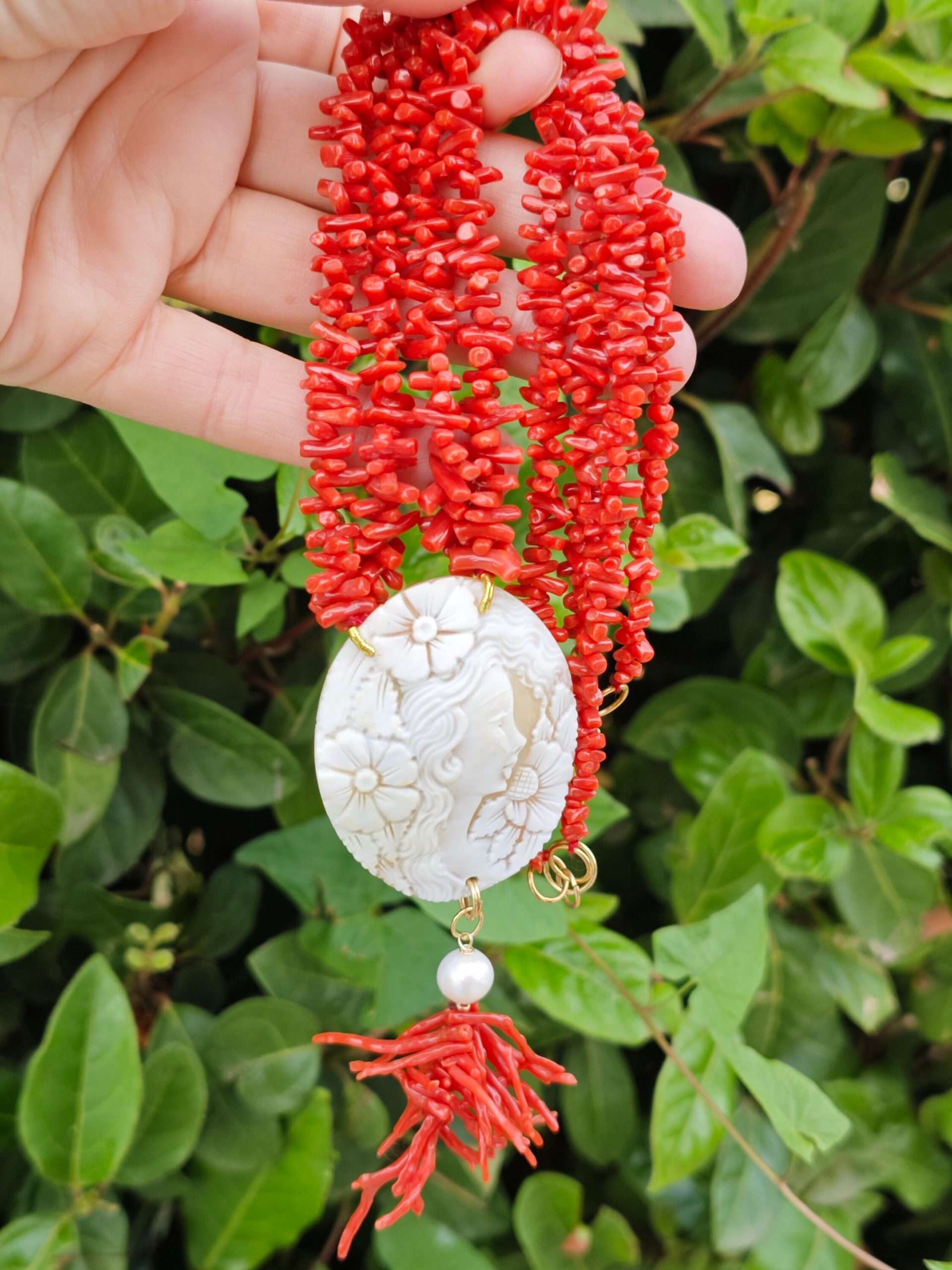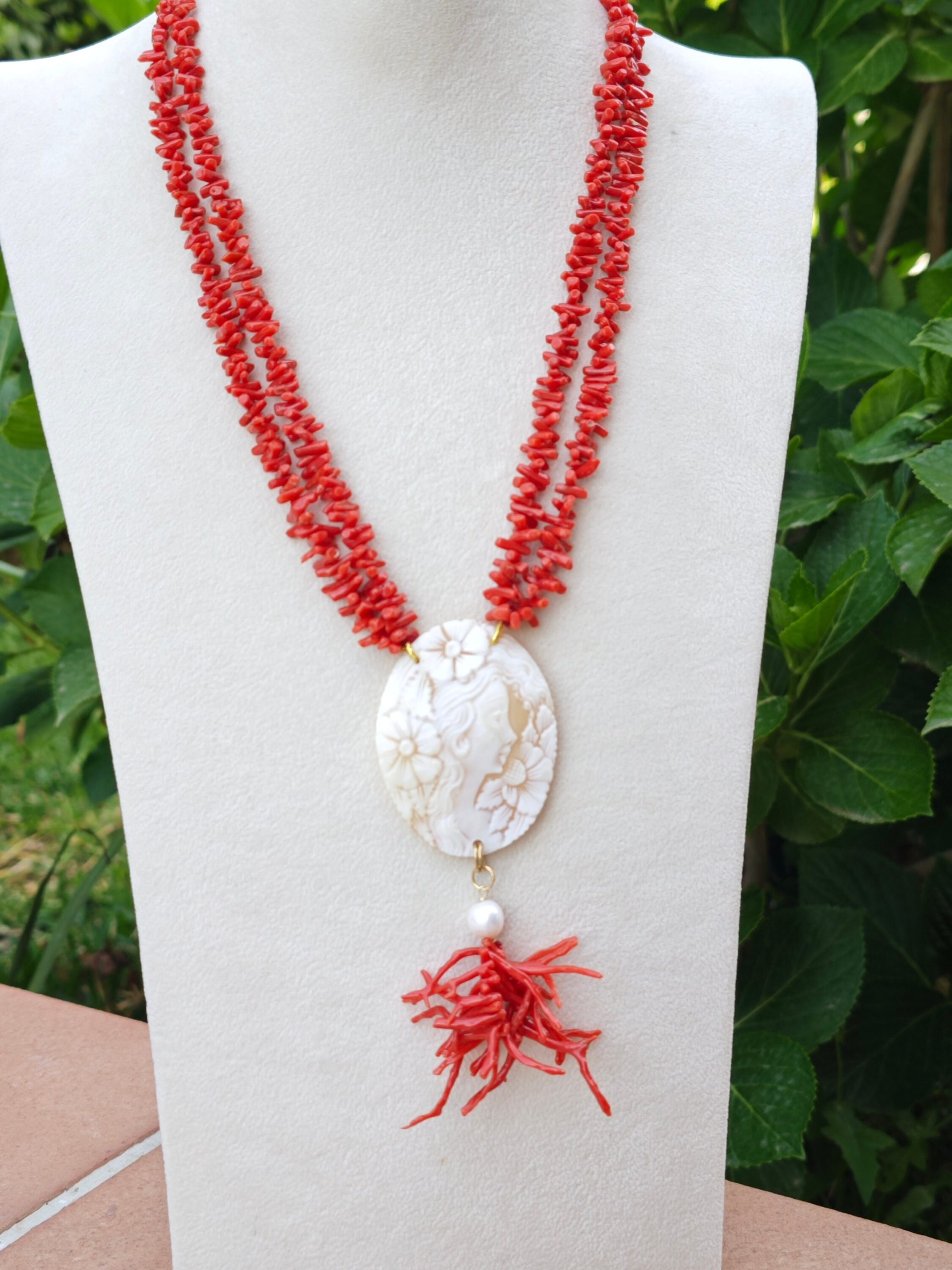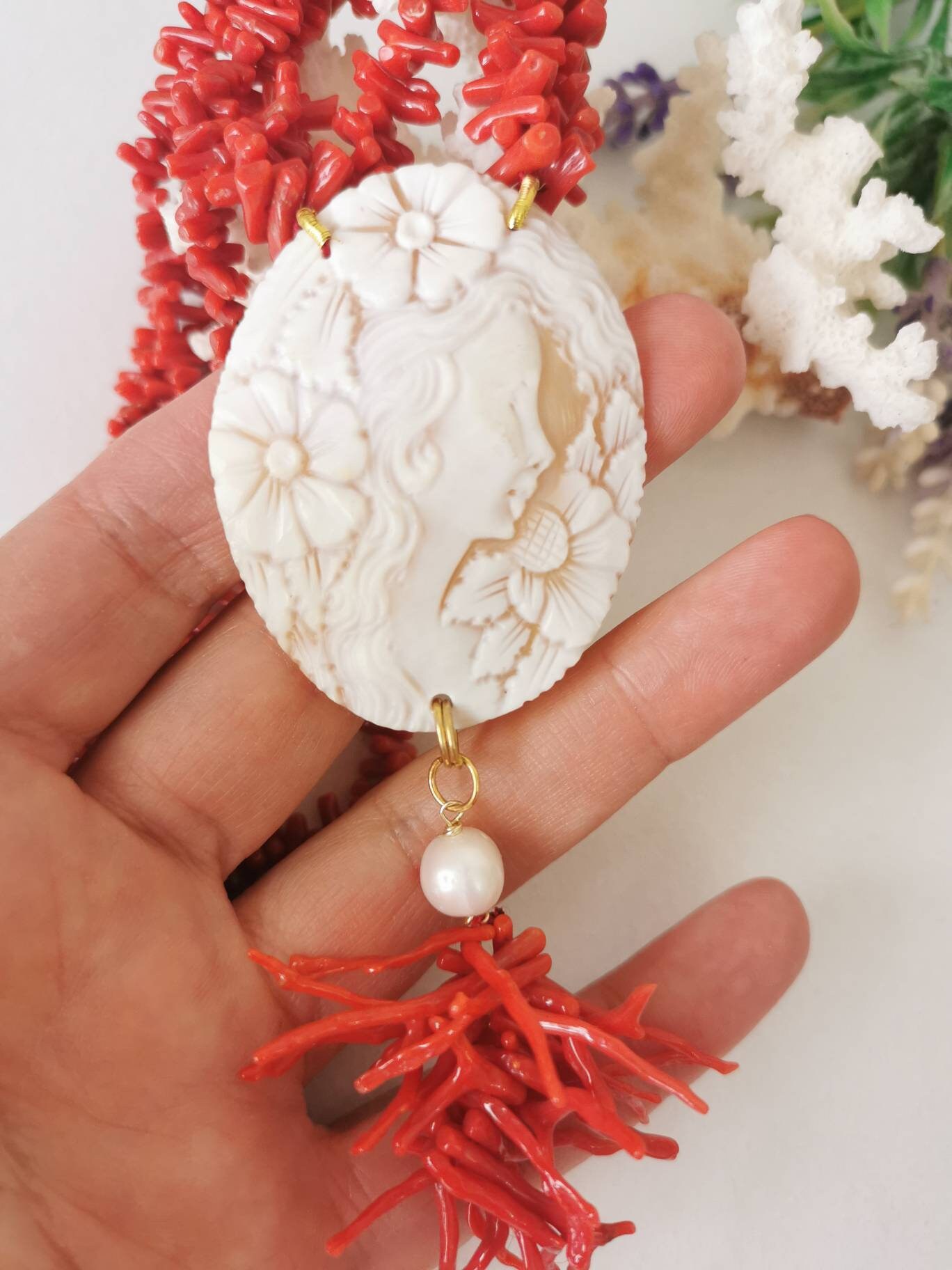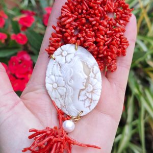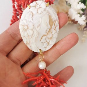Collana artigianale realizzata con 2 fili corallo naturale rosso mediterraneo e pendente cammeo autentico in conchiglia sardonica scolpita a mano a Torre del greco raffigurante volto di donna , 5,4×4,5 cm dimensioni e grappolo rametti corallo rosso mediterraneo e perle bianche barocche.