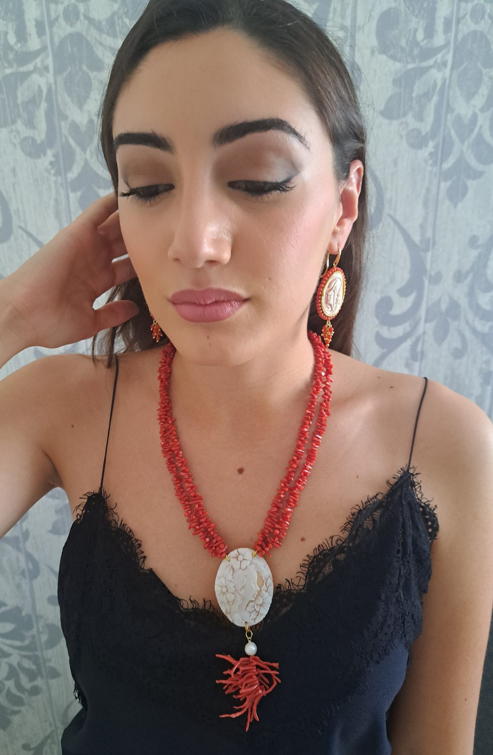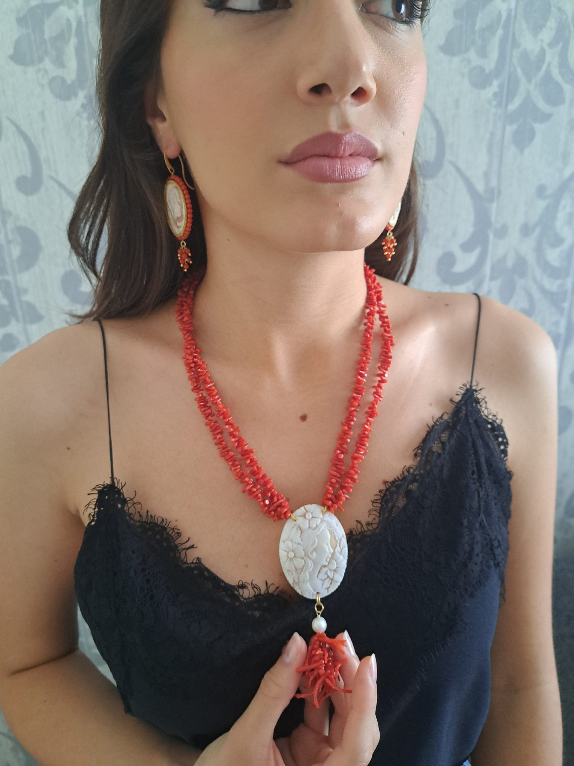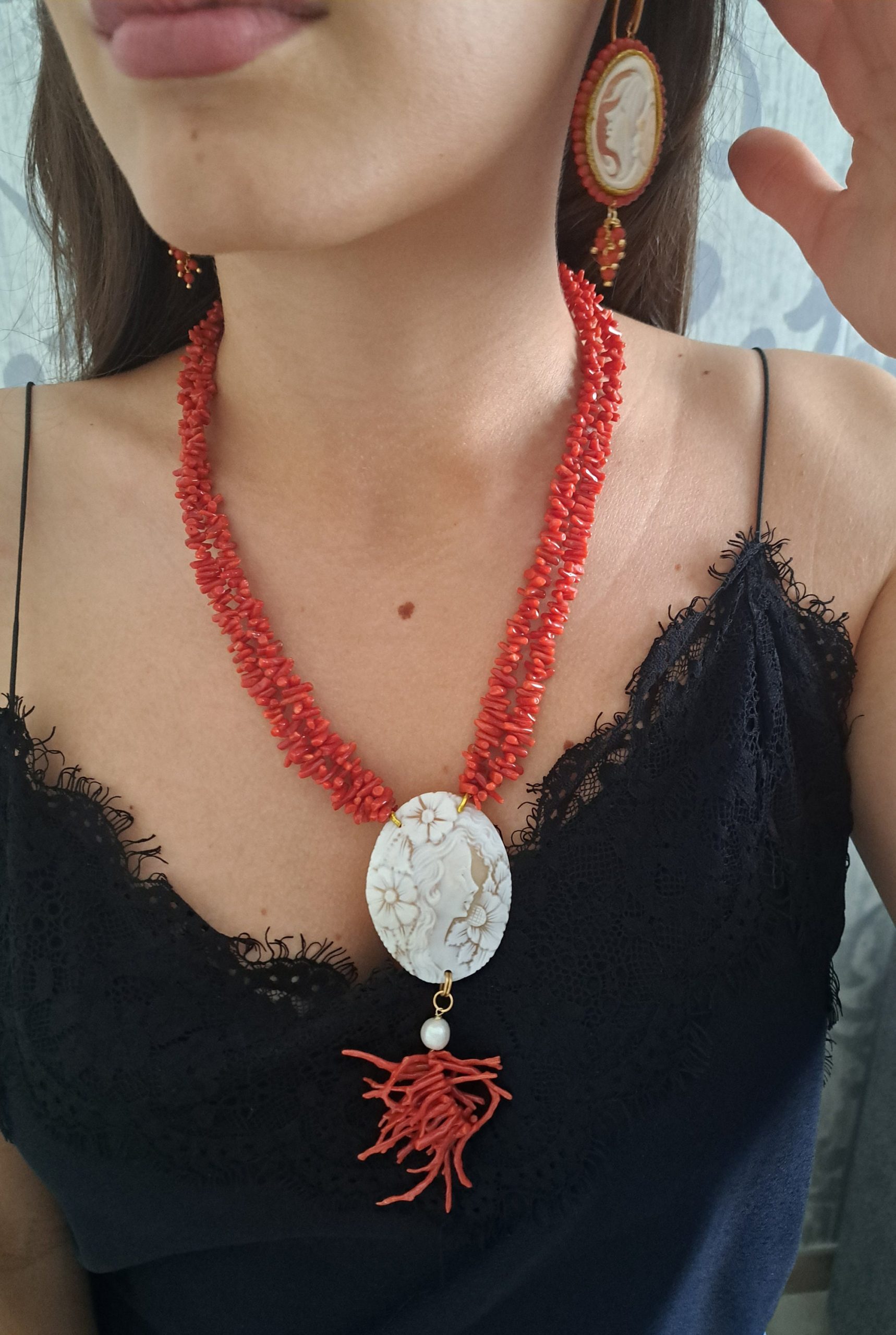 Collana cammeo conchiglia sardonica e 2 fili corallo rosso naturale mediterraneo , gioielli italiani