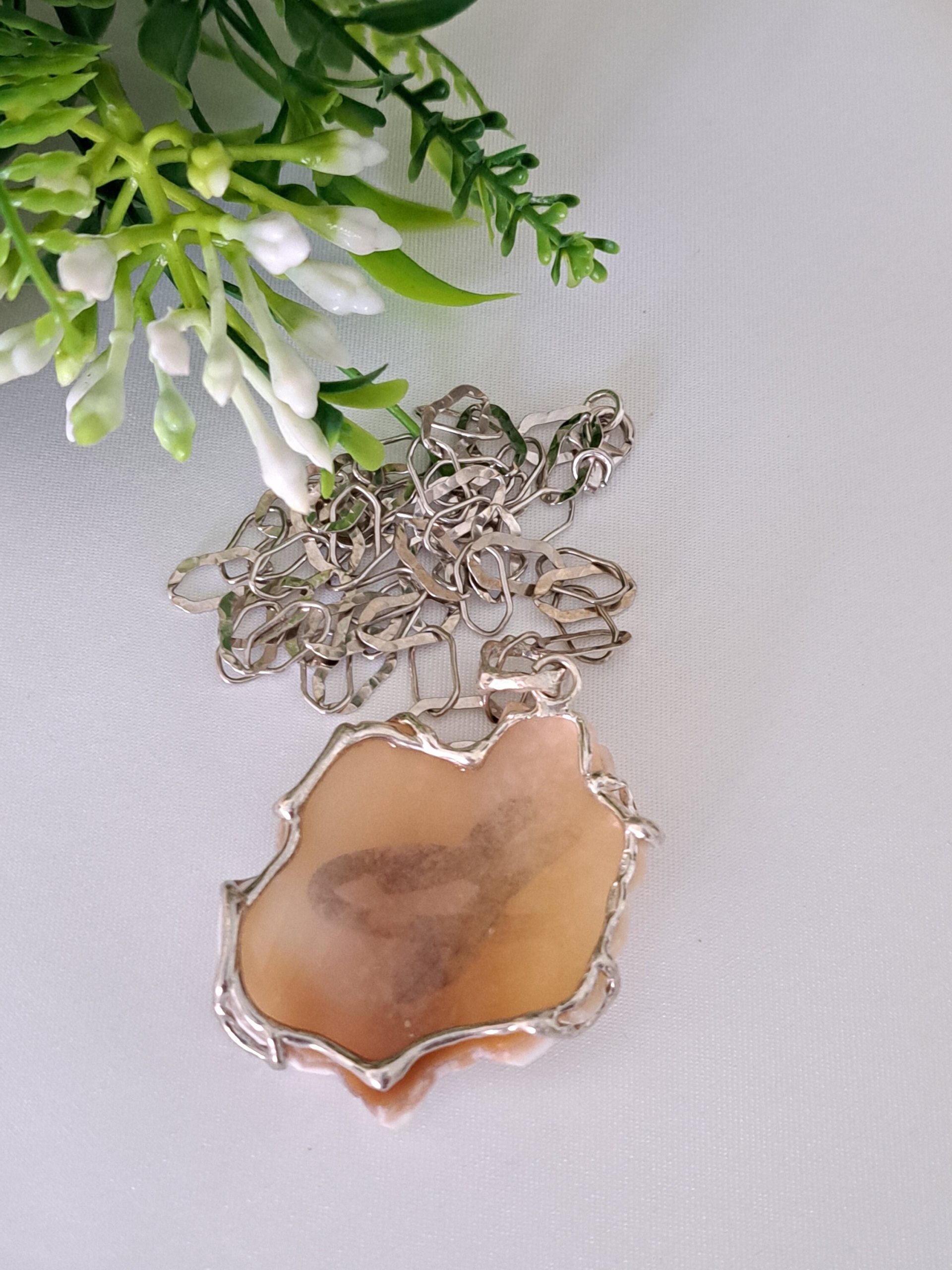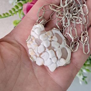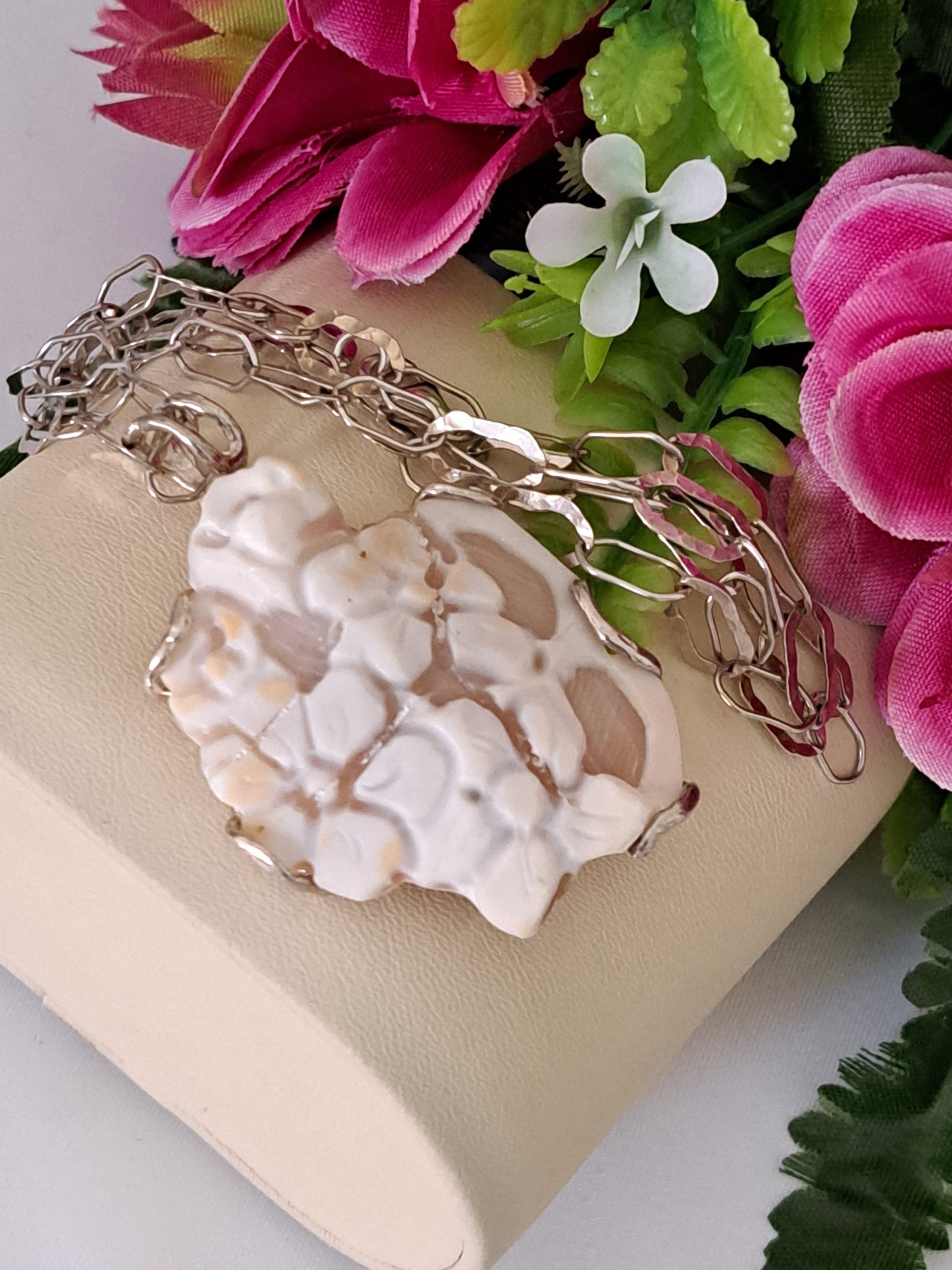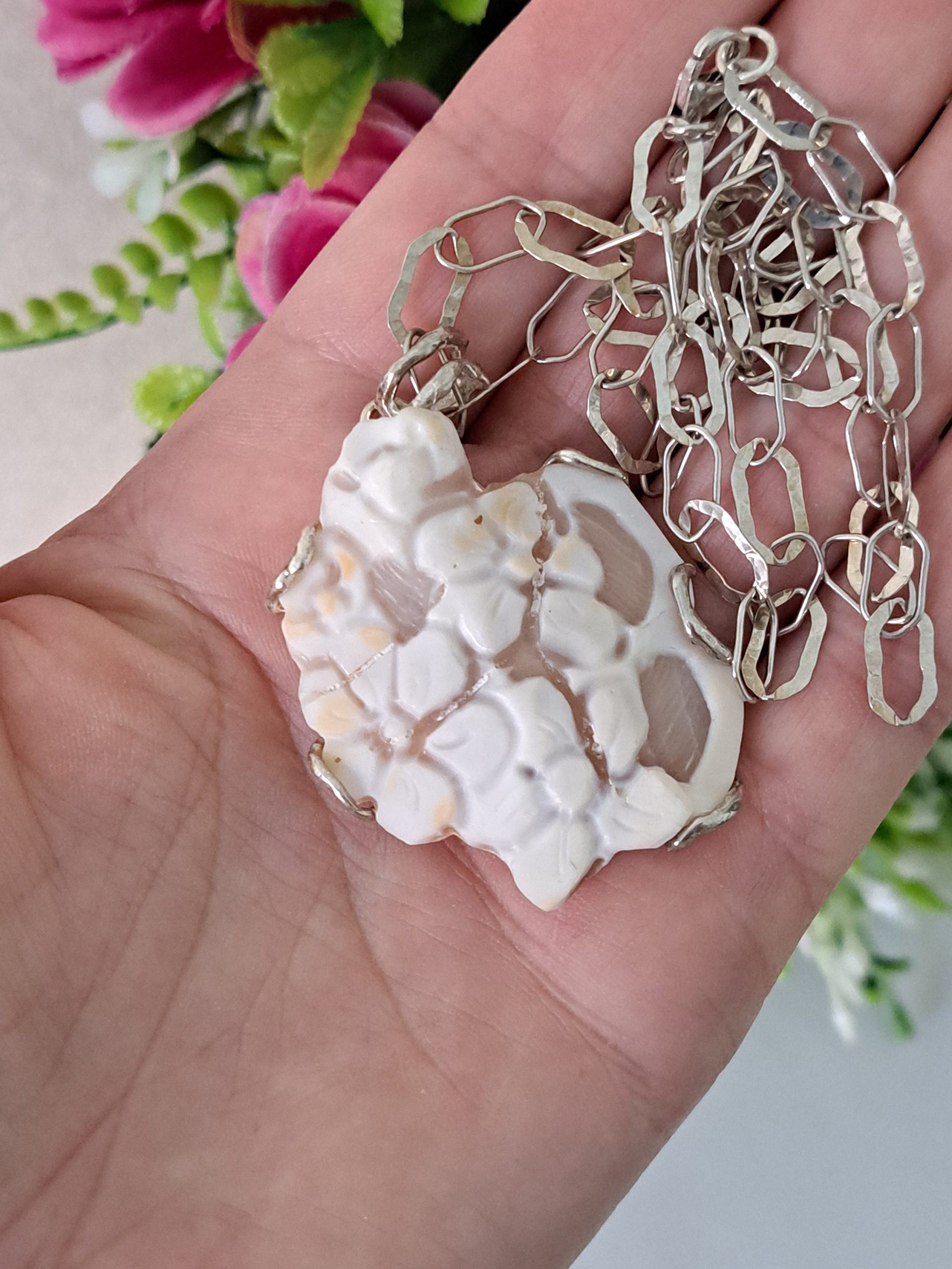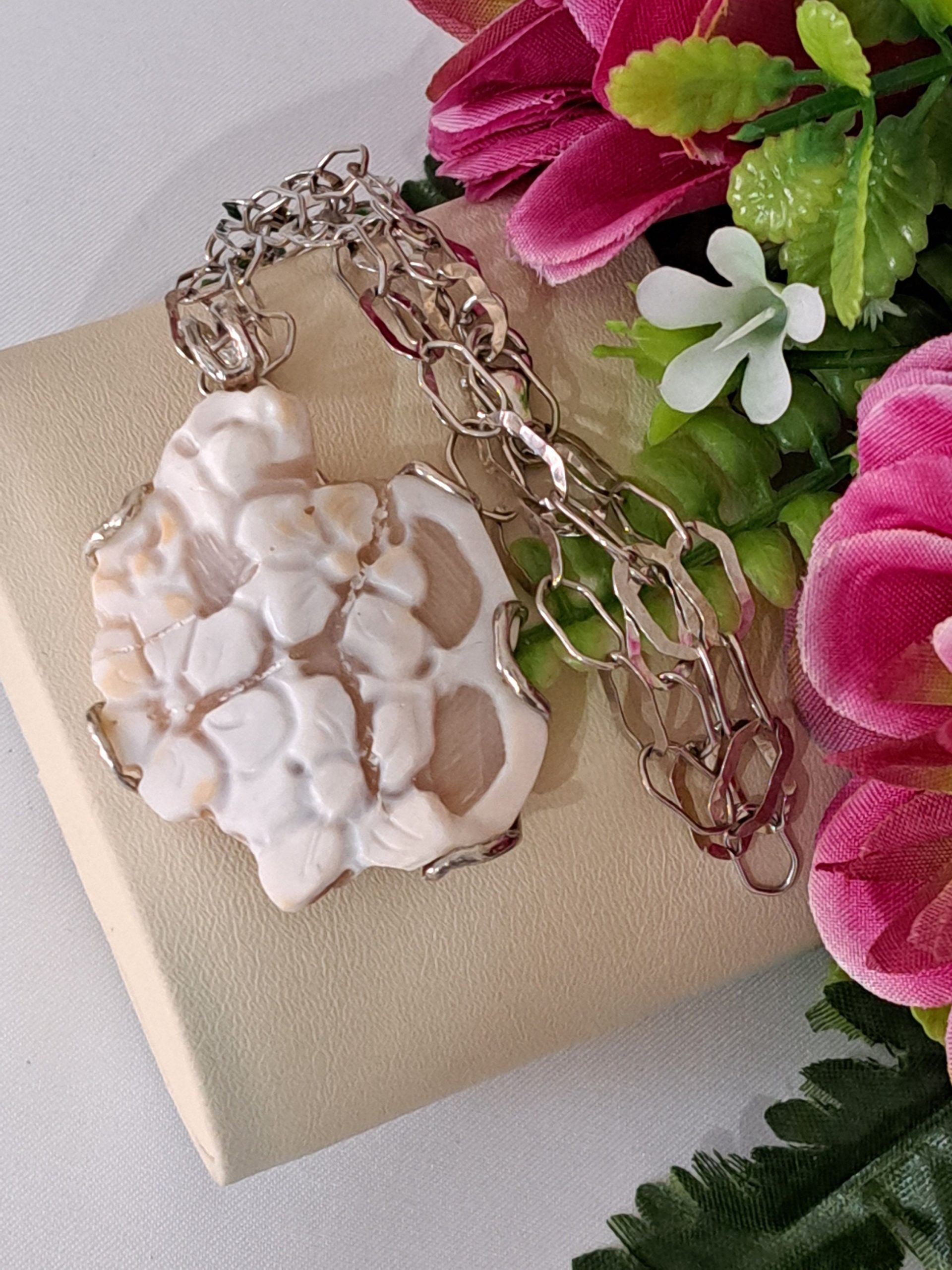 Collana con pendente cammeo autentico in conchiglia sardonica scolpita a mano a Torre del greco raffigurante fiori , 4,5×3,8 cm dimensioni, con cornice e gancetto in argento 925 .