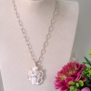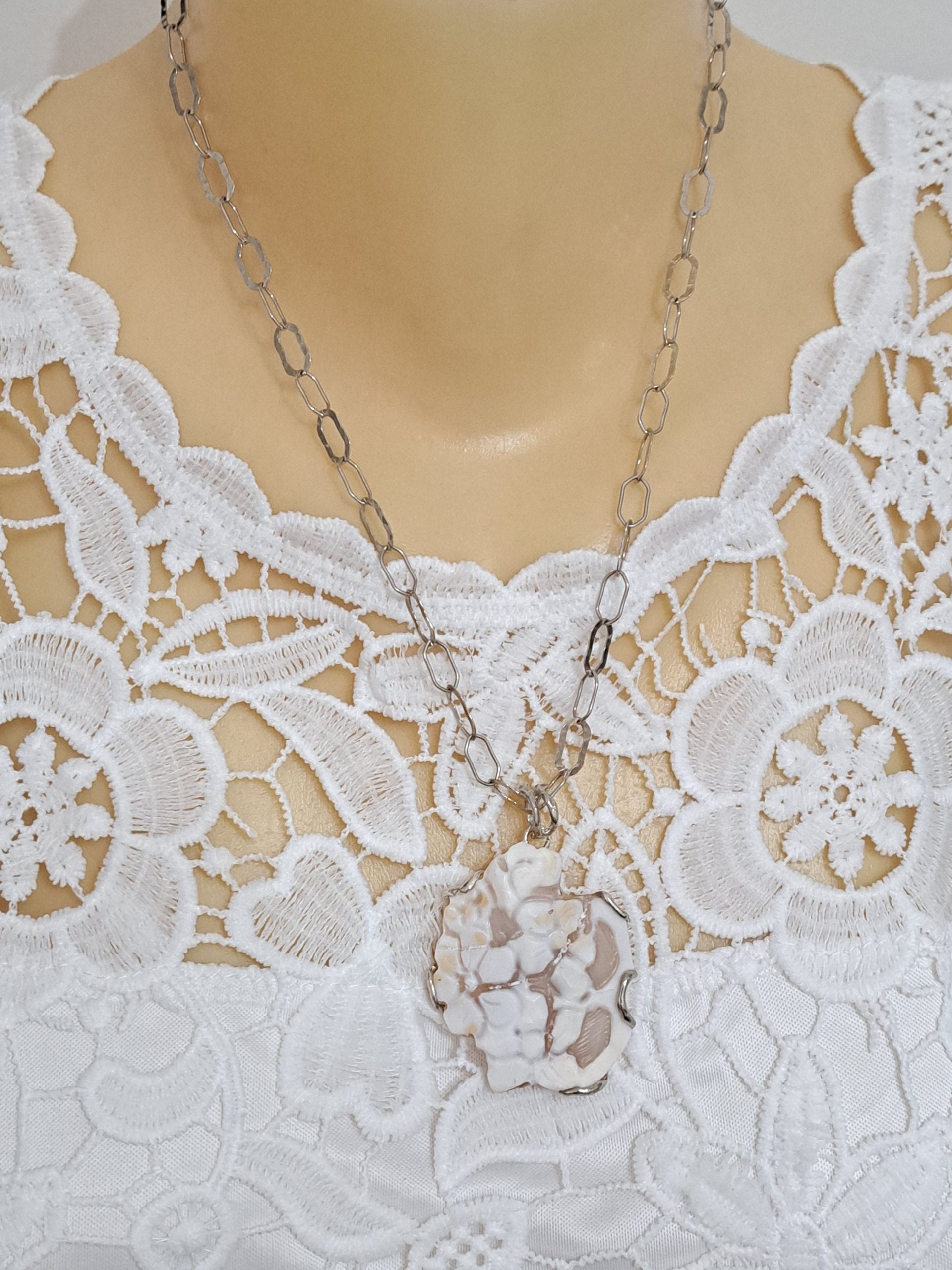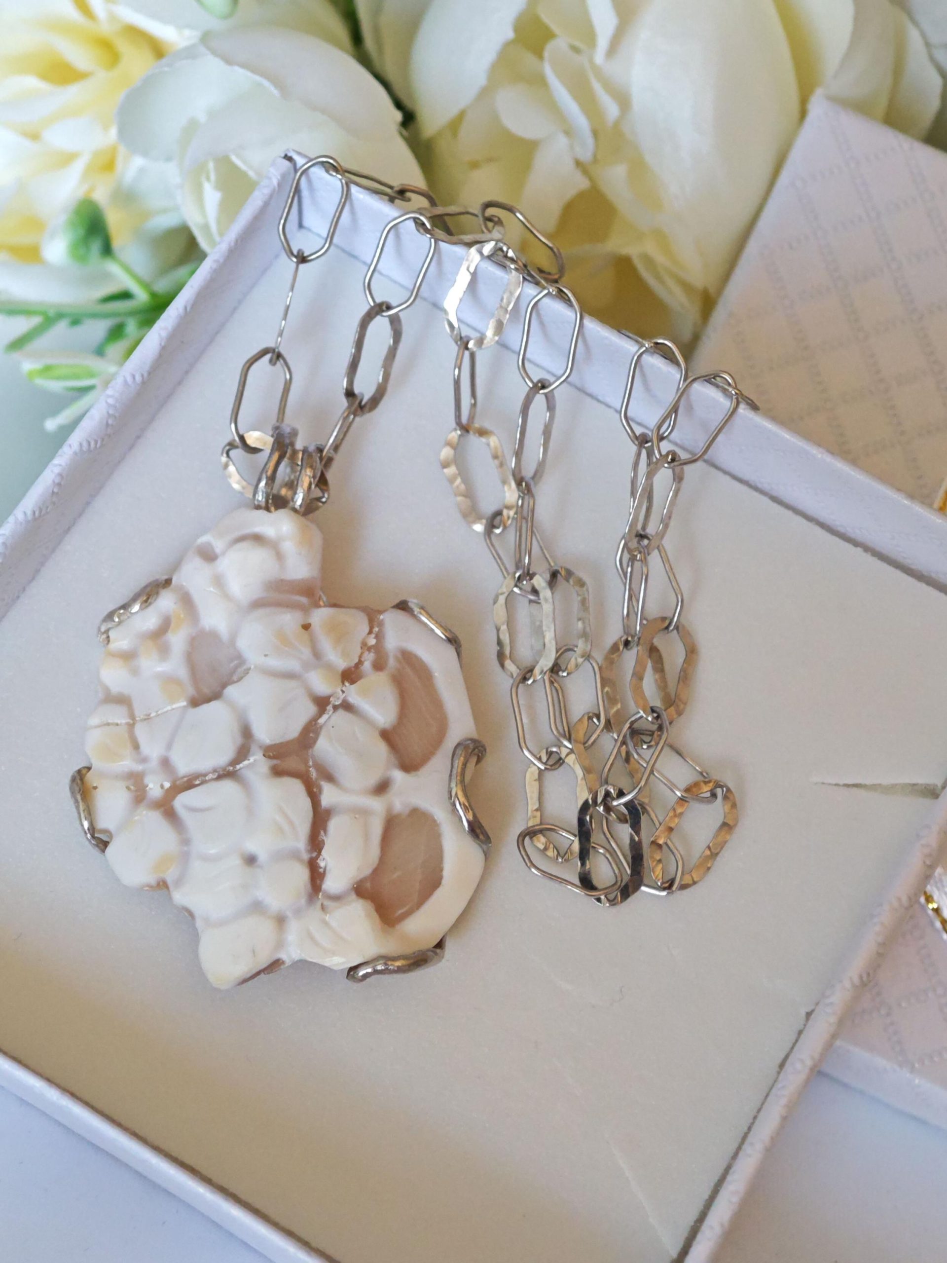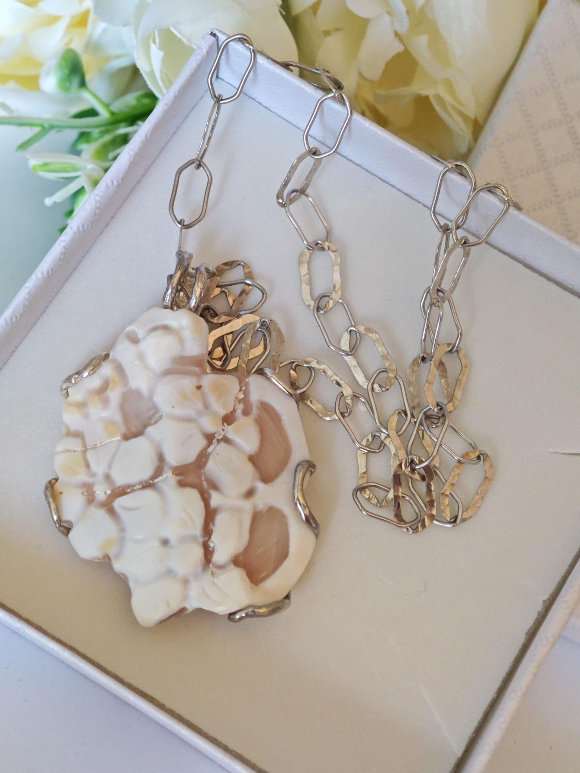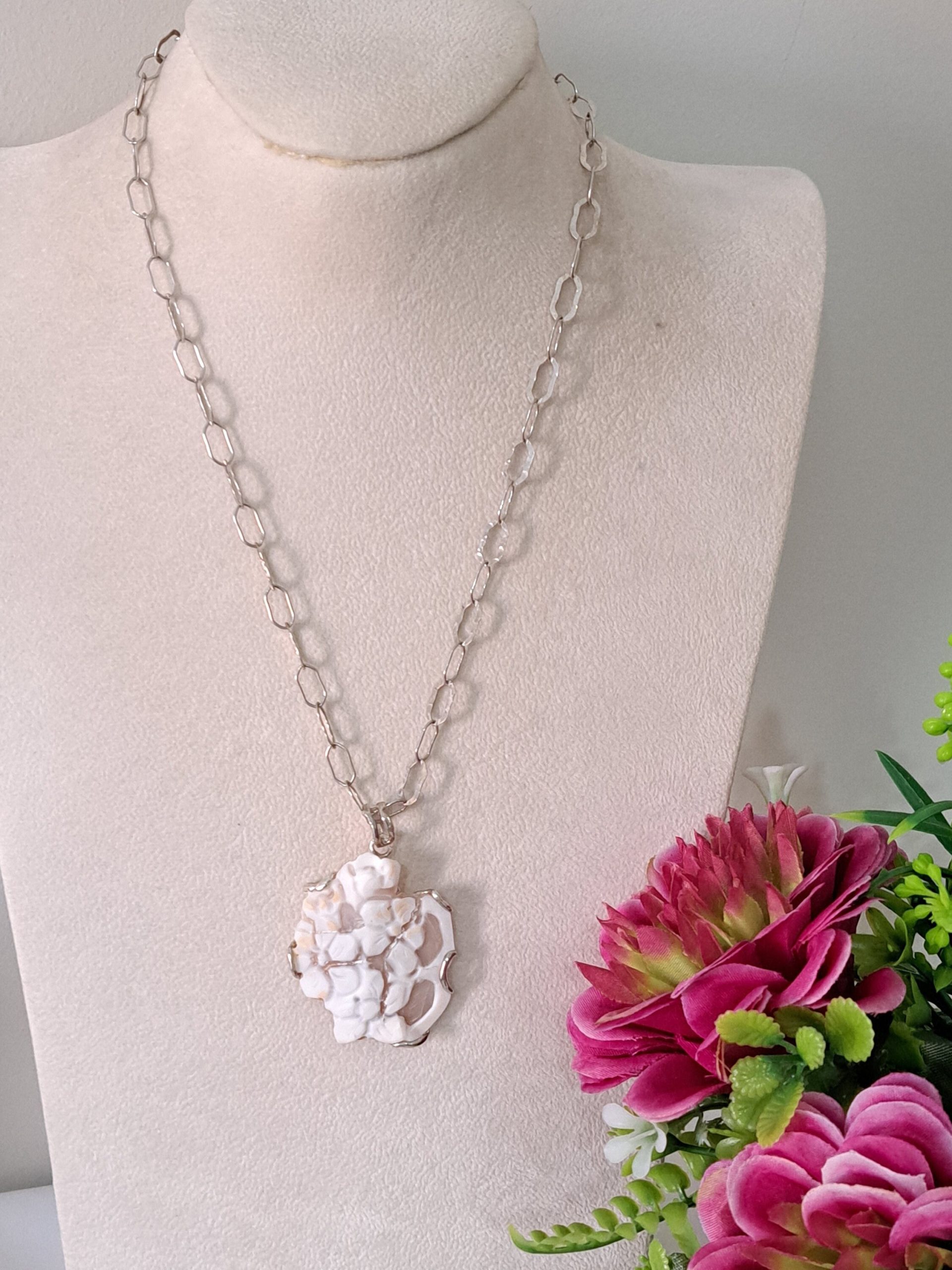 Collana  cammeo fiori e perla barocca bianca con catena  perle bianche, gioielli italiani
