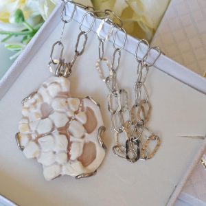 Collana cammeo fiori e perla barocca bianca con catena perle bianche, gioielli italiani
