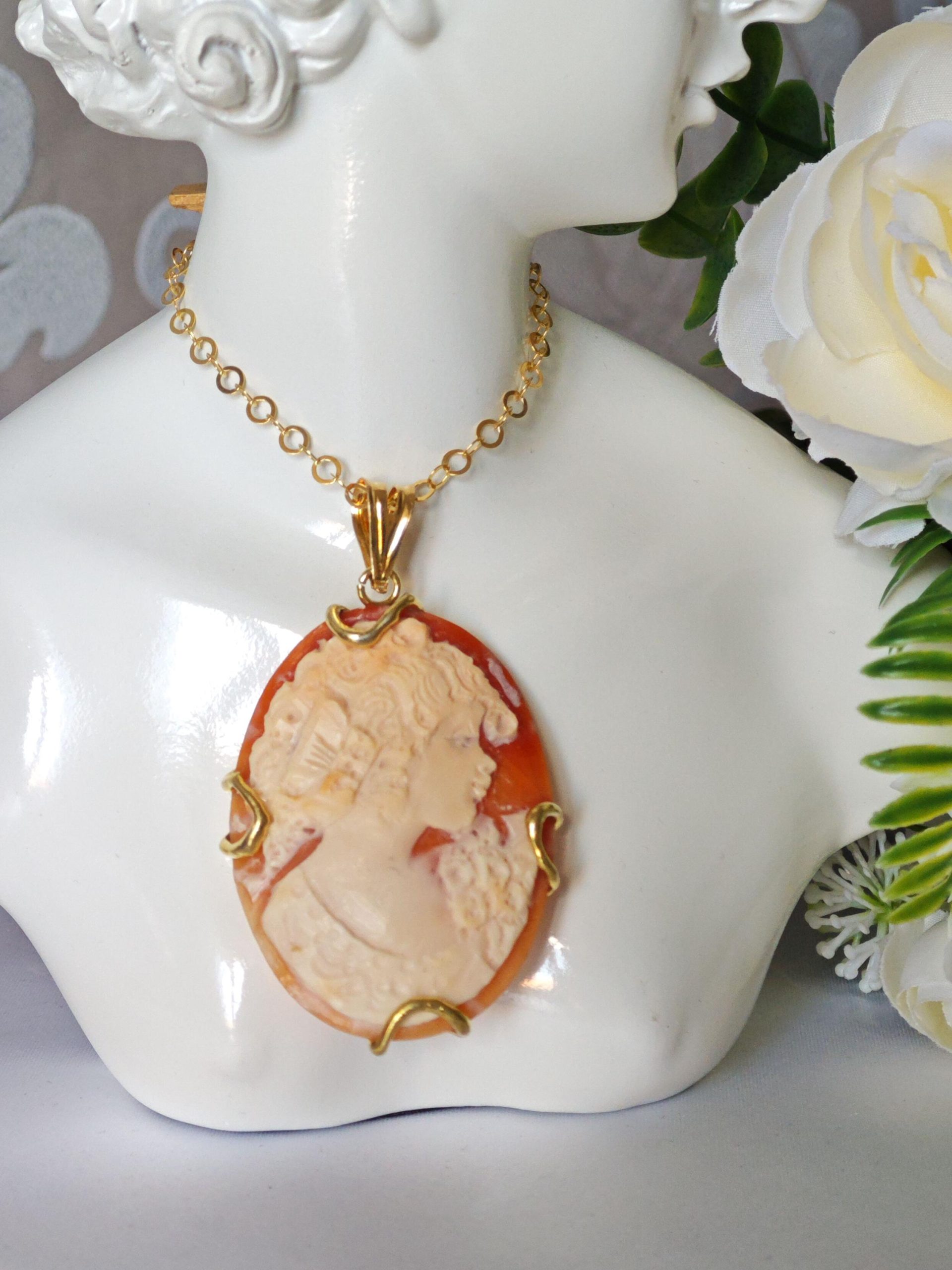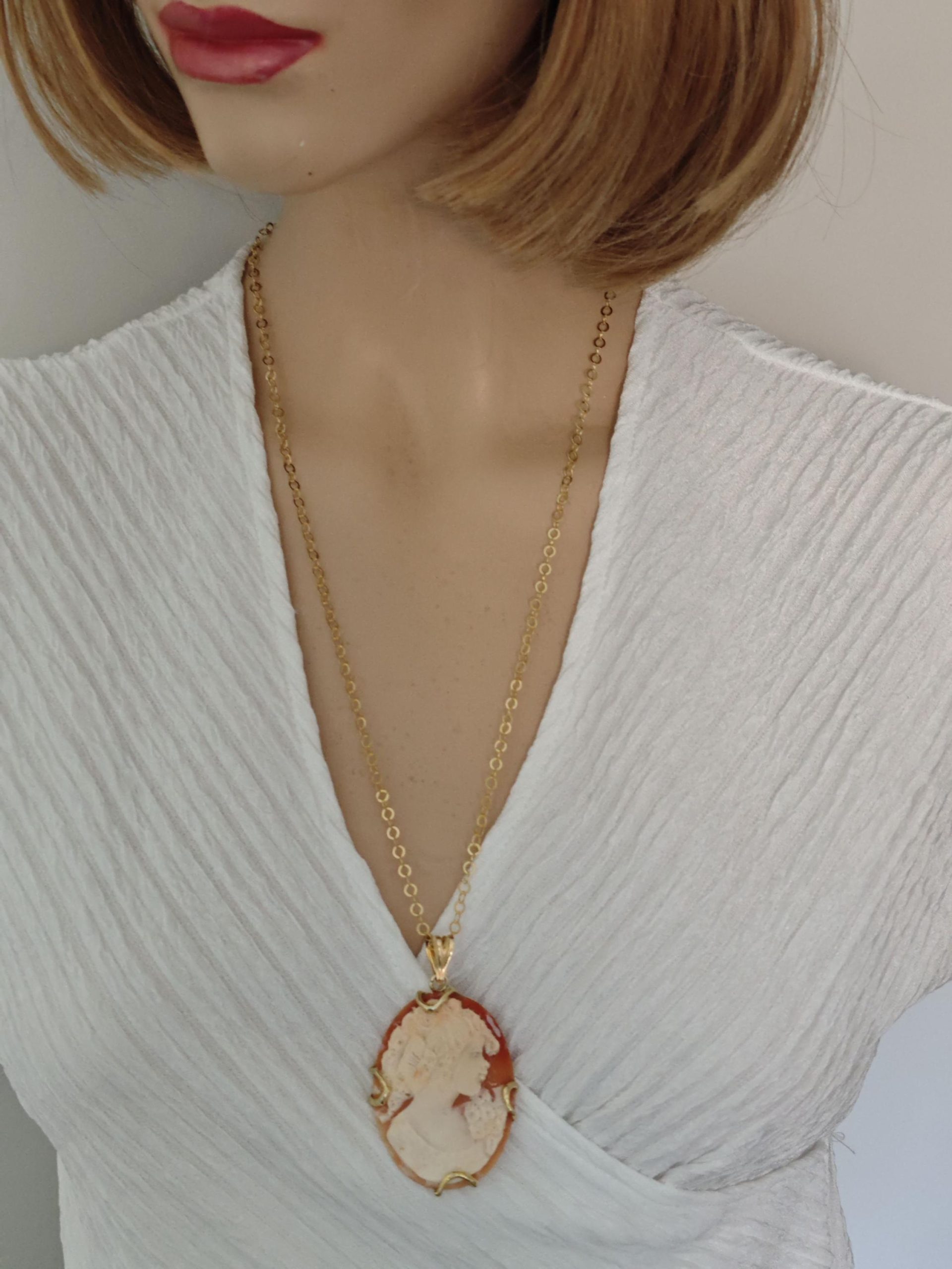 Collana con catena in argento 925 placcato oro e con pendente cammeo autentico in conchiglia sardonica scolpita a mano a Torre del greco raffigurante volto di donna 5×4 cm, con cornice e gancetto in argento 925 placcato oro.