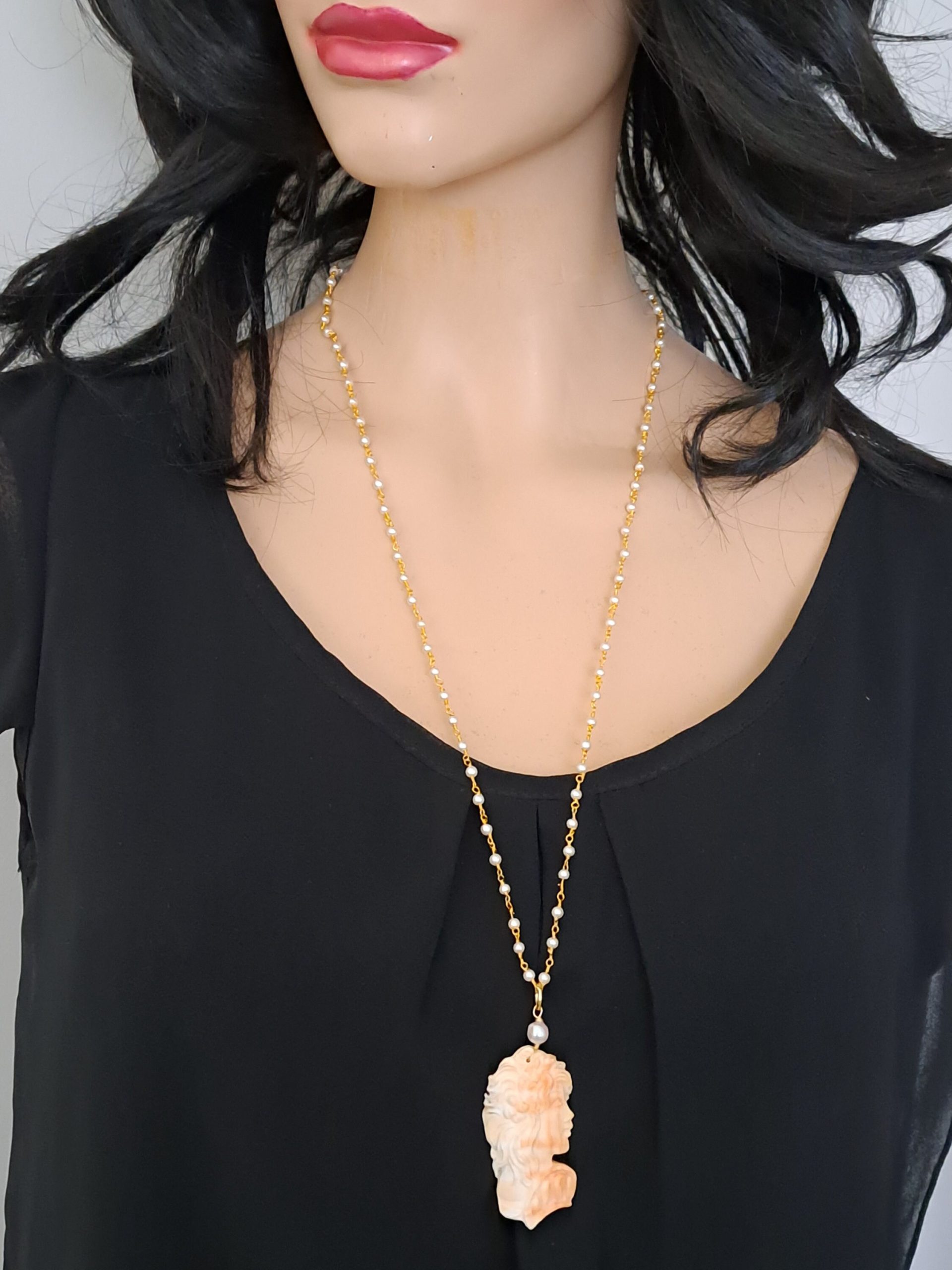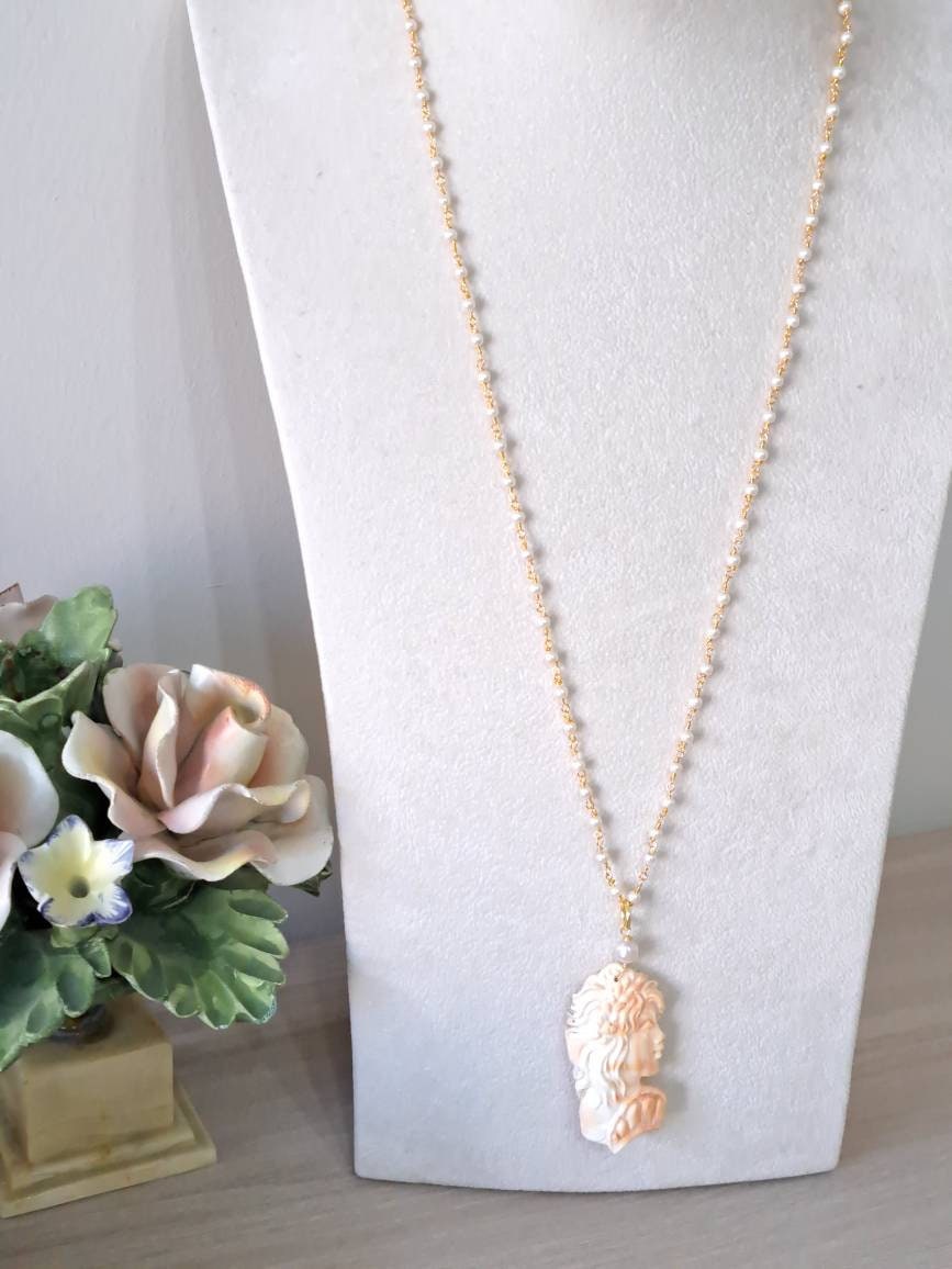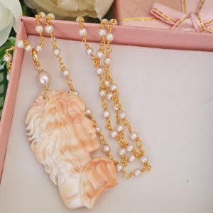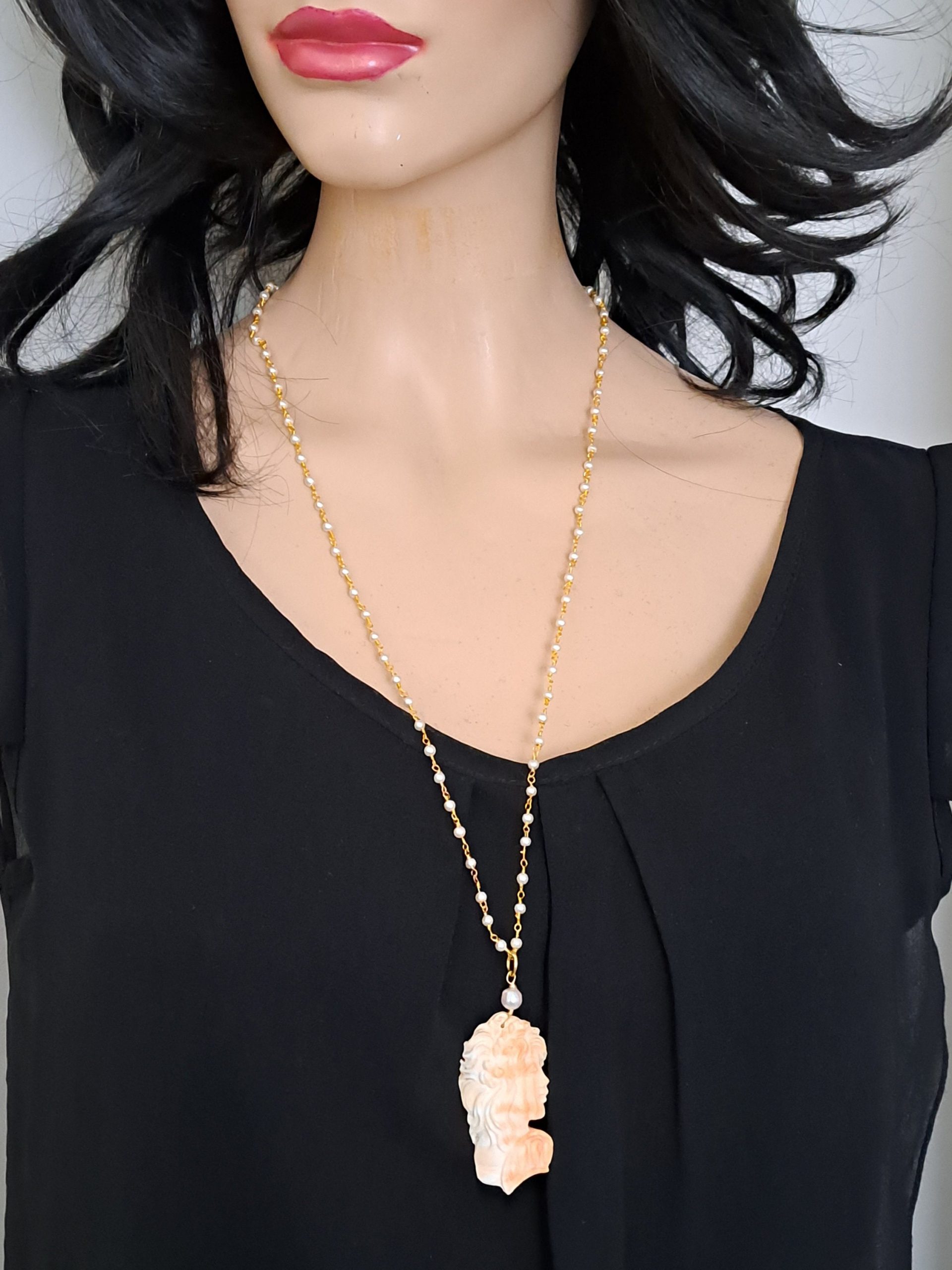 Collana cammeo conchiglia sardonica e catena rosario perle bianche, gioielli italiani
