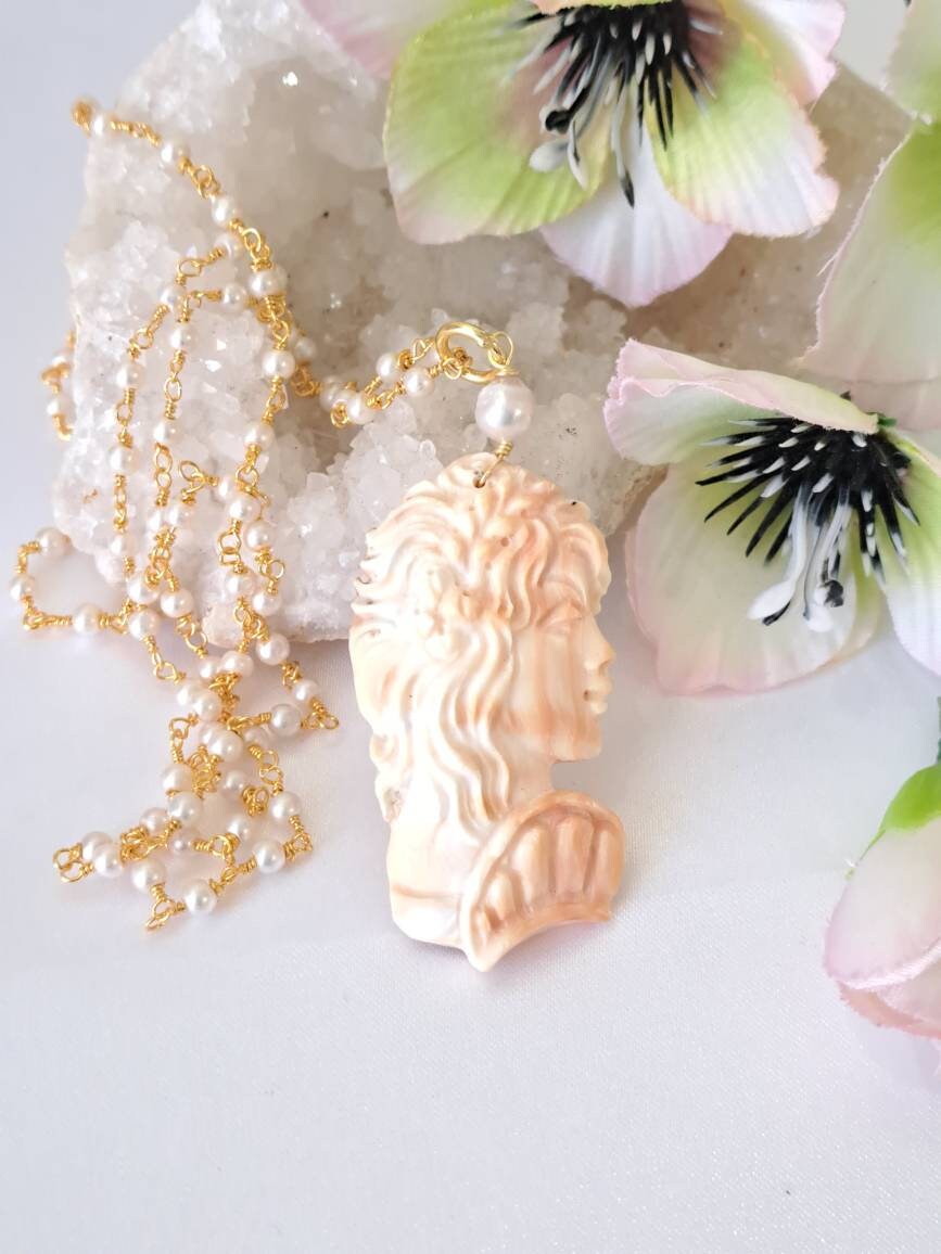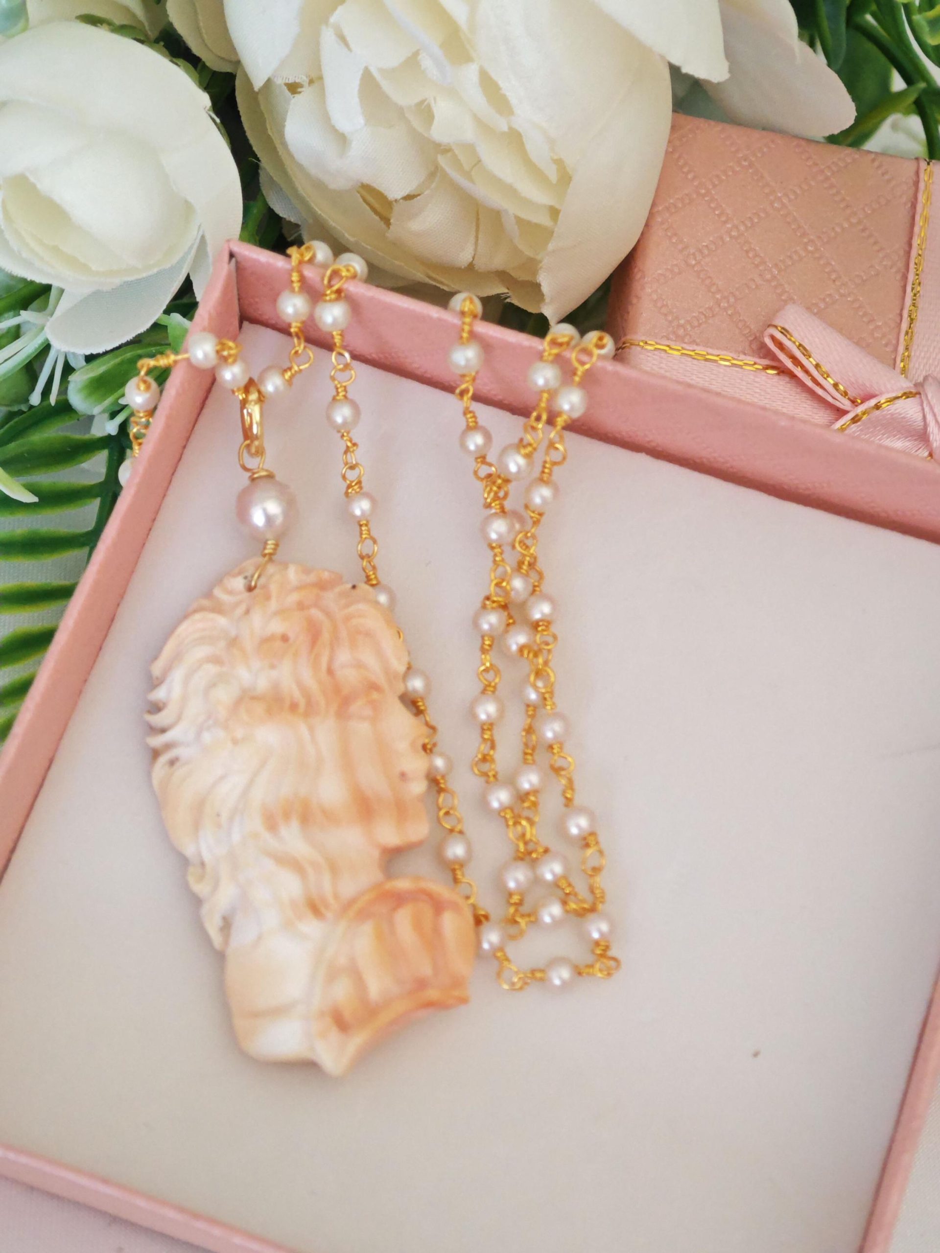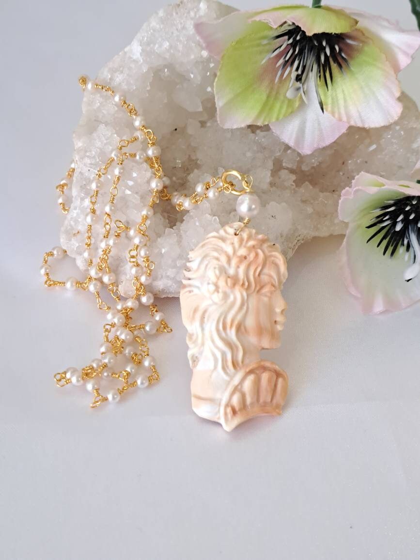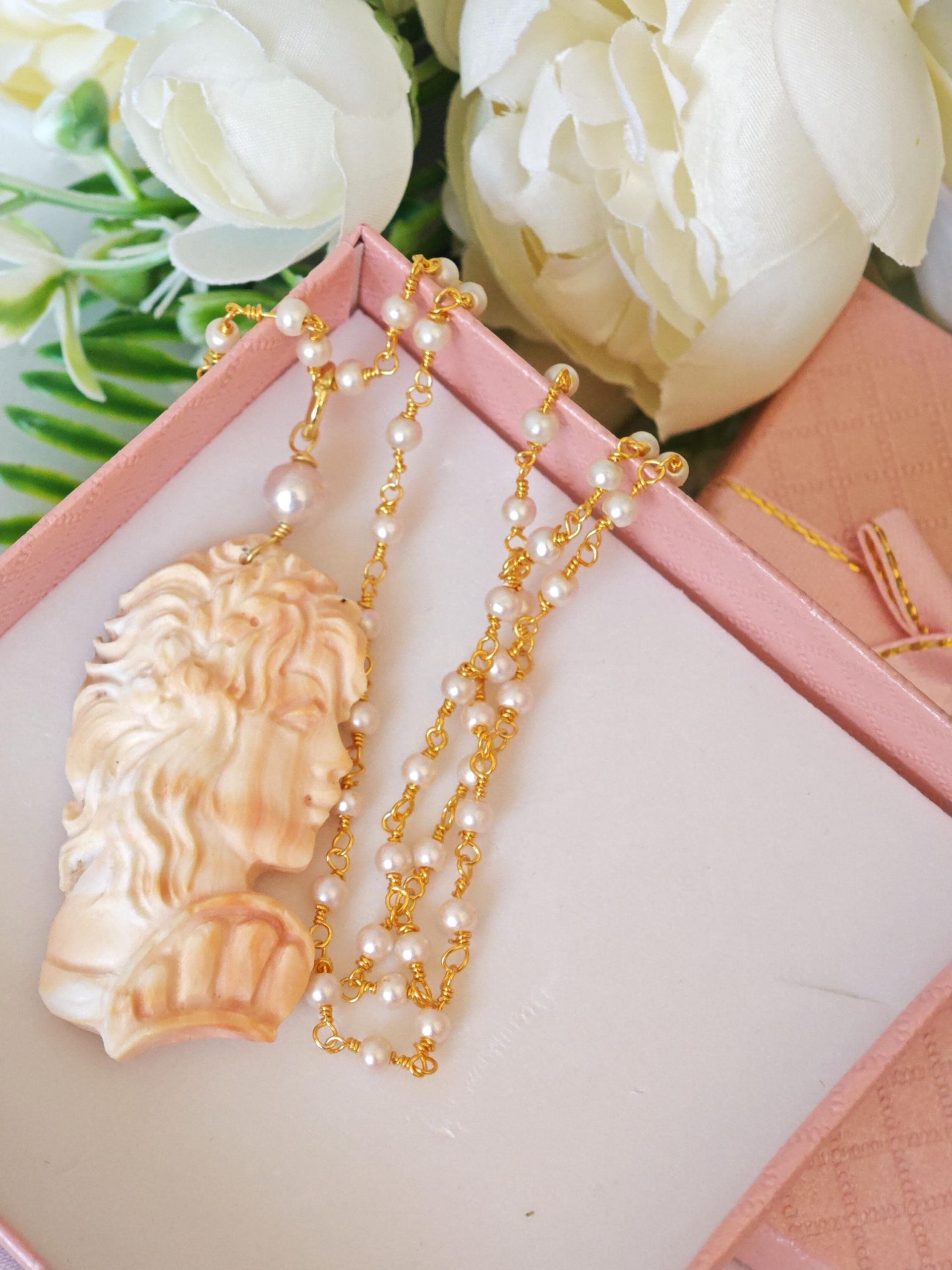 Collana cammeo conchiglia sardonica e catena rosario perle bianche, gioielli italiani