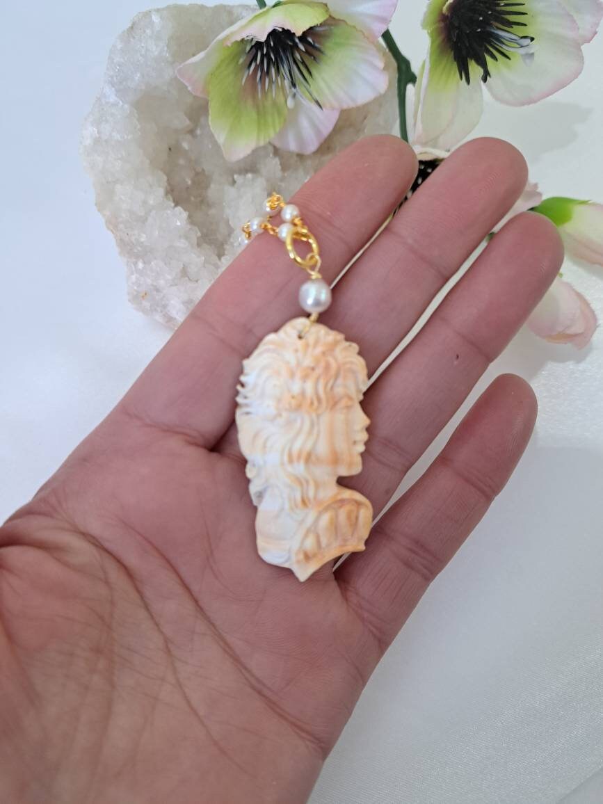 Collana realizzata con cammeo autentico in conchiglia sardonica scolpita a mano a Torre del greco raffigurante volto di donna, 5×2,5 cm dimensioni .