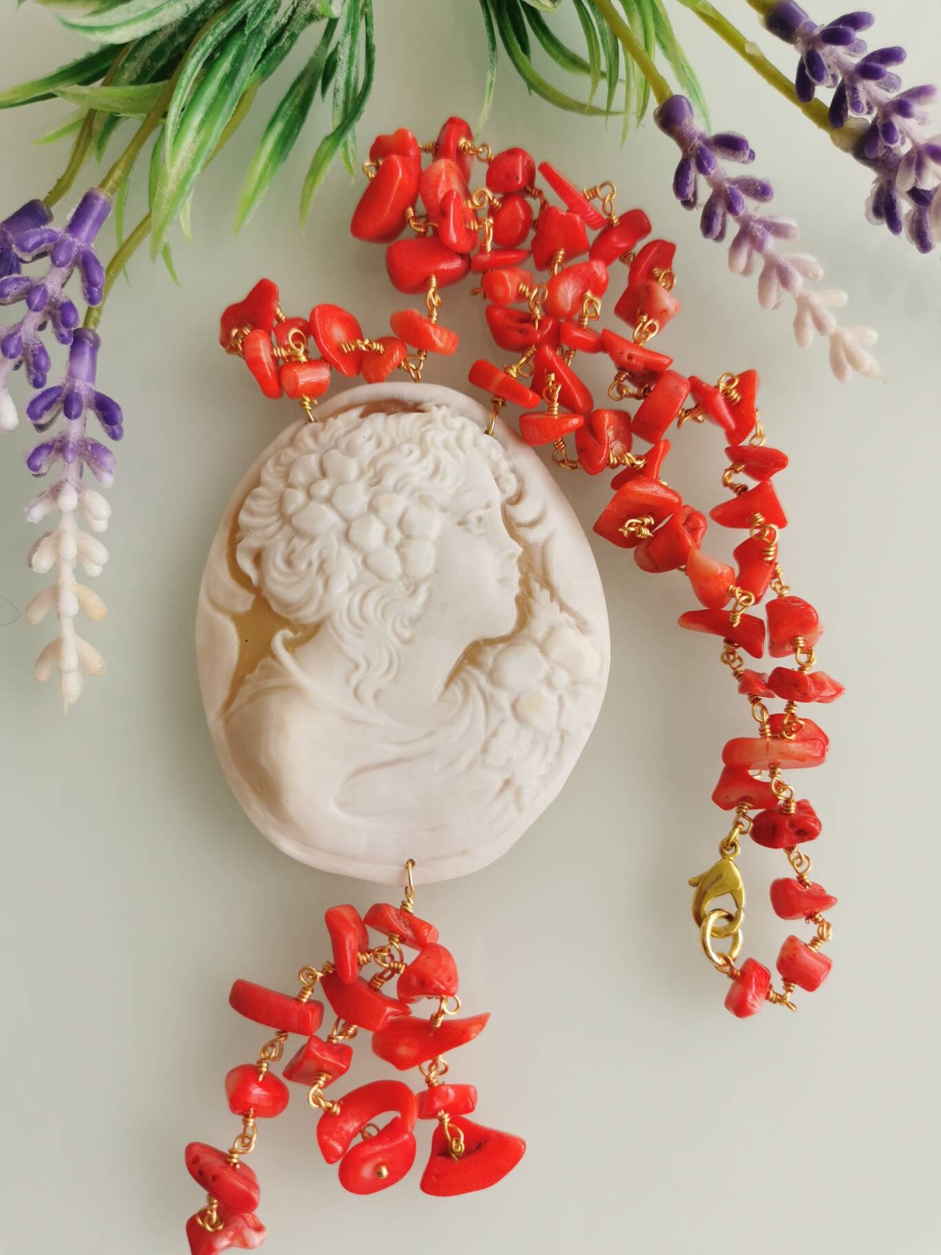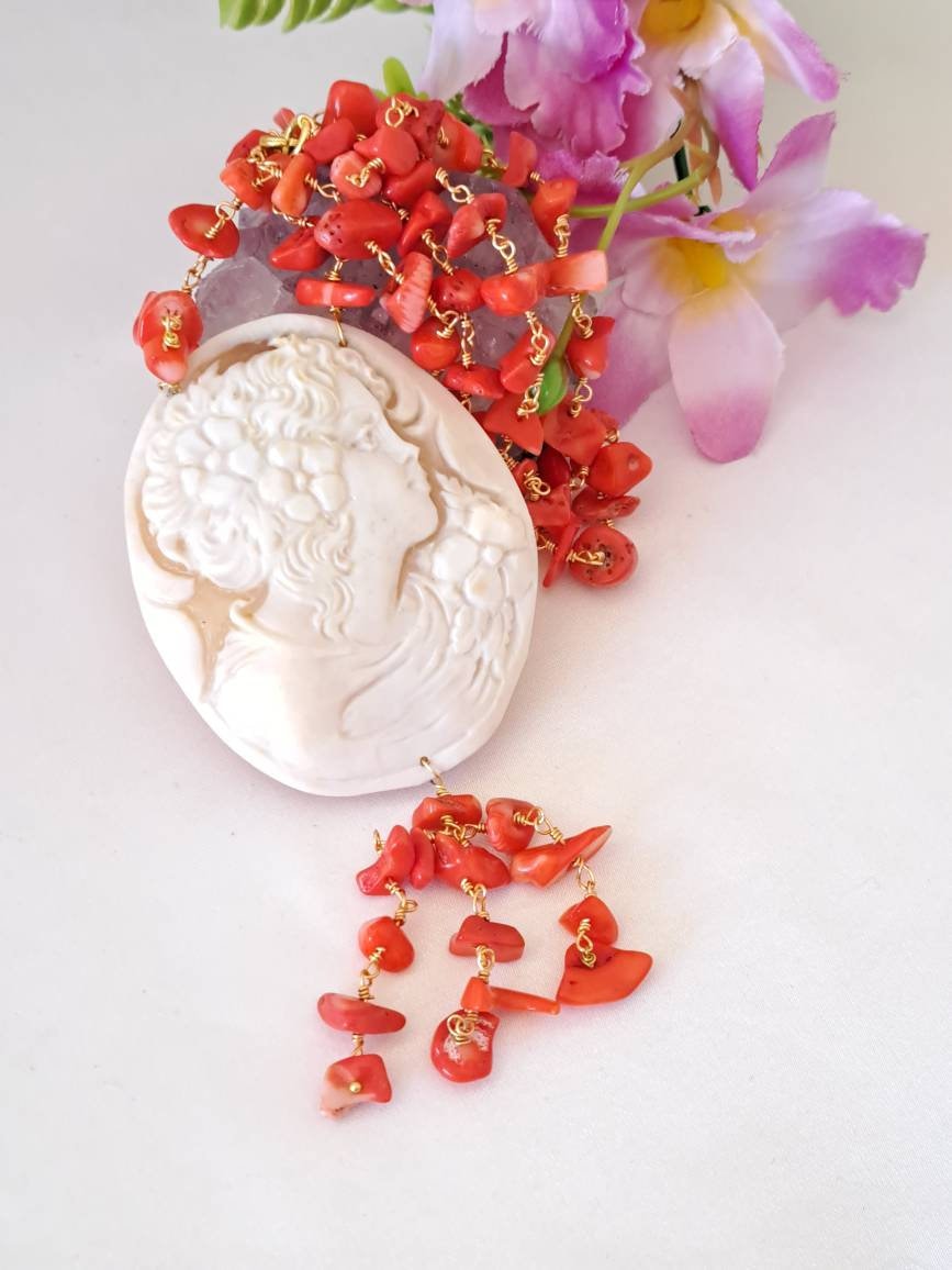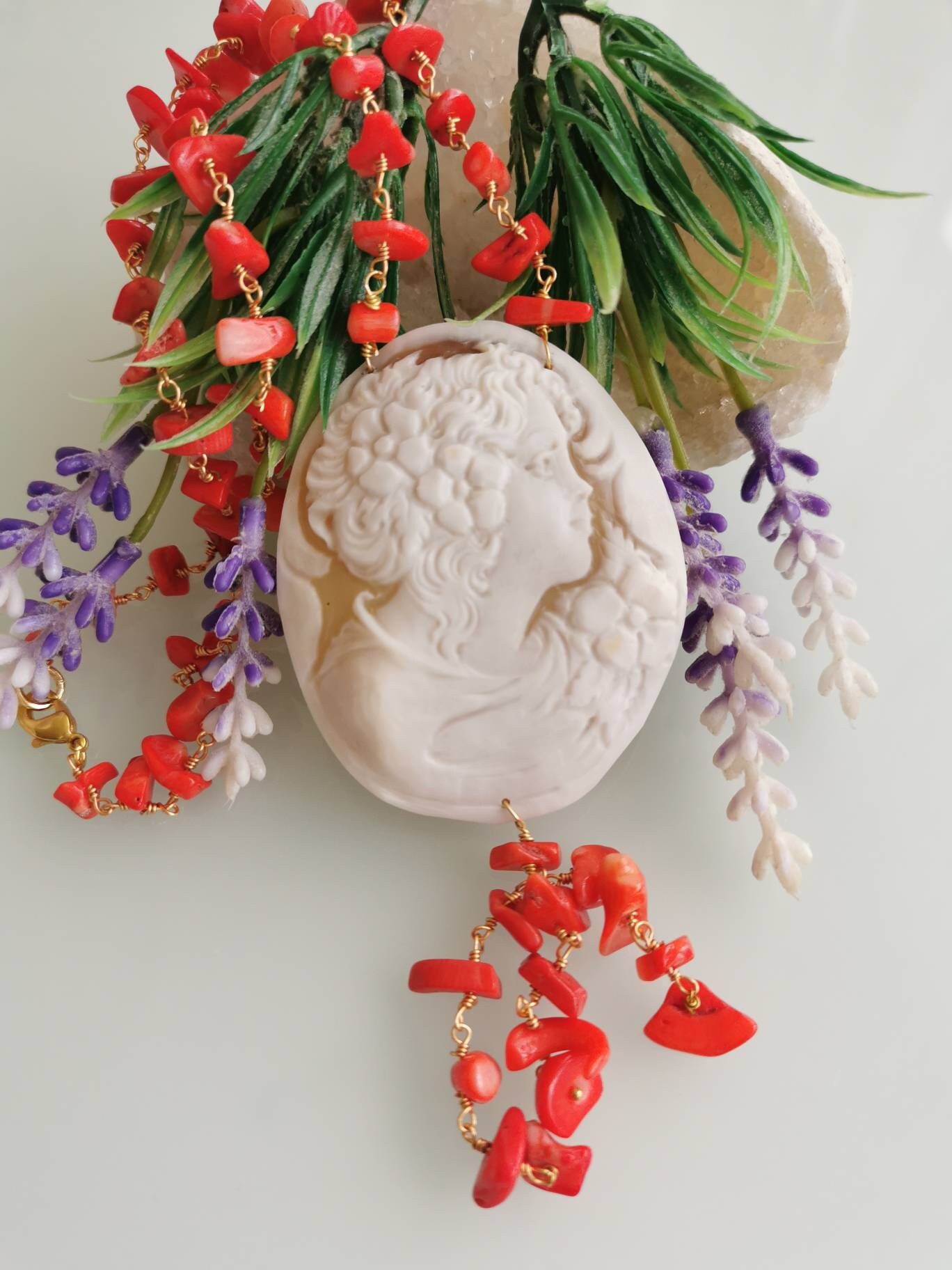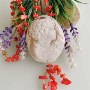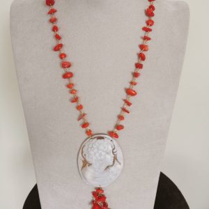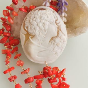 Collana cammeo conchiglia sardonica e corallo rosso , gioielli italiani