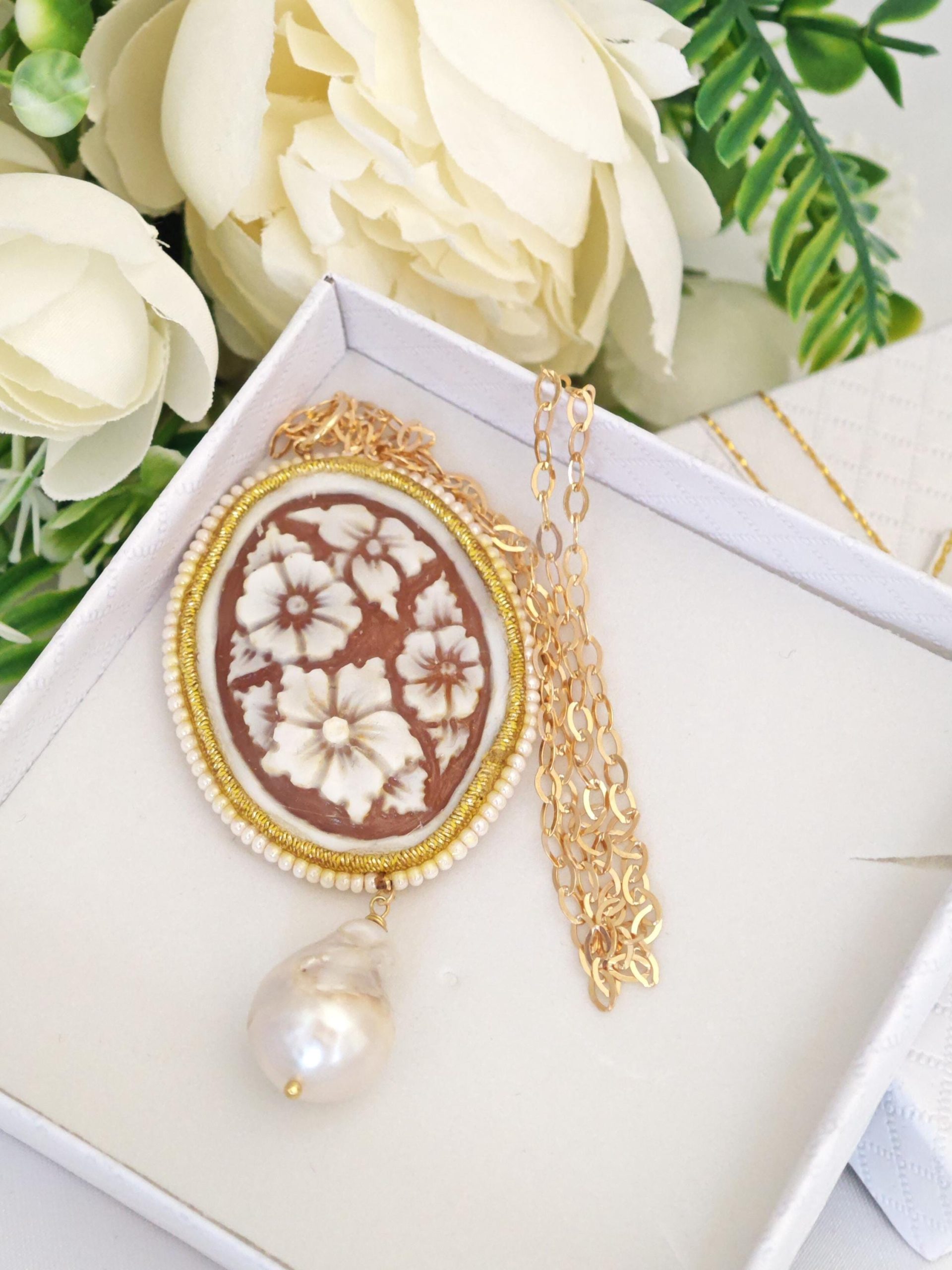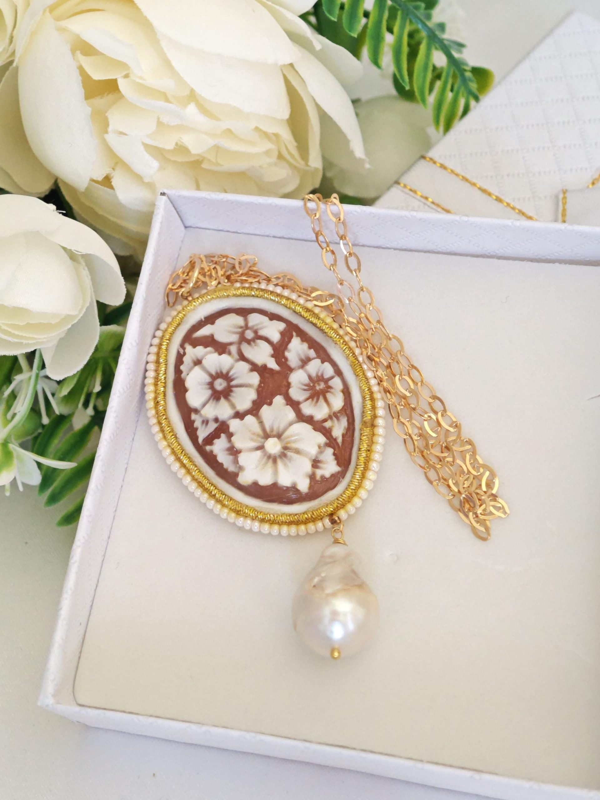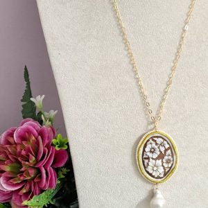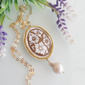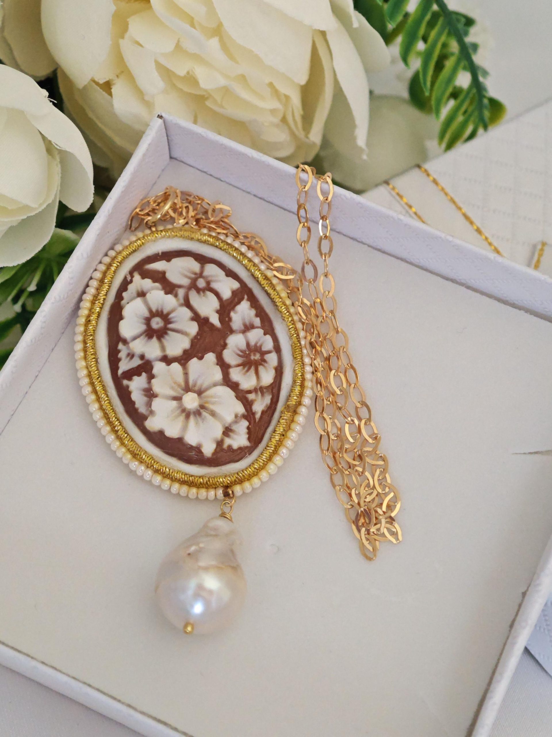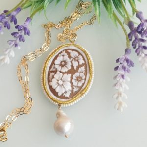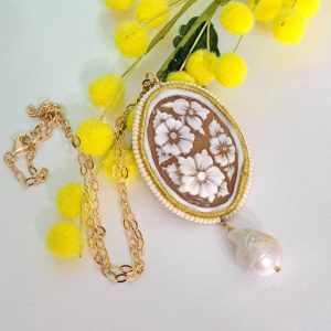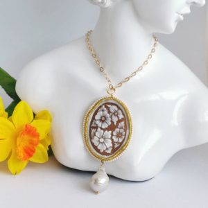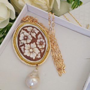 Collana realizzata con cammeo autentico in conchiglia sardonica scolpita a mano a Torre del greco raffigurante fiori , 5×3,8 cm, con cornice perline bianche e perla barocca bianca .