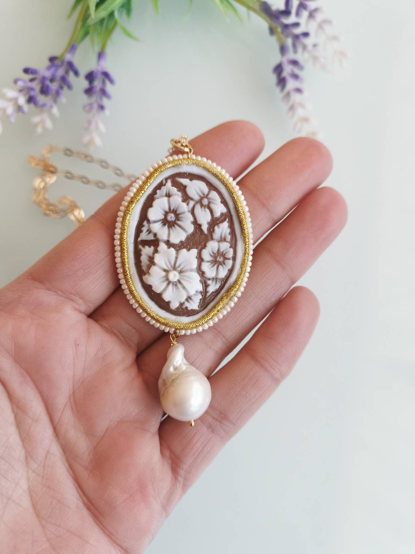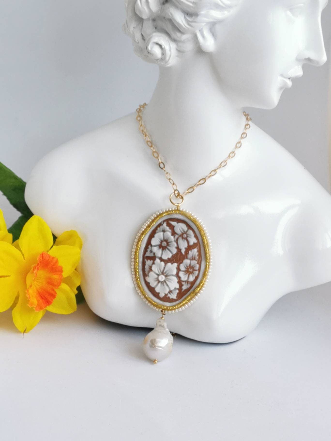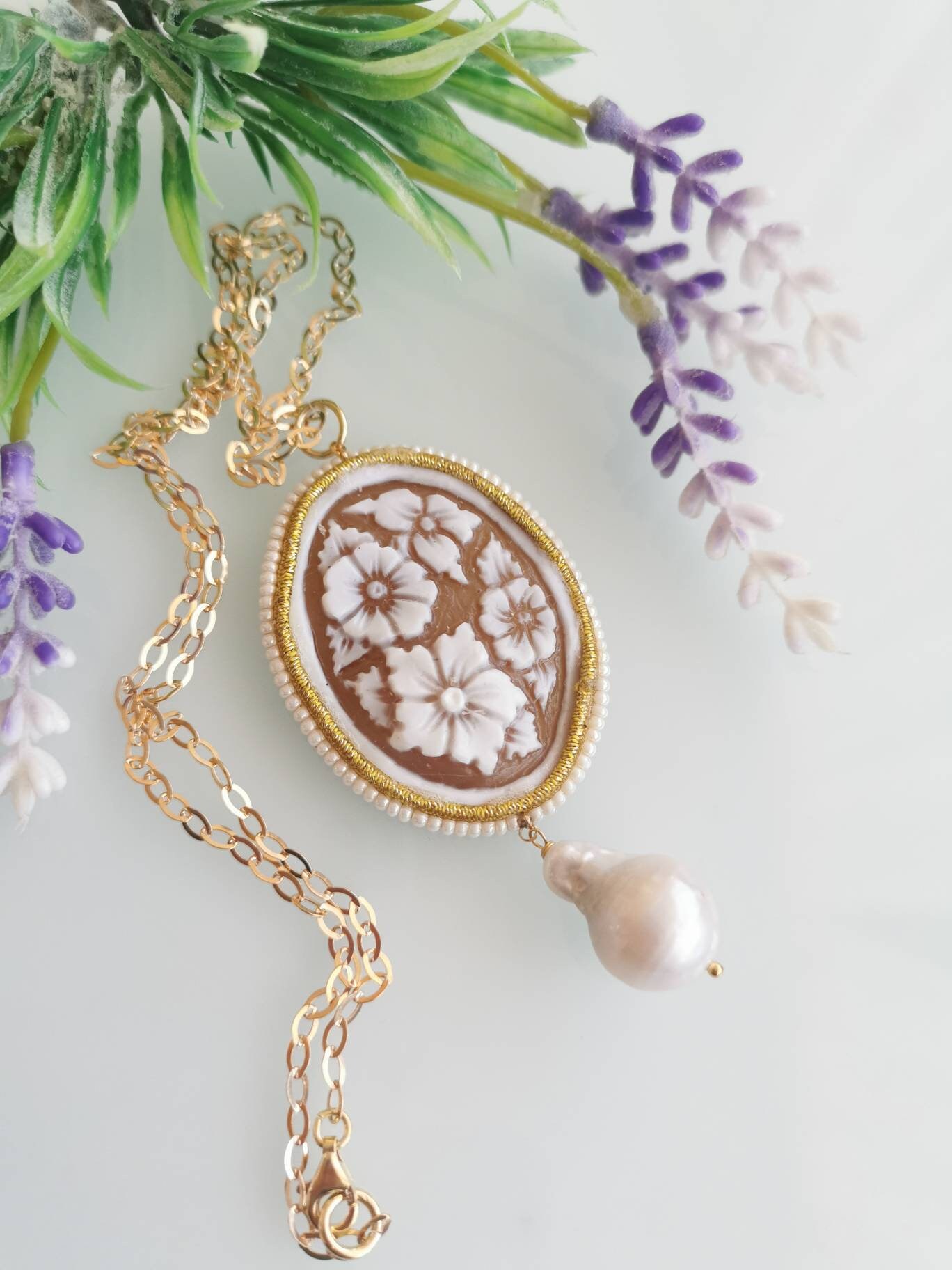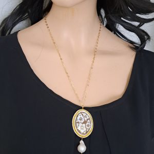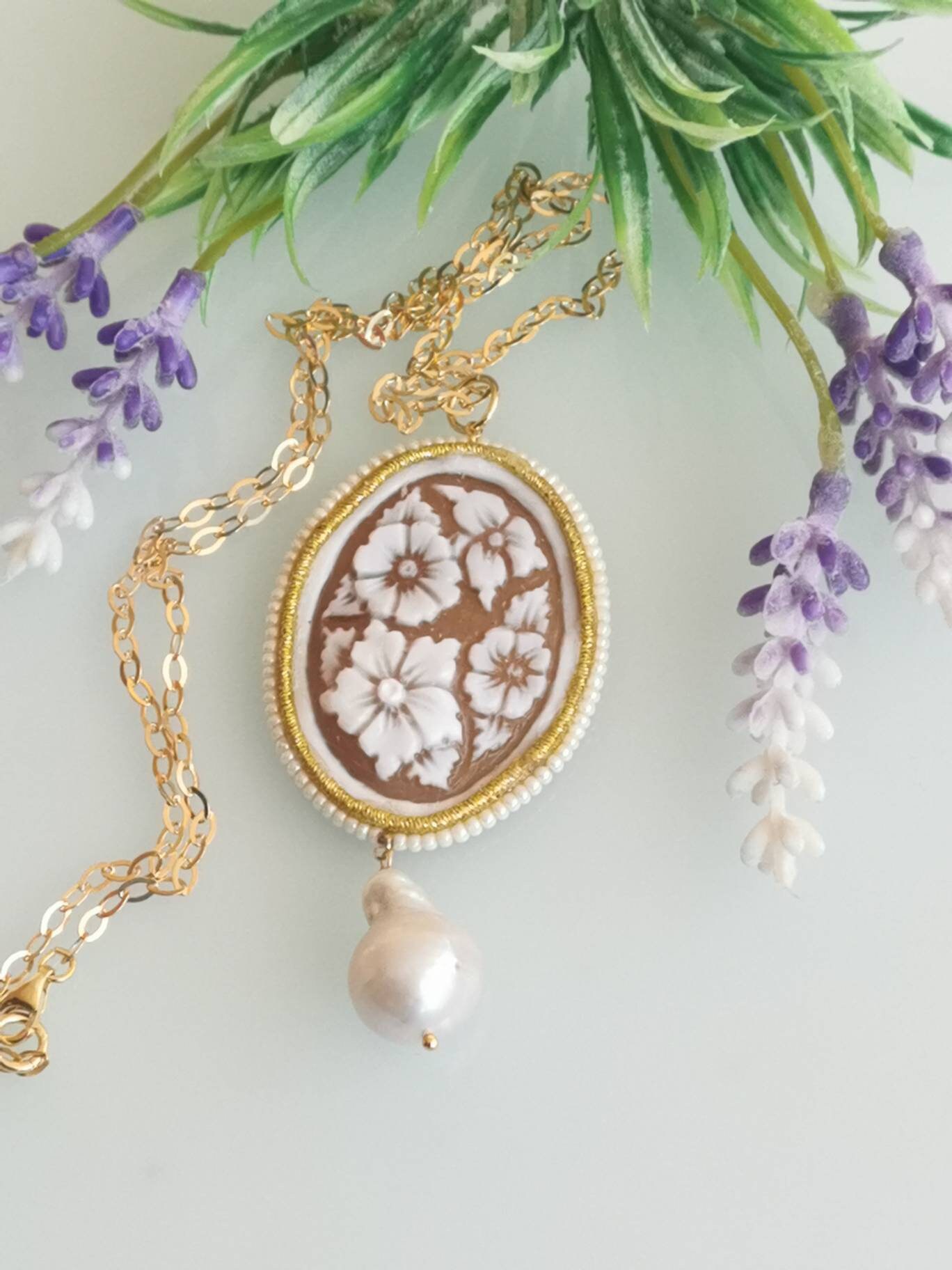 Collana realizzata con cammeo autentico in conchiglia sardonica scolpita a mano a Torre del greco raffigurante fiori , 5×3,8 cm, con cornice perline bianche e perla barocca bianca .