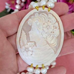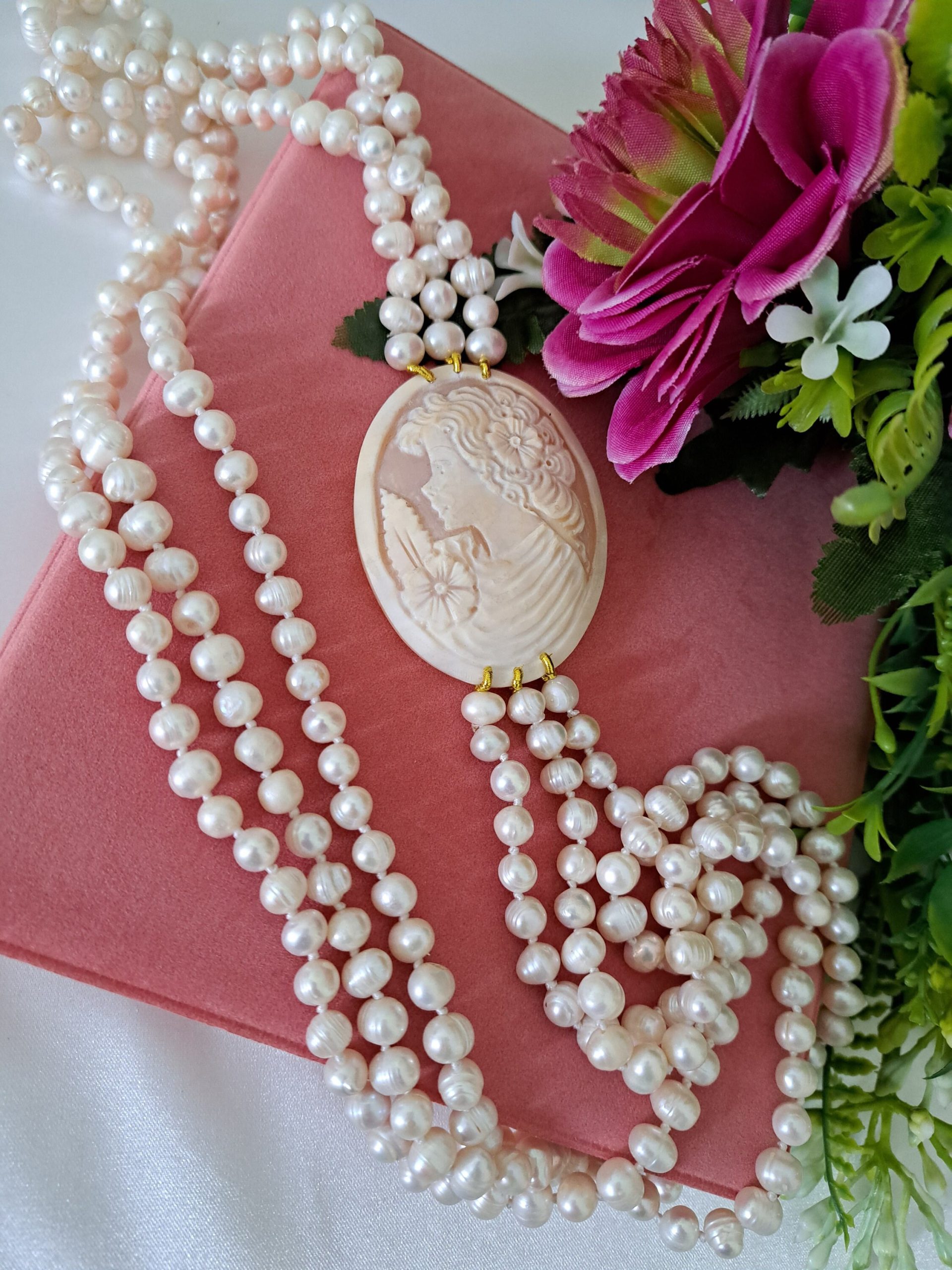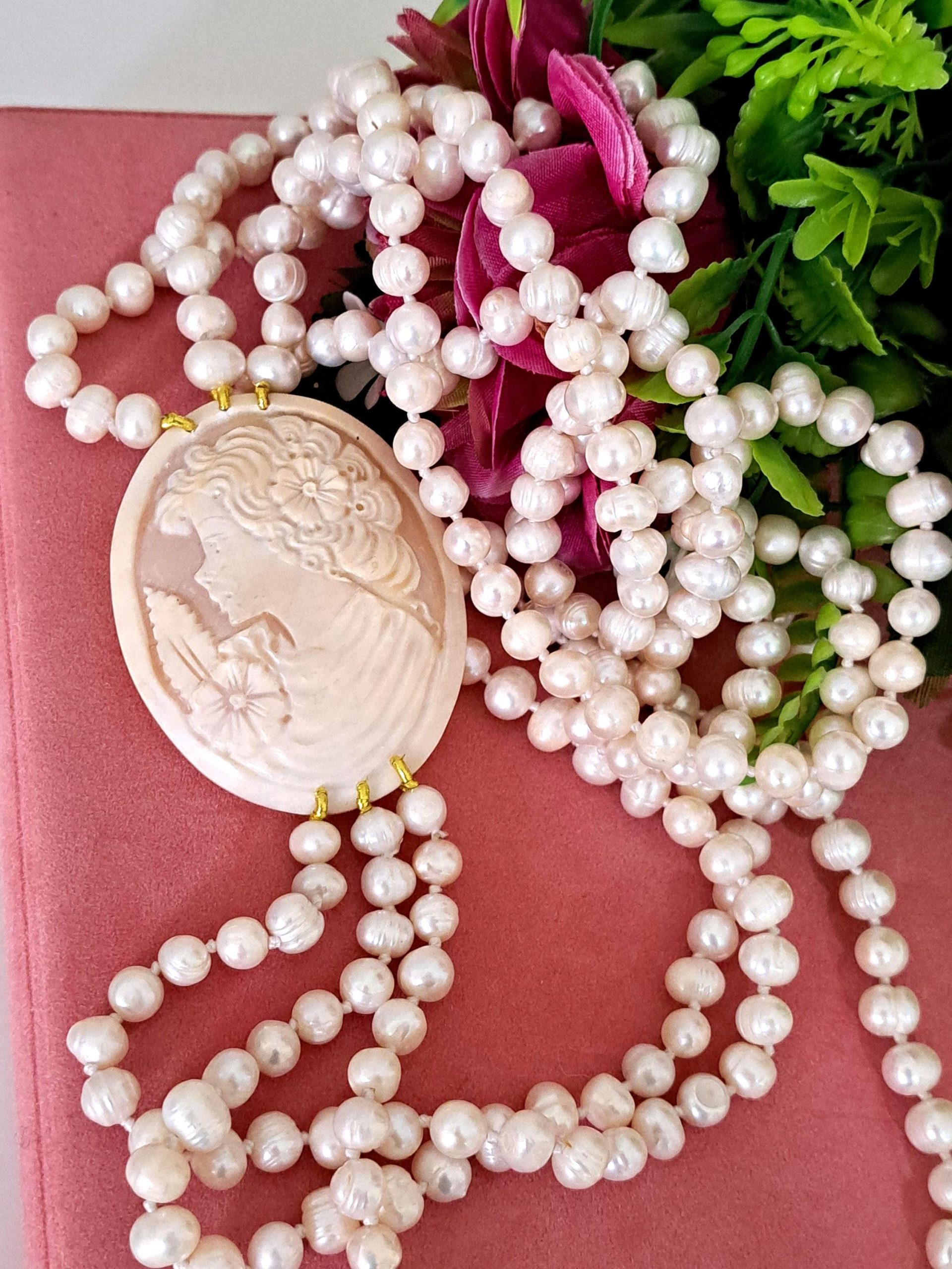 Collana cammeo conchiglia sardonica e perle bianche , collana maxi , gioielli italiani