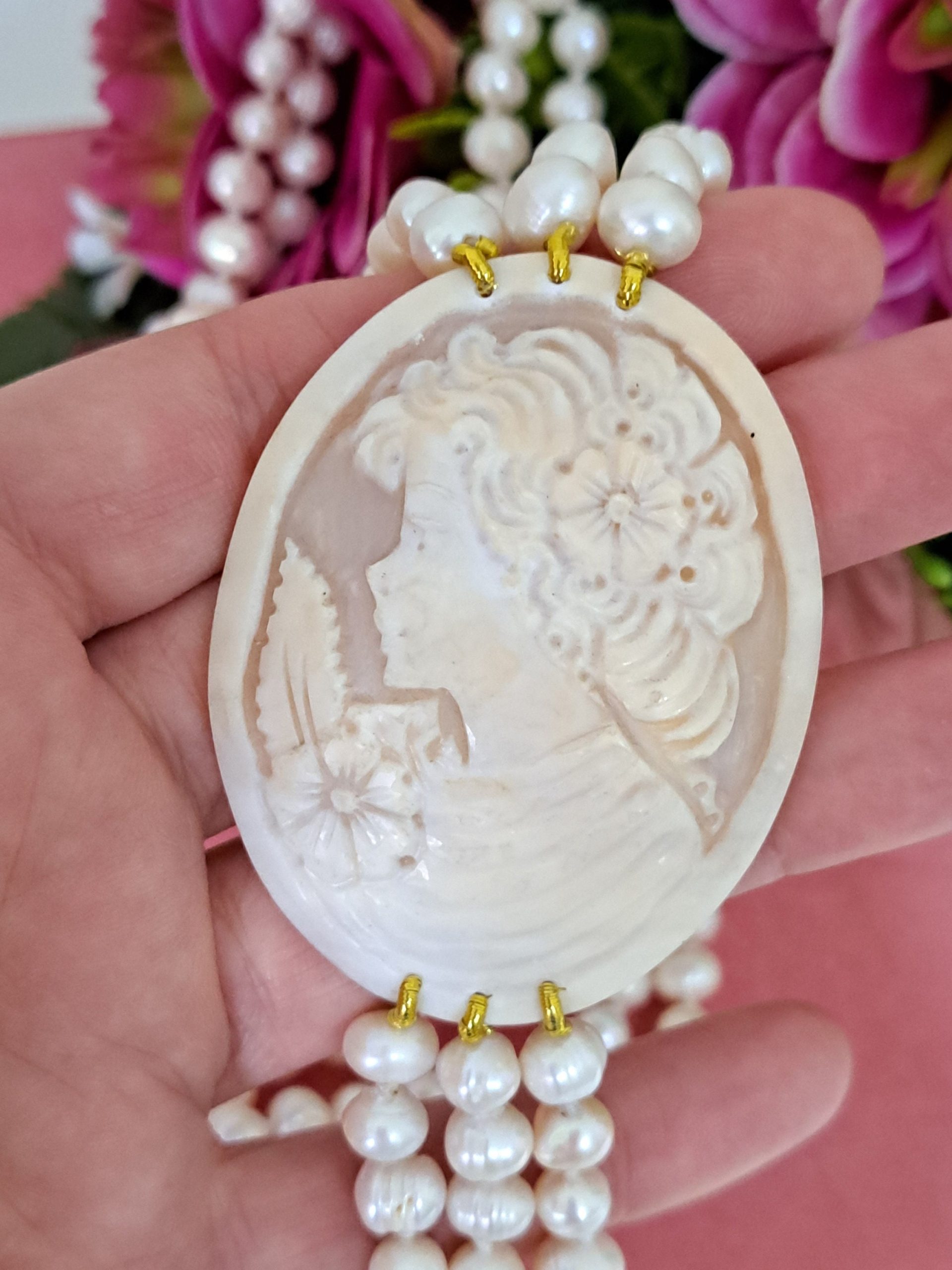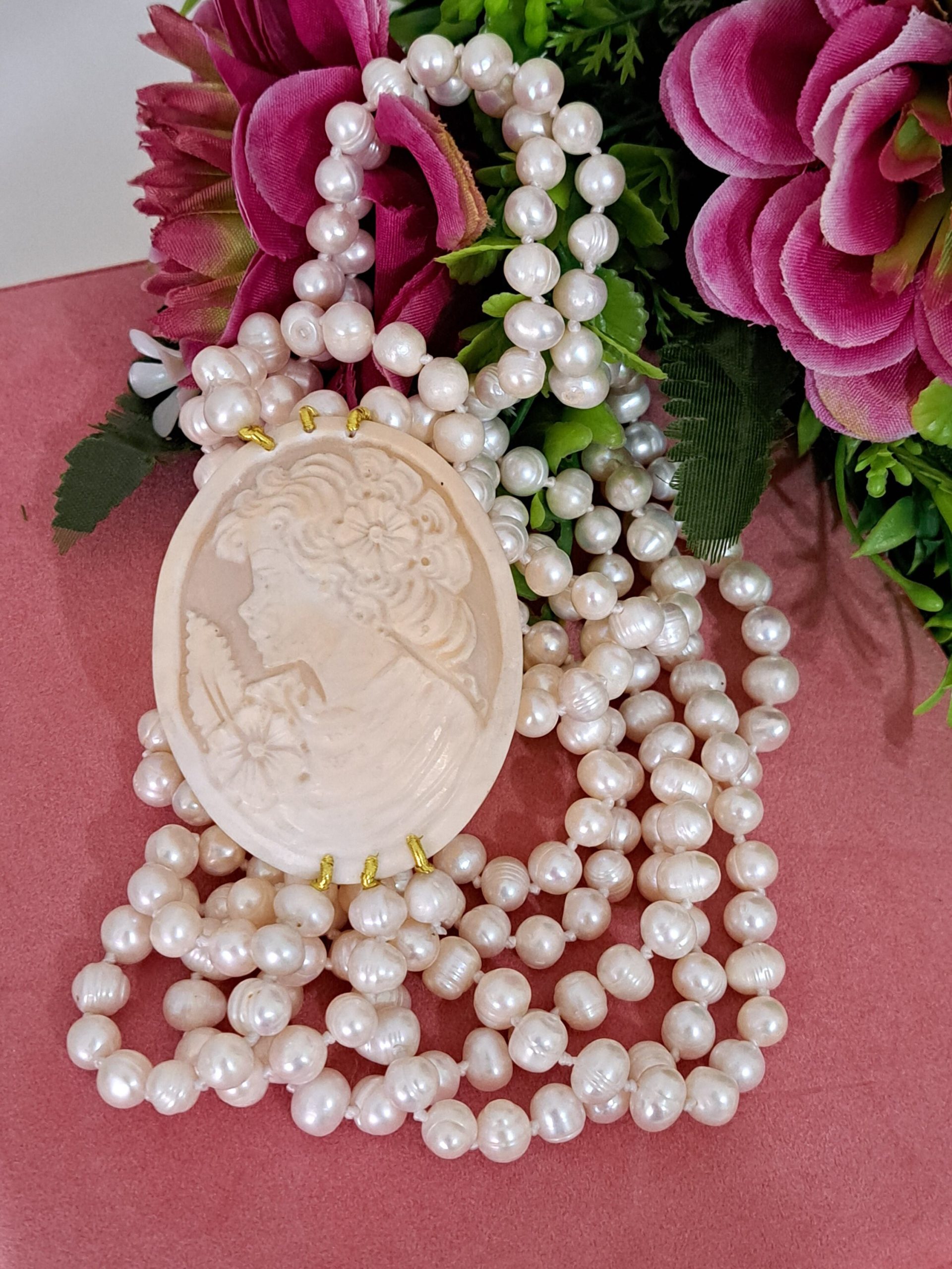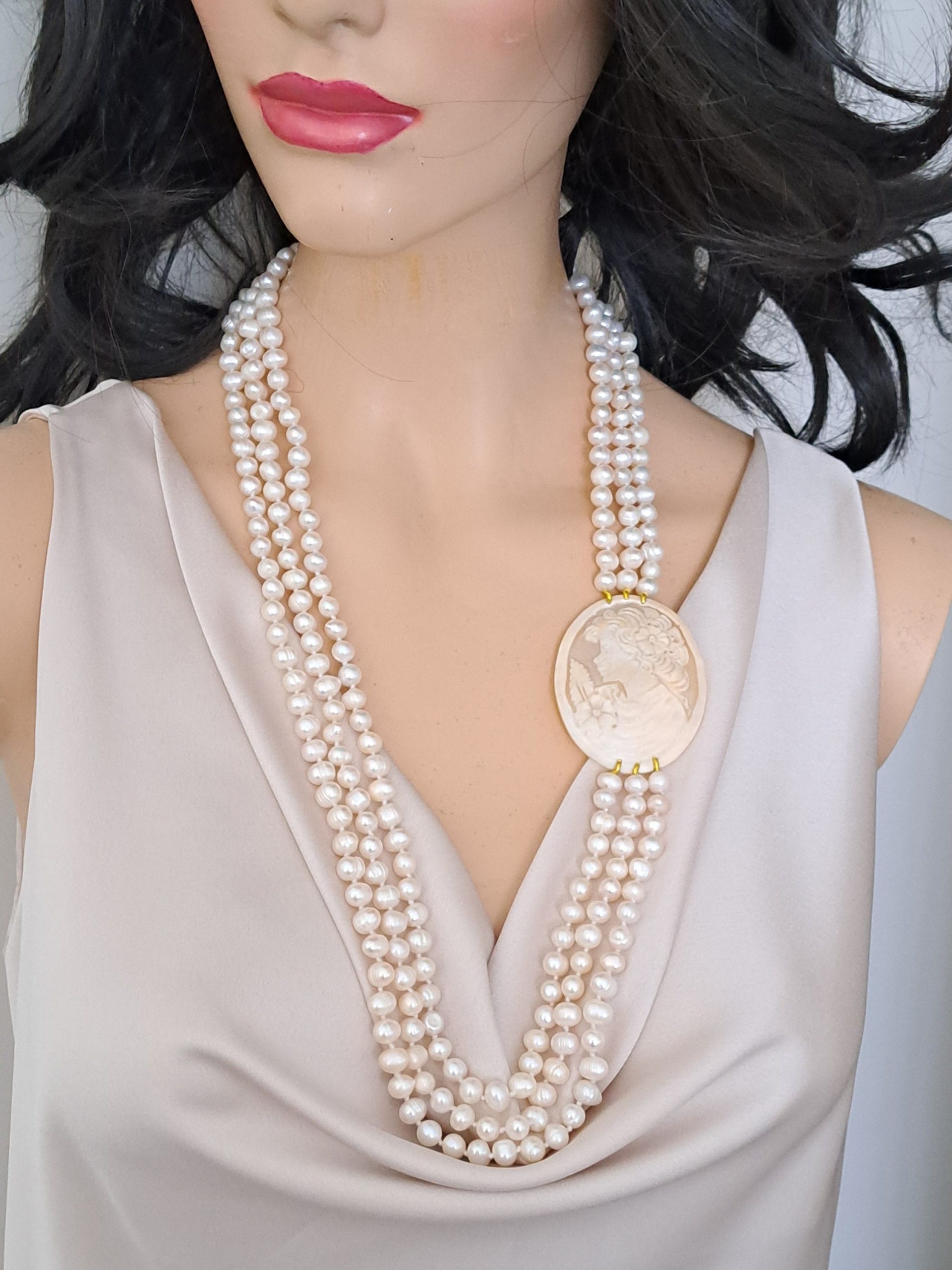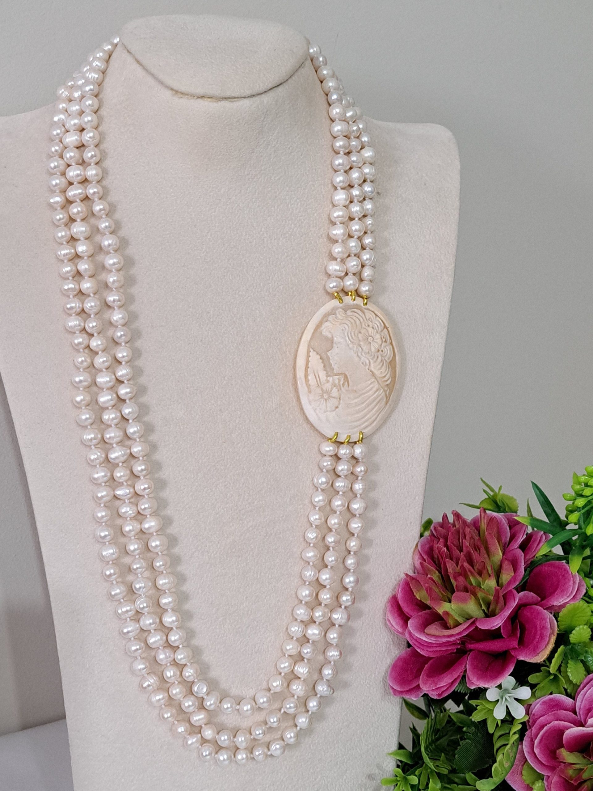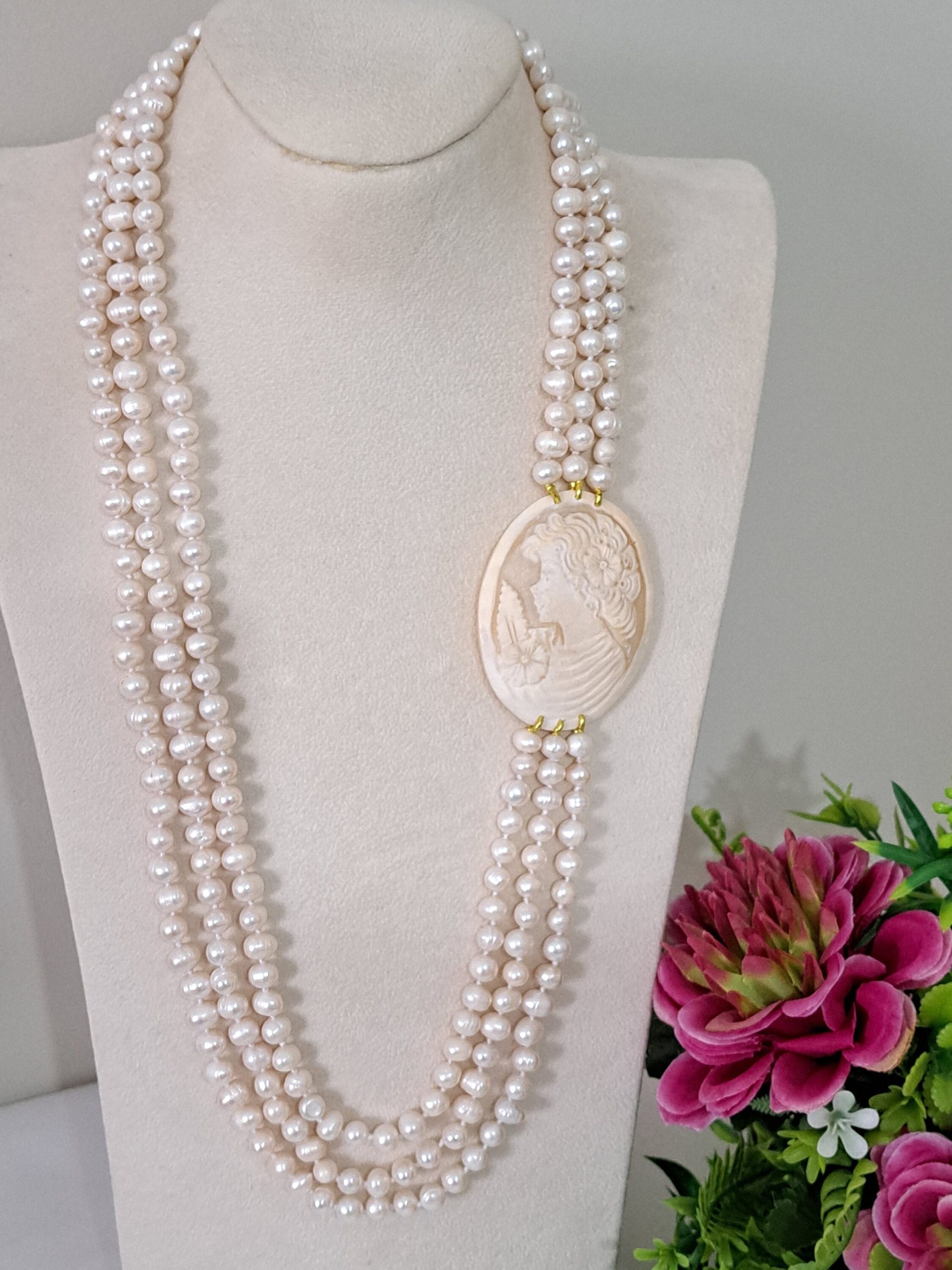 Collana maxi con 3 fili di perle bianche naturali 8 mm annodate a mano e cammeo in conchiglia sardonica scolpito a mano a Torre del greco, raffigurante volto di donna, 6×4,5 cm dimensioni .