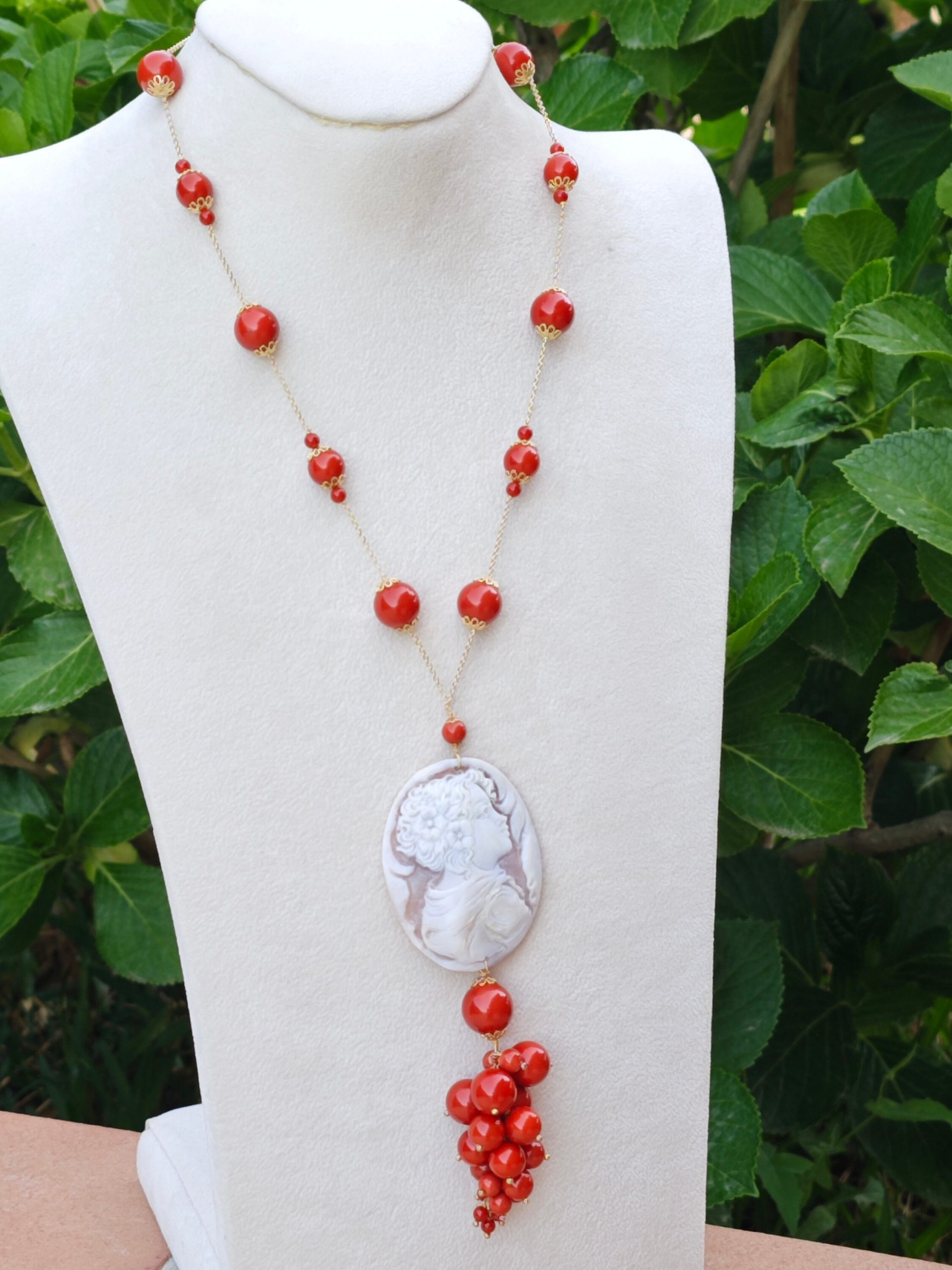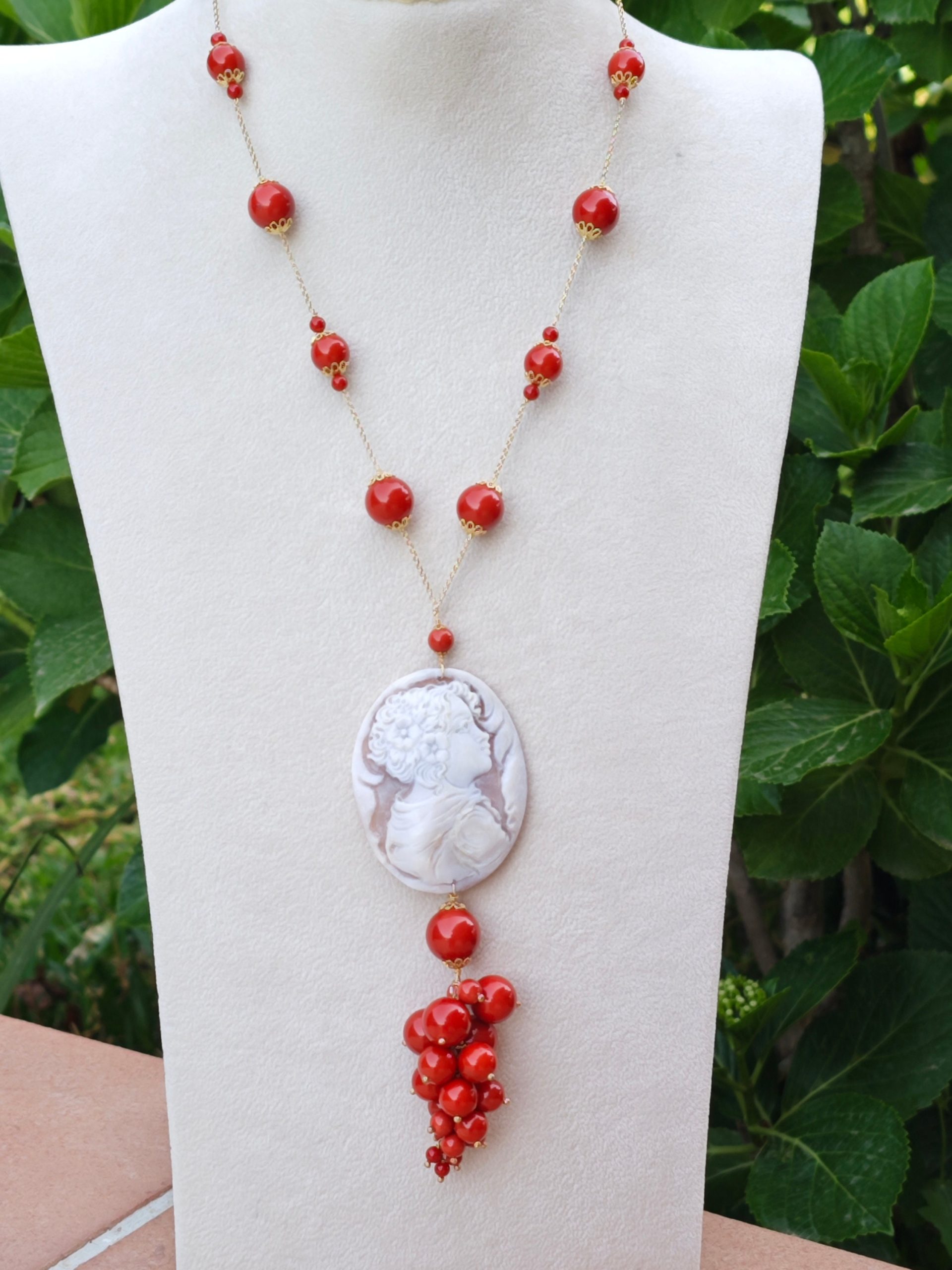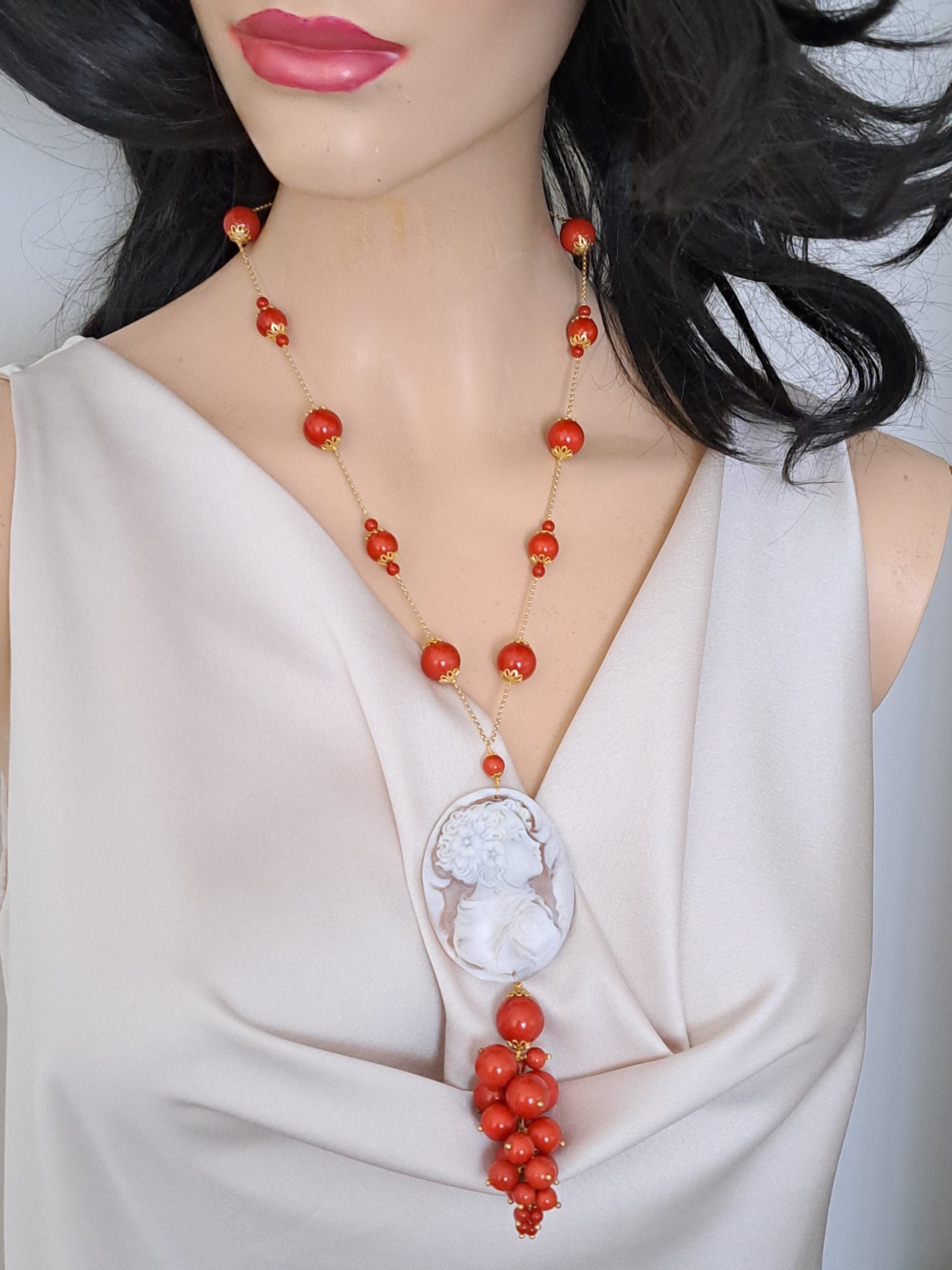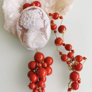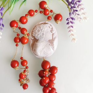 Collana corallo rosso con pendente cammeo conchiglia sardonica e perla barocca, gioielli italiani