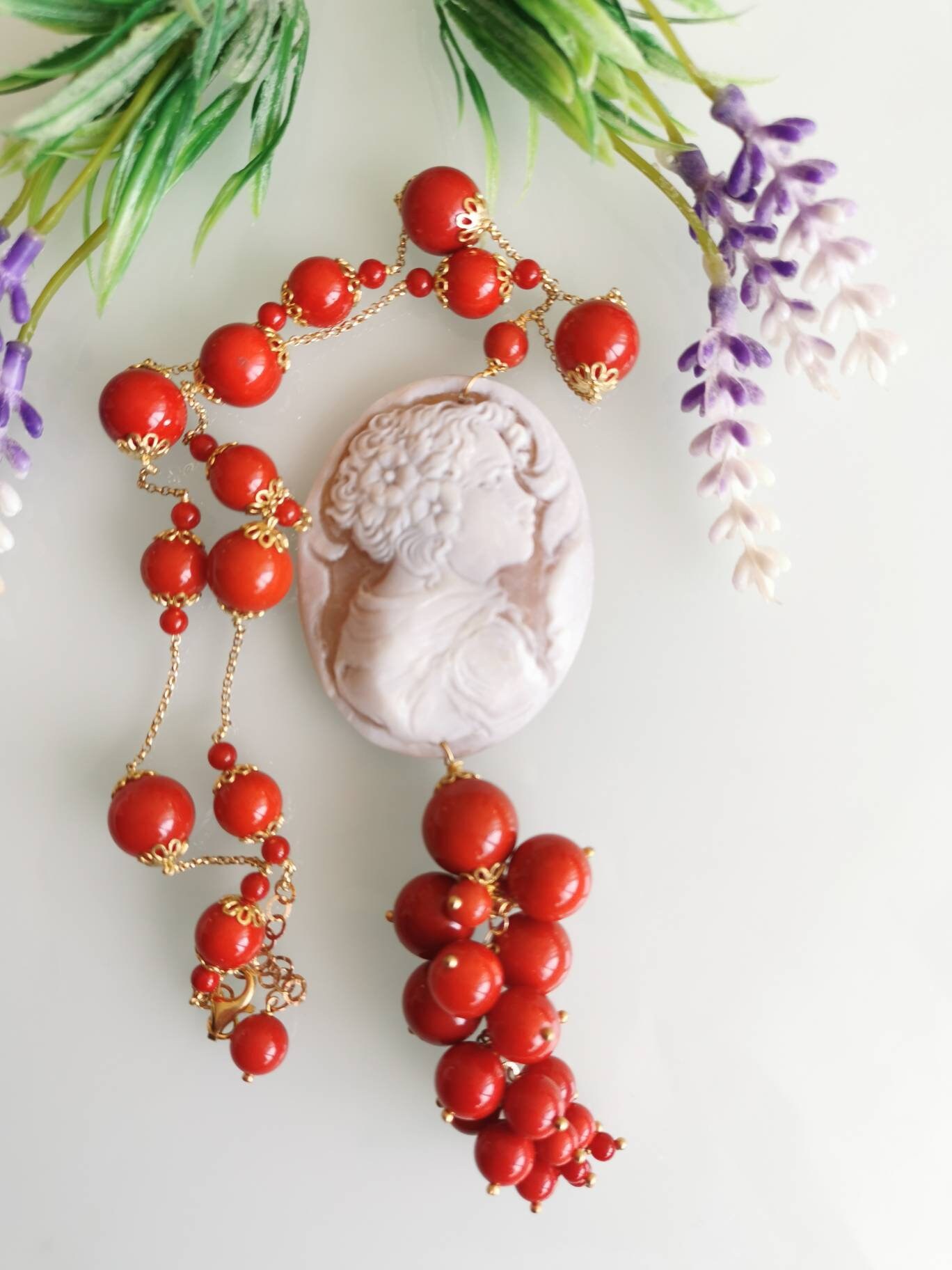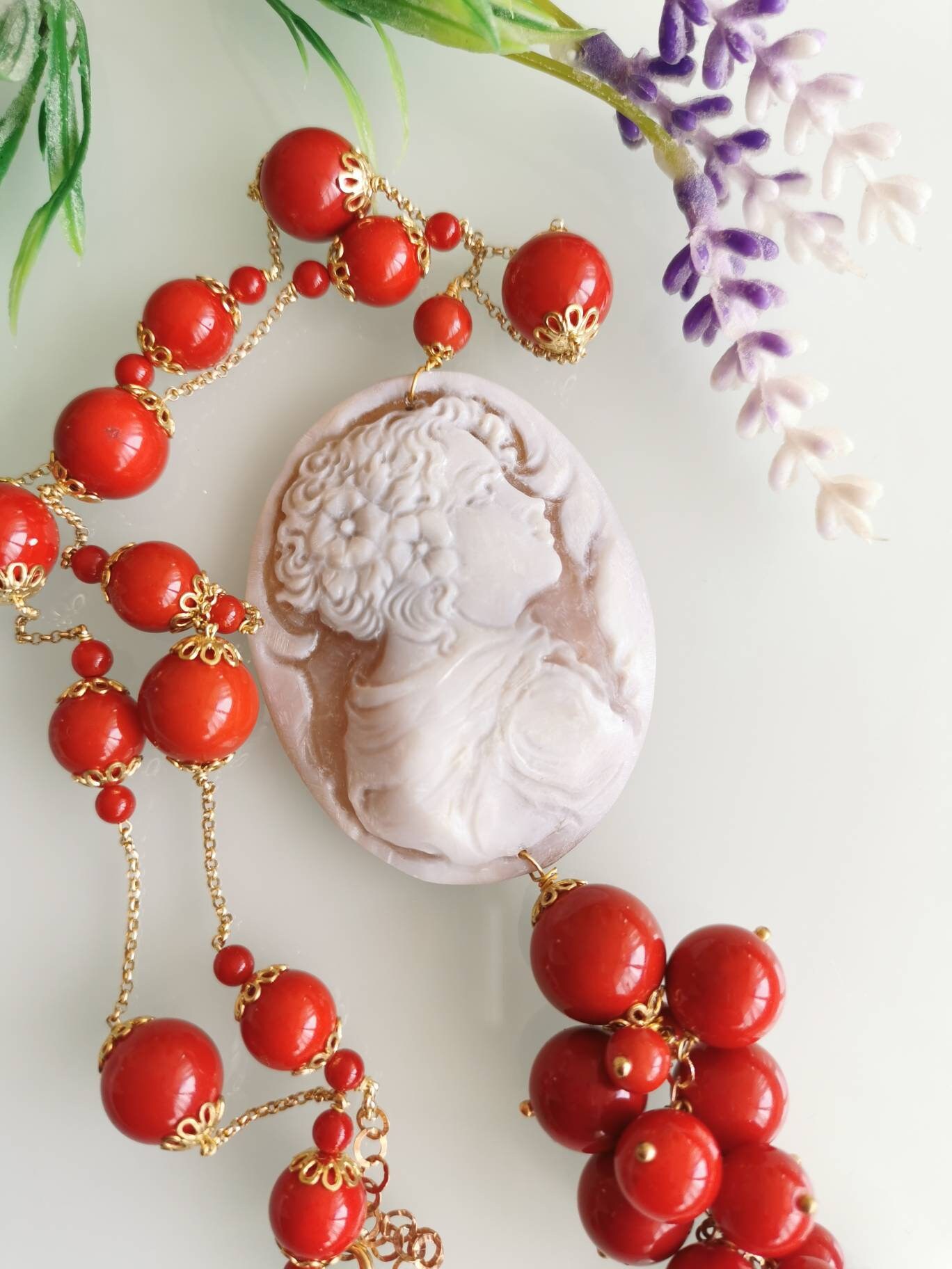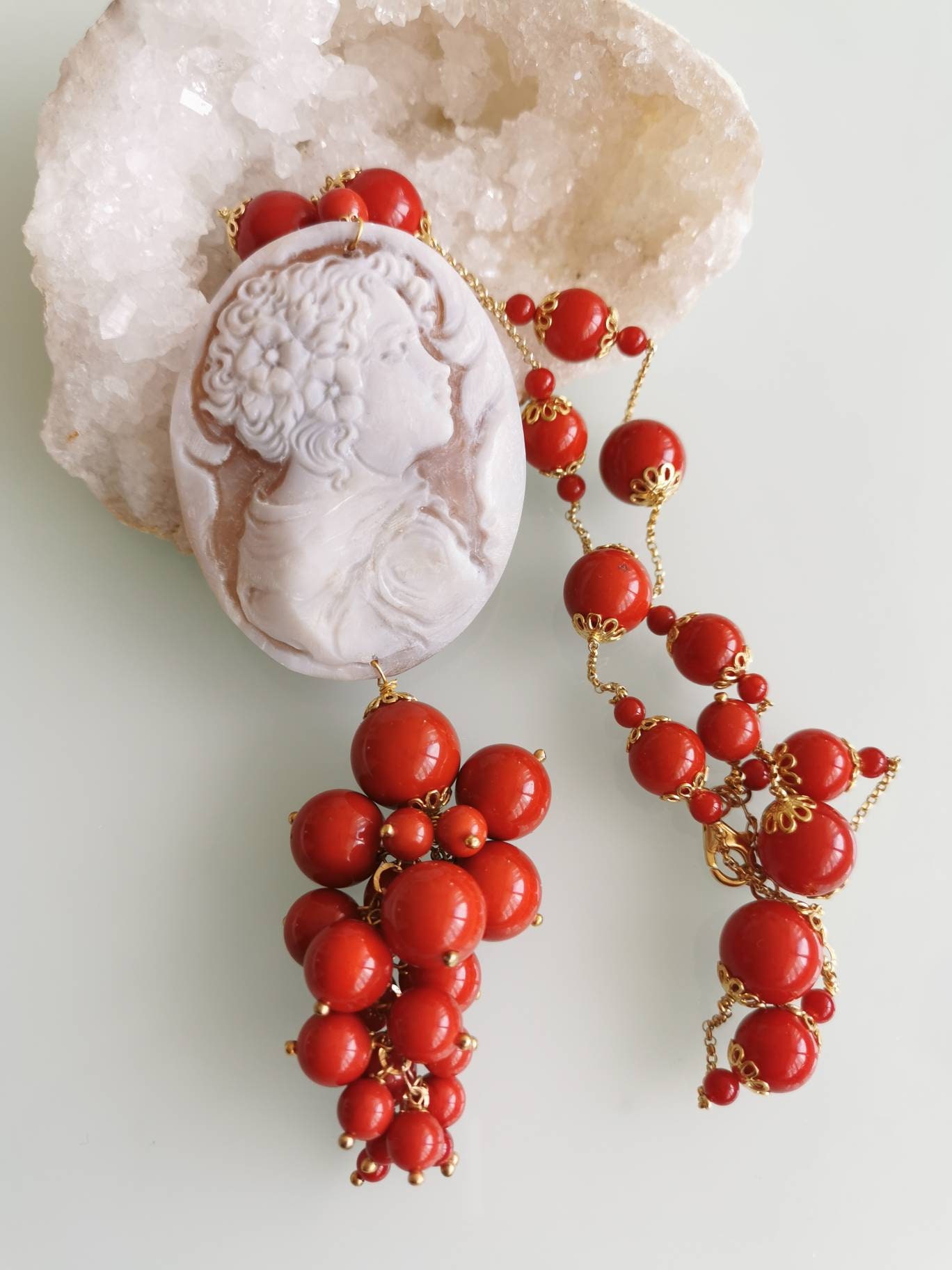 Collana corallo rosso con pendente cammeo conchiglia sardonica e perla barocca, gioielli italiani