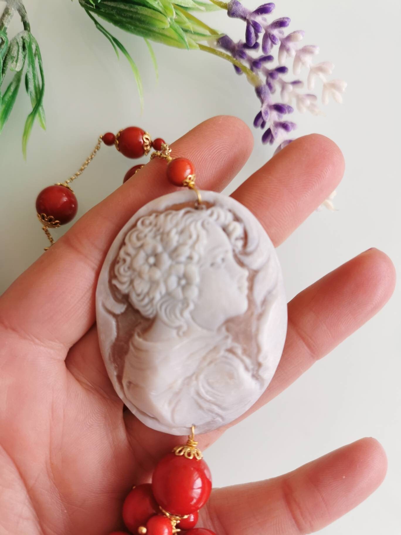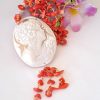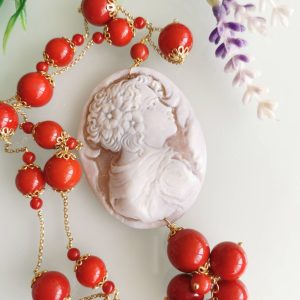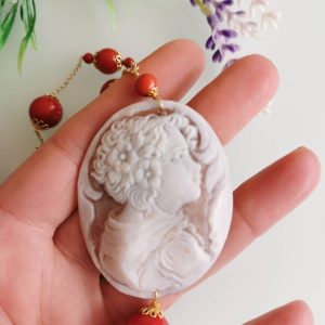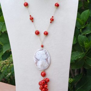 Collana realizzata con cammeo autentico in conchiglia sardonica scolpita a mano a Torre del greco raffigurante volto di donna, 5,5×4,5 cm dimensioni , perle pasta di corallo rosso imitazione . Catenina e moschettone in argento 925 placcato oro.