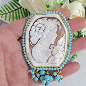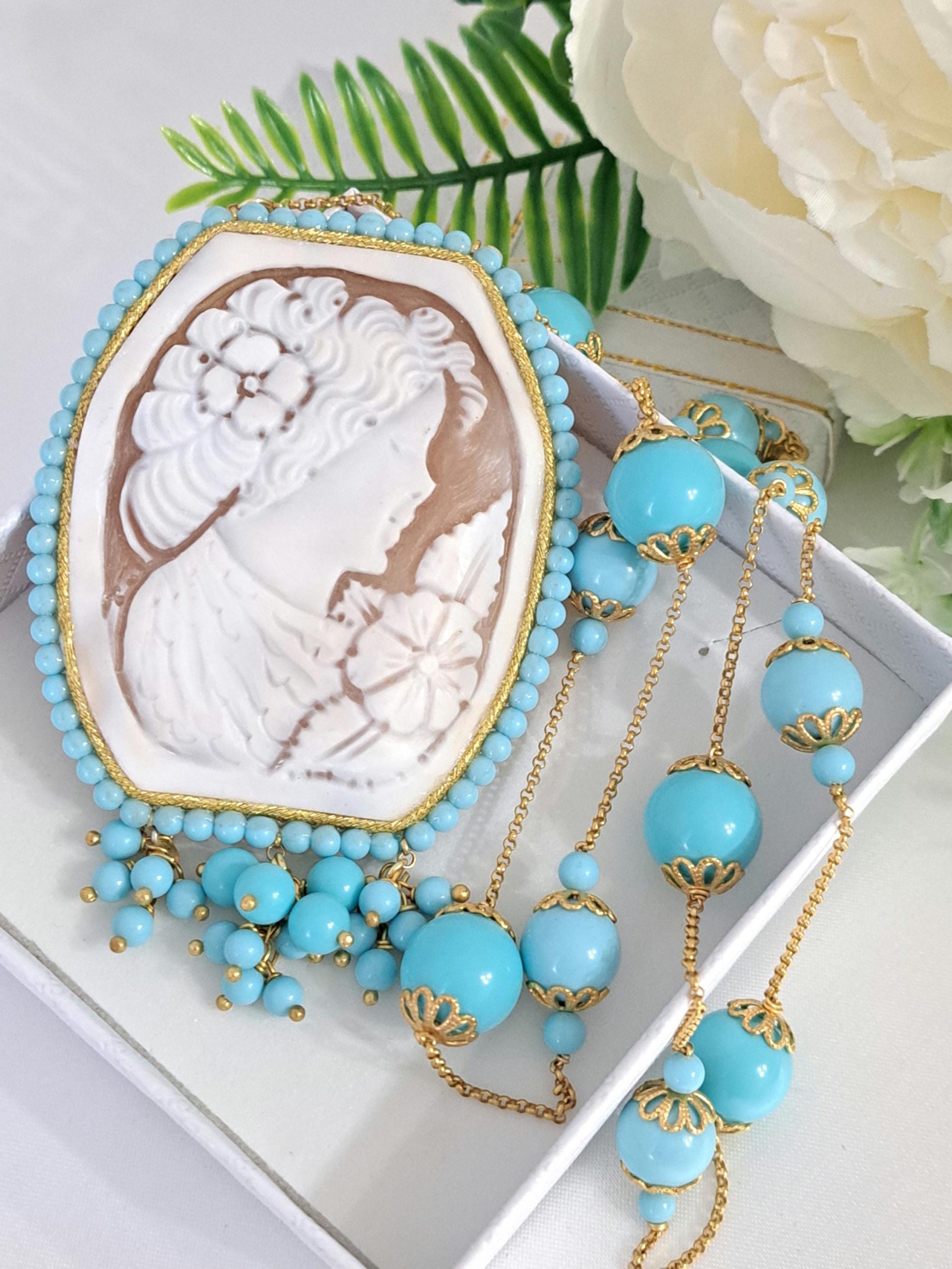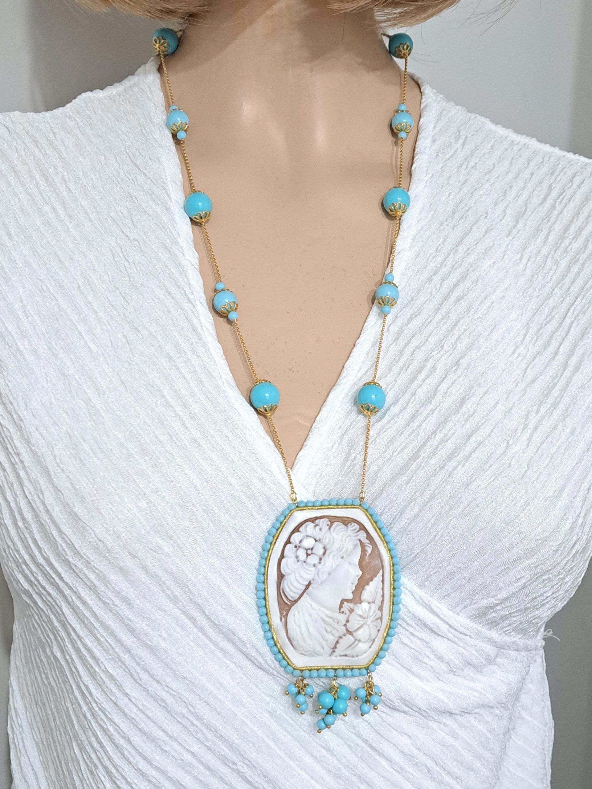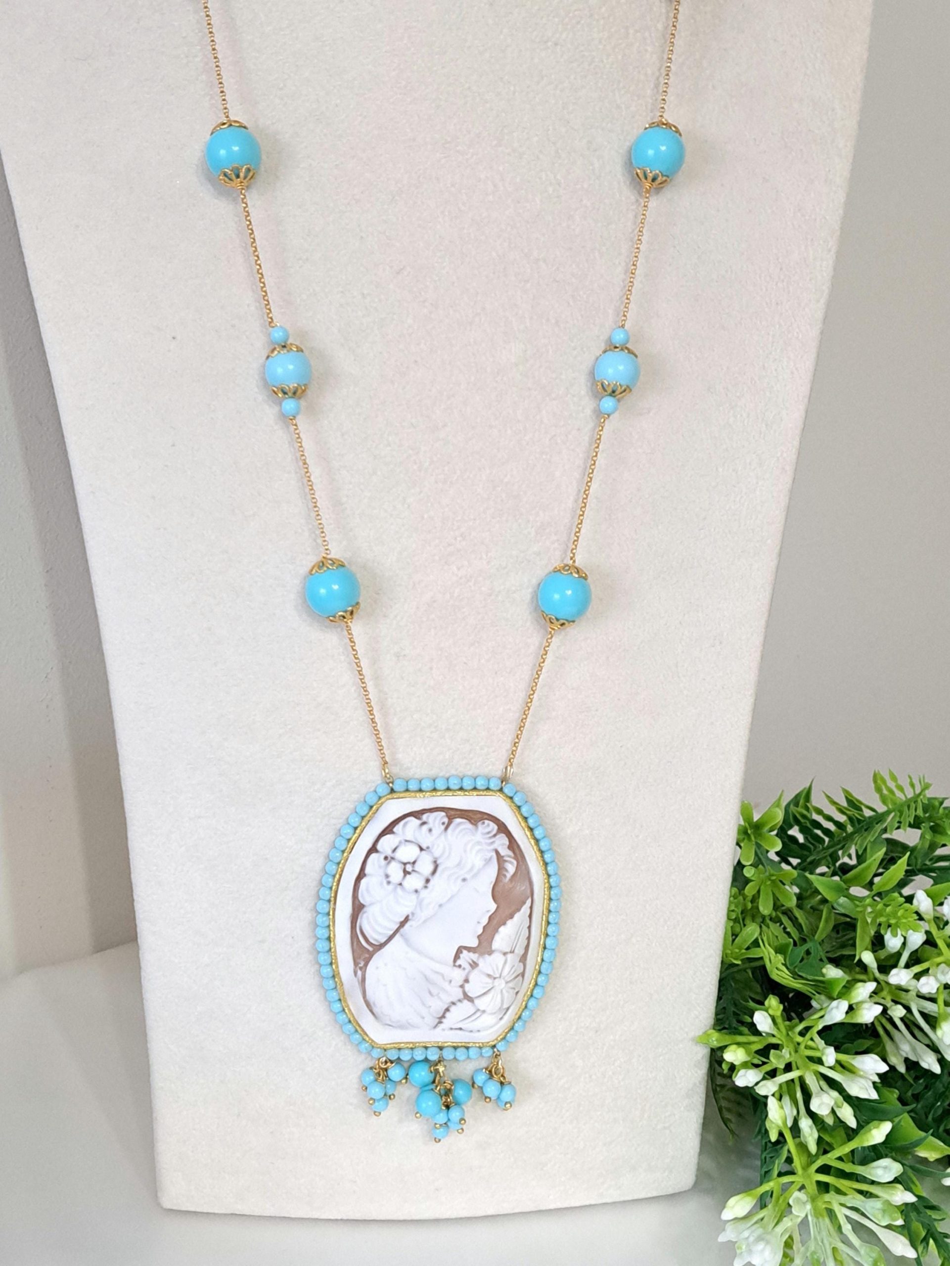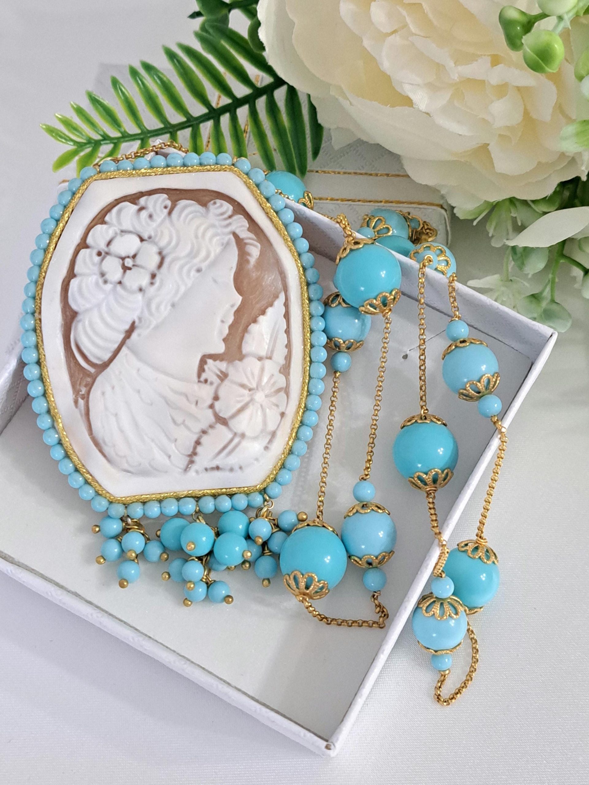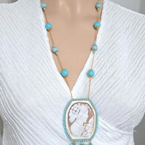 Collana realizzata con perle pasta di turchese imitazione e pendente cammeo autentico in conchiglia sardonica scolpita a mano a Torre del greco raffigurante volto di donna, 6,5×5,5 cm dimensioni con cornice perline pasta di turchese.