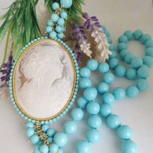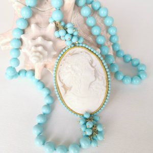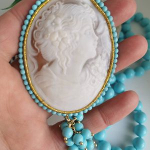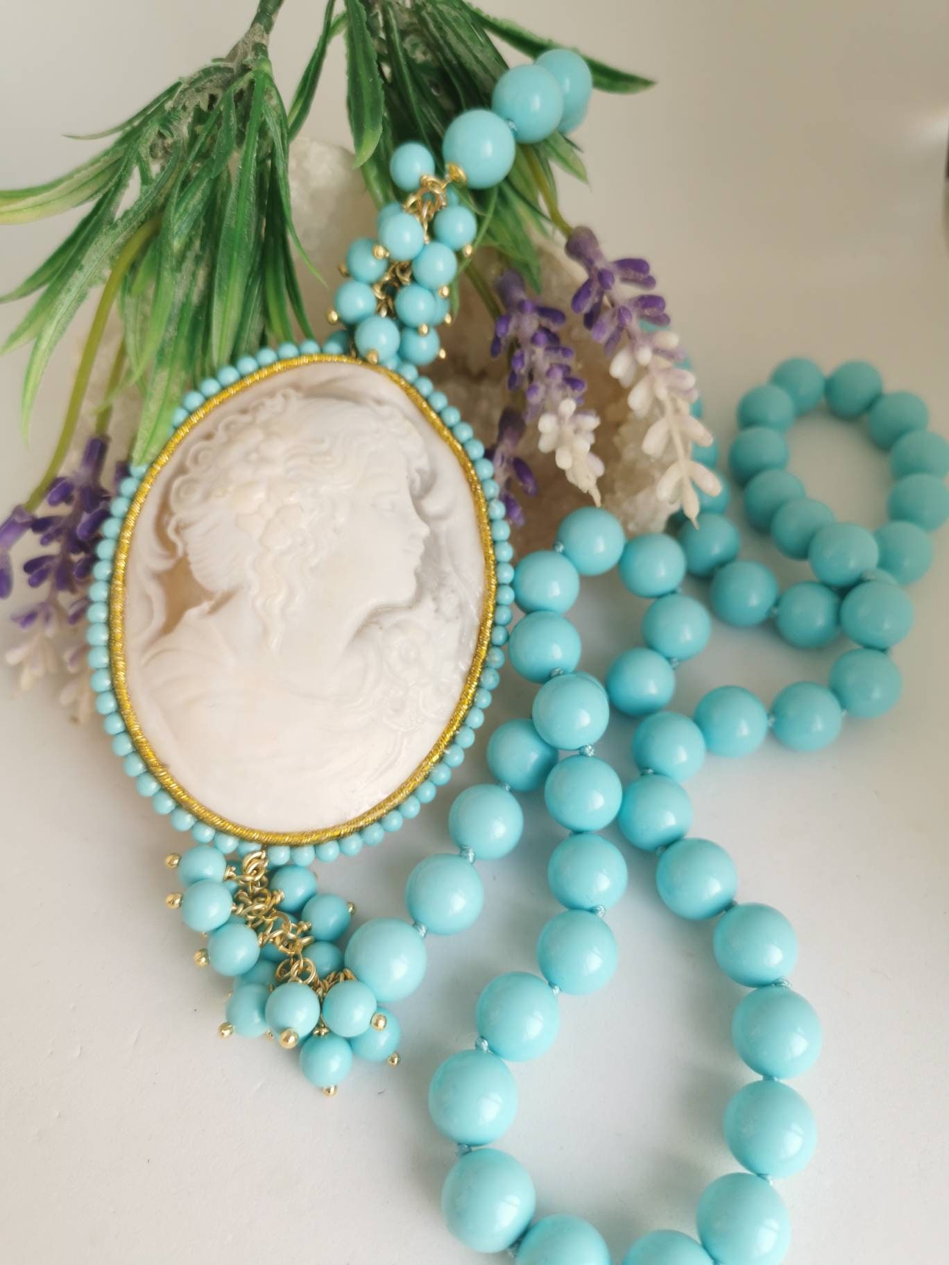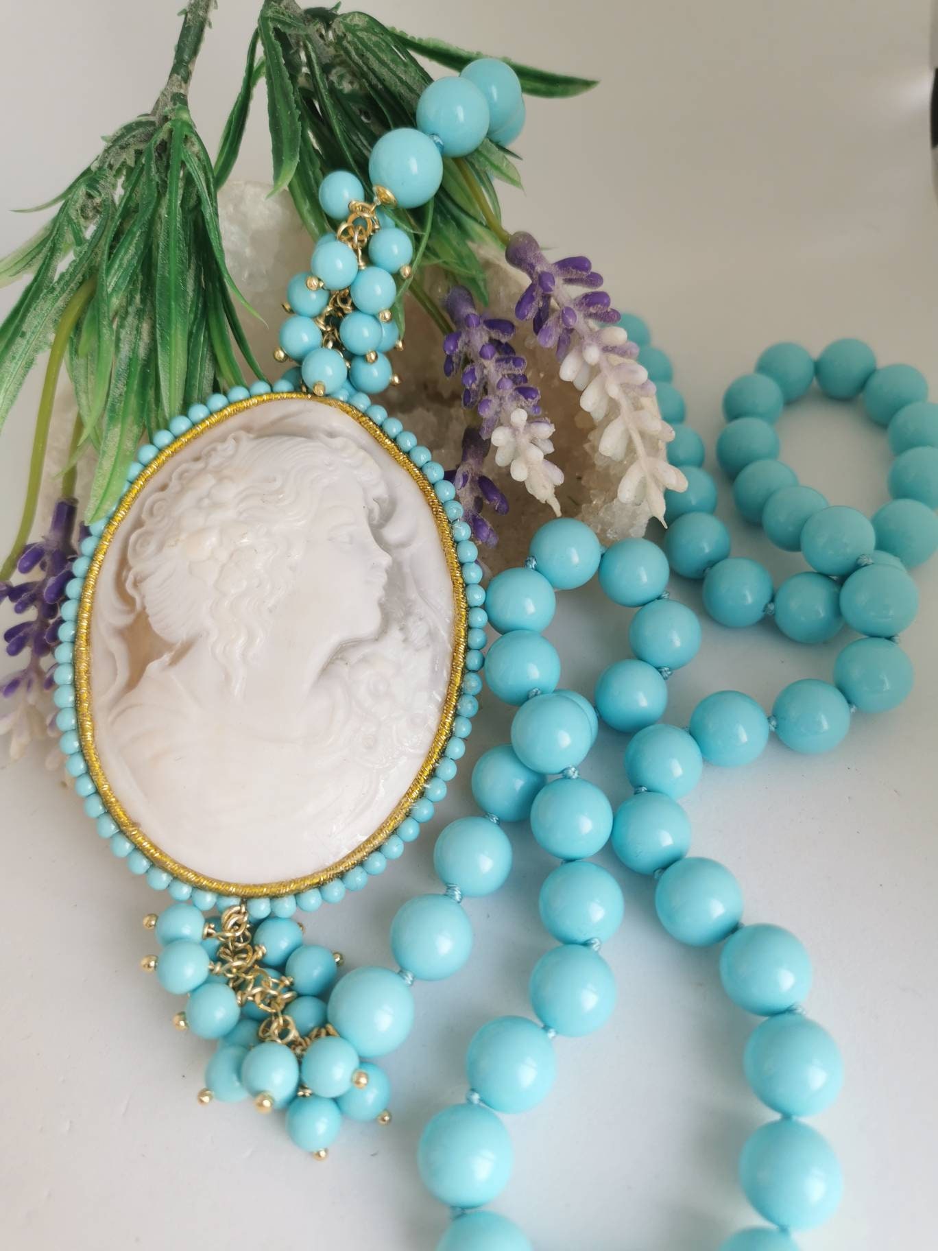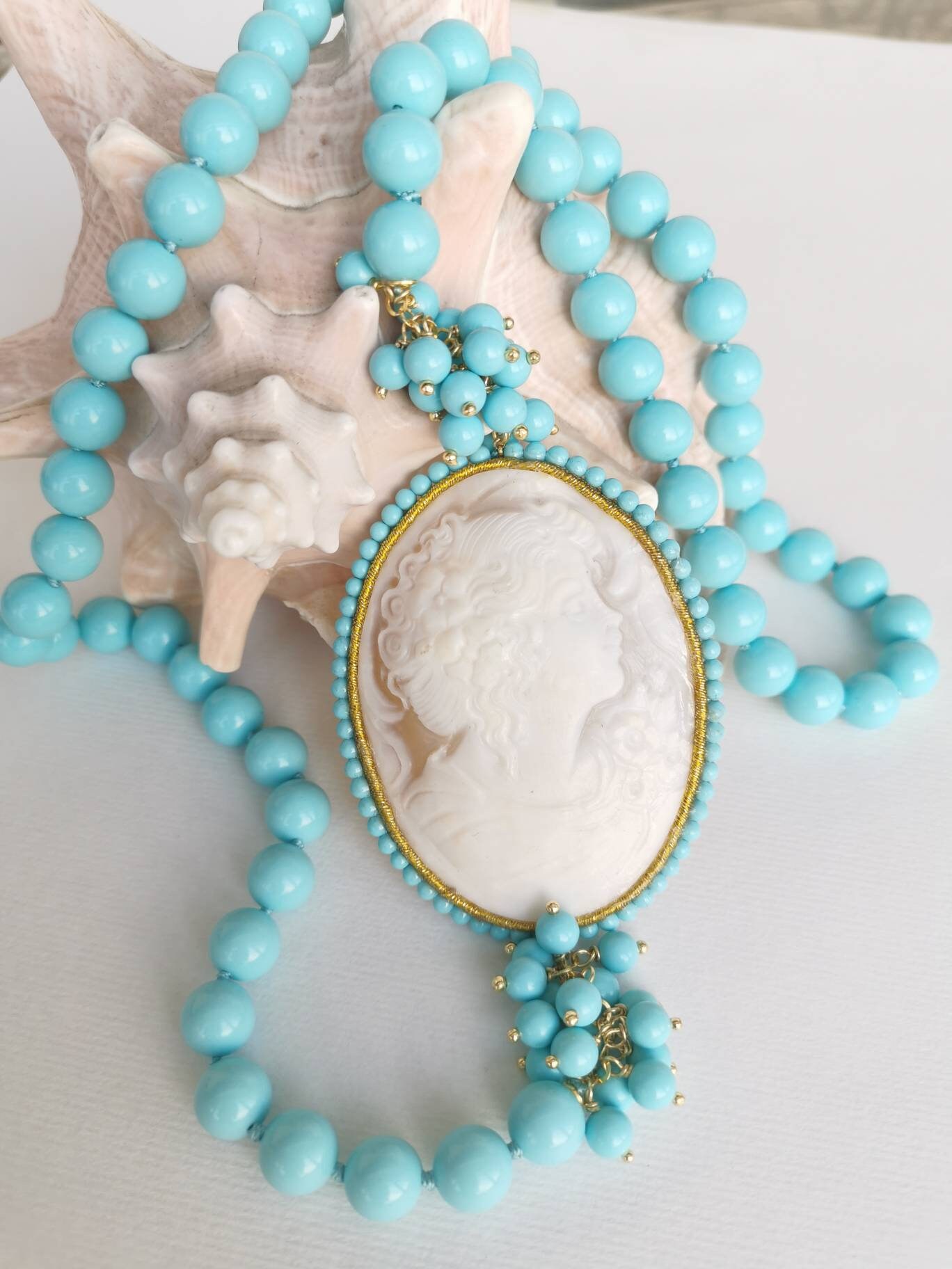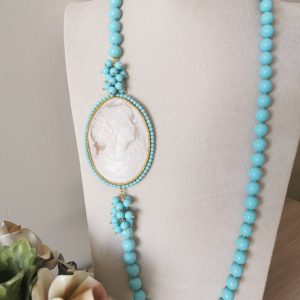 Collana cammeo conchiglia sardonica e perle turchese , gioielli italiani