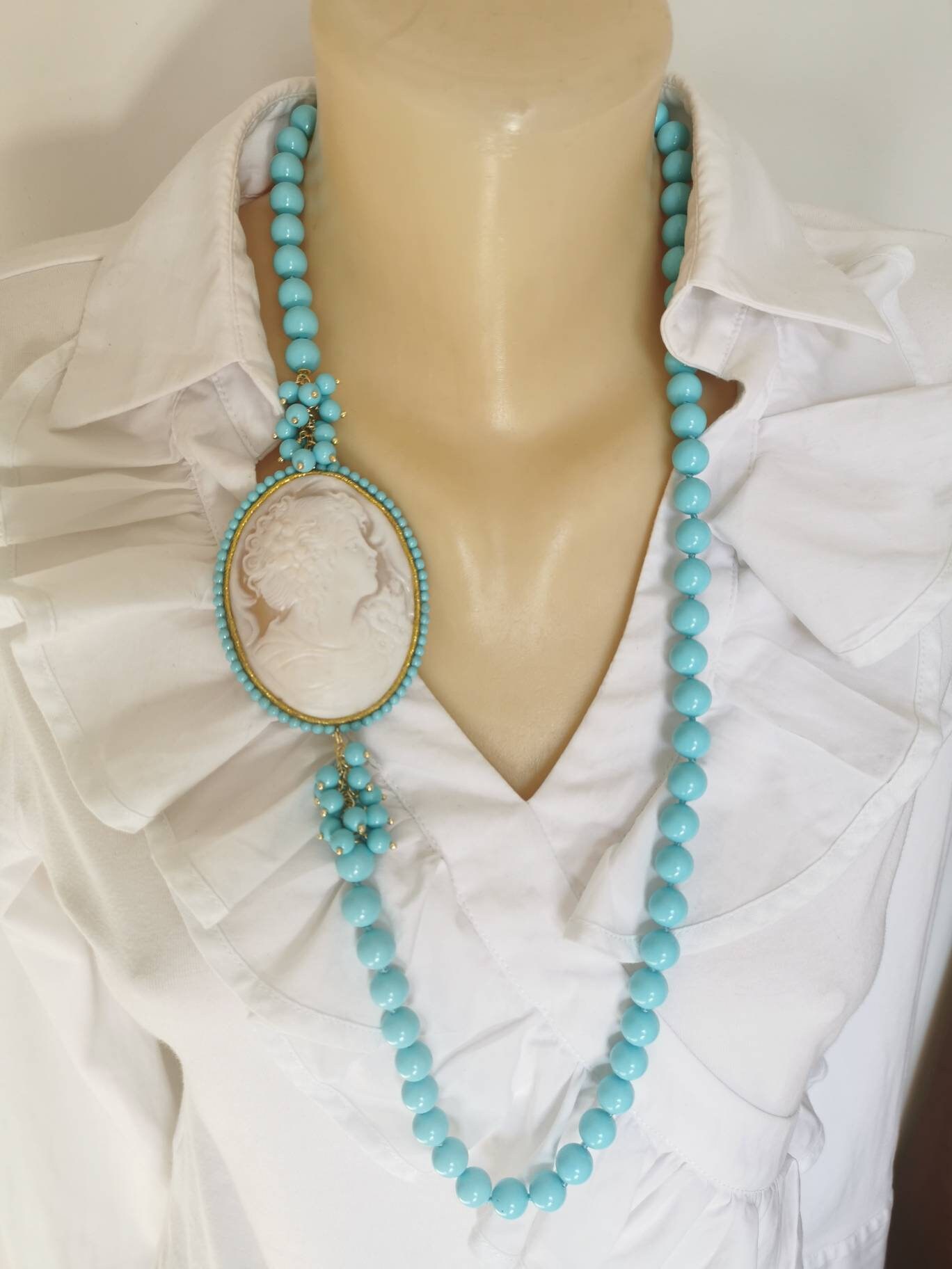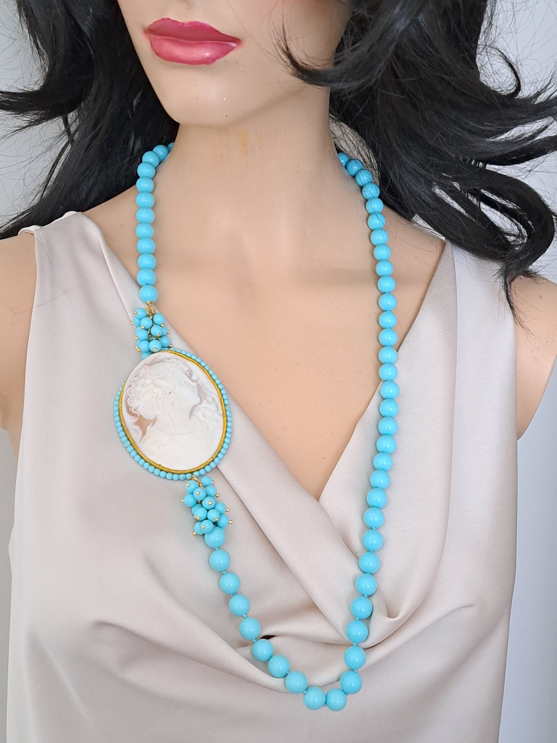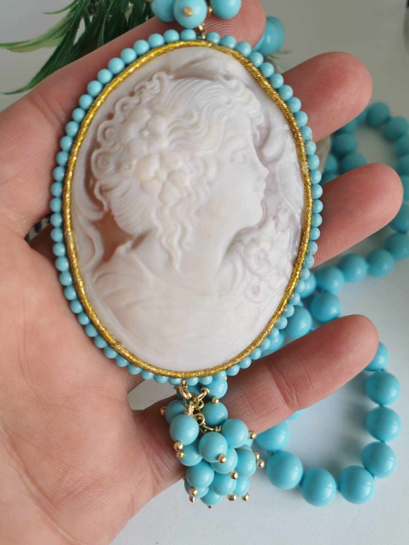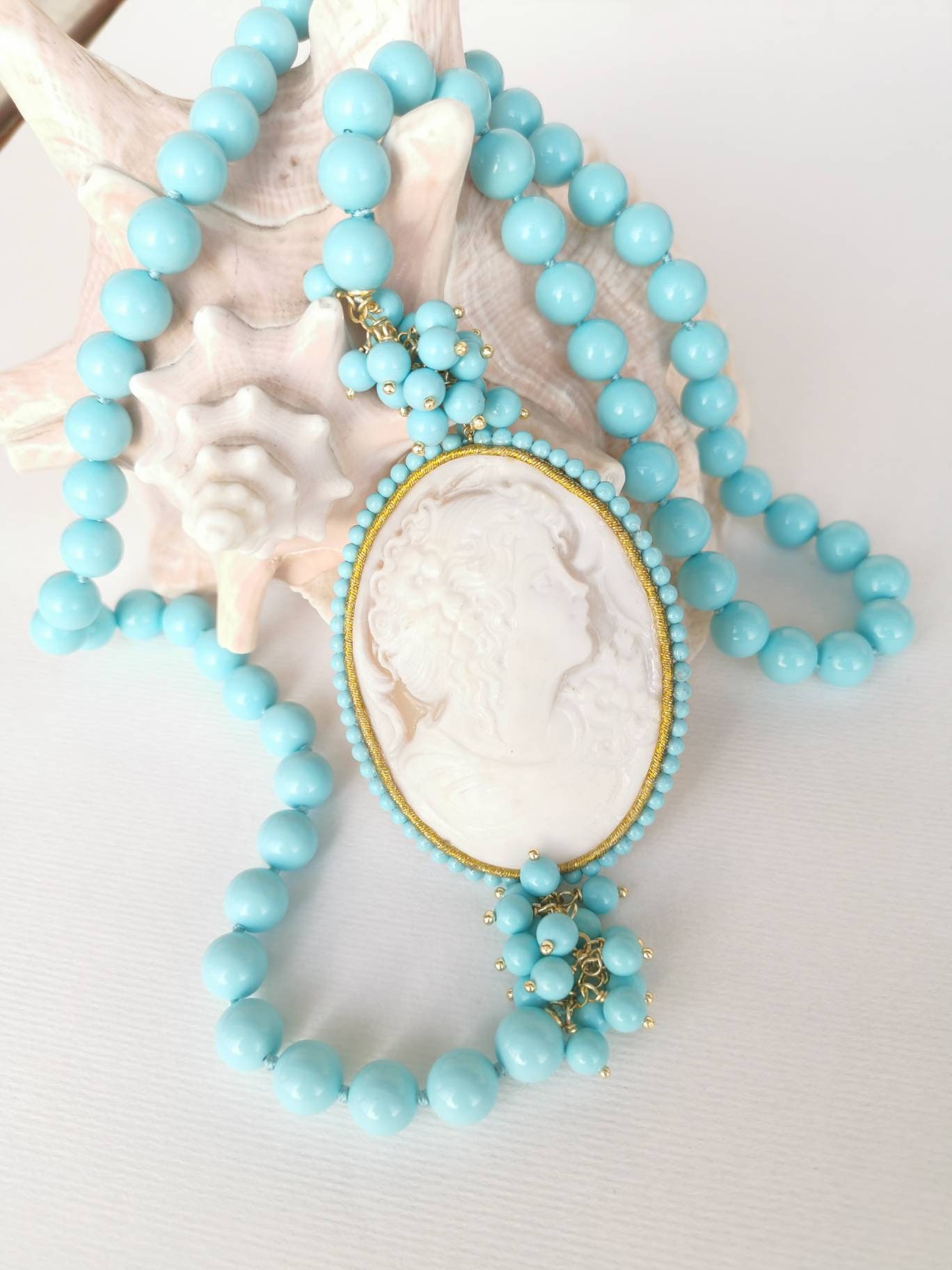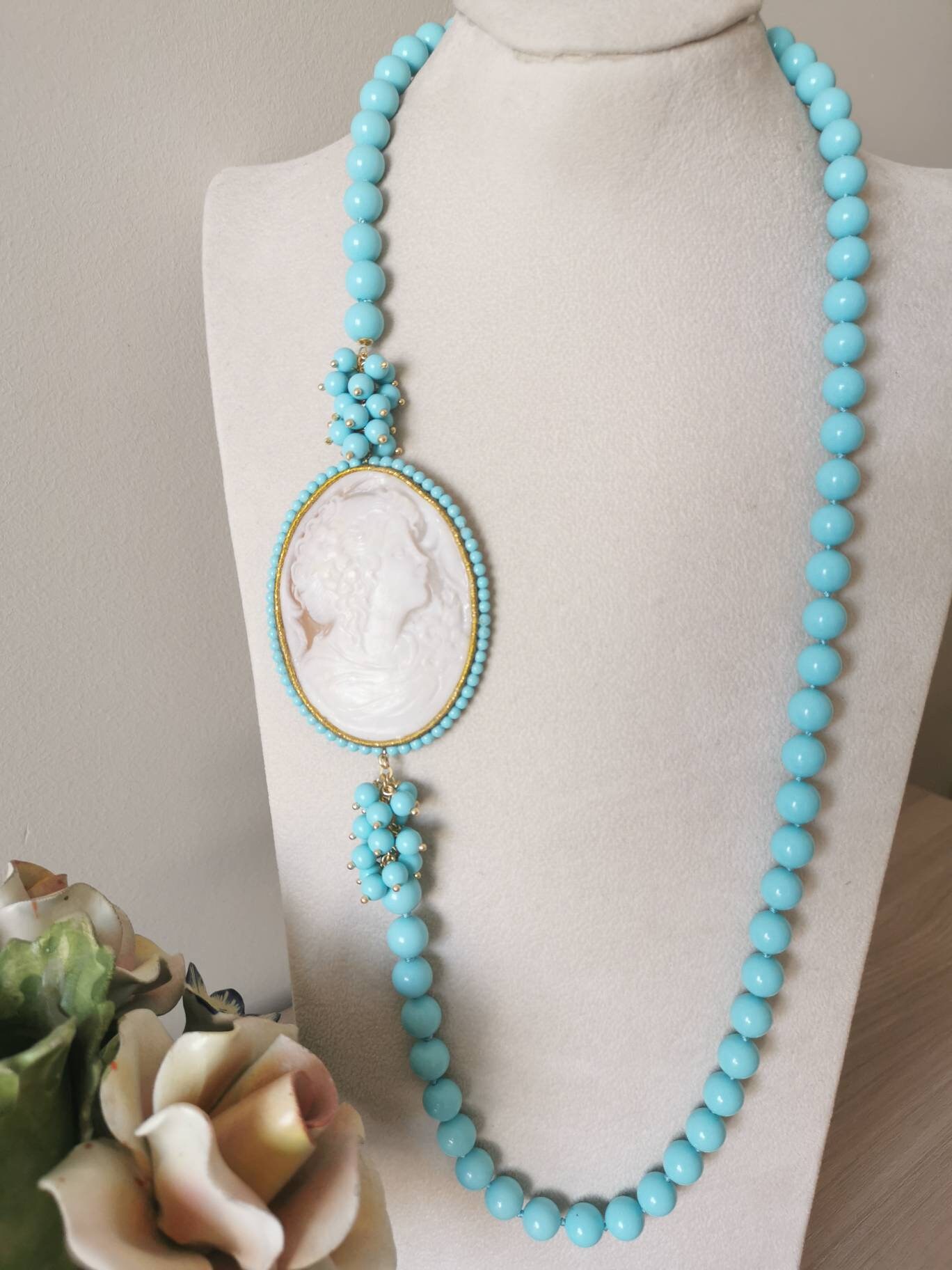 Collana annodata a mano con perle pasta di turchese 10 mm e con cammeo autentico in conchiglia sardonica scolpita a mano a Torre del greco raffigurante volto di donna, 7×5 cm con cornice perline pasta di turchese
