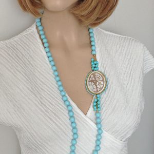 Collana cammeo ceramica di Caltagirone con pietre dure giada celeste, gioielli italiani