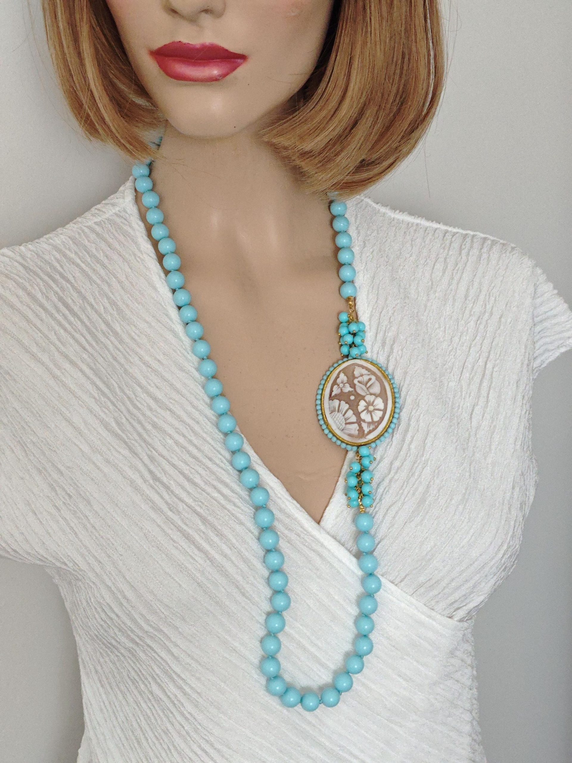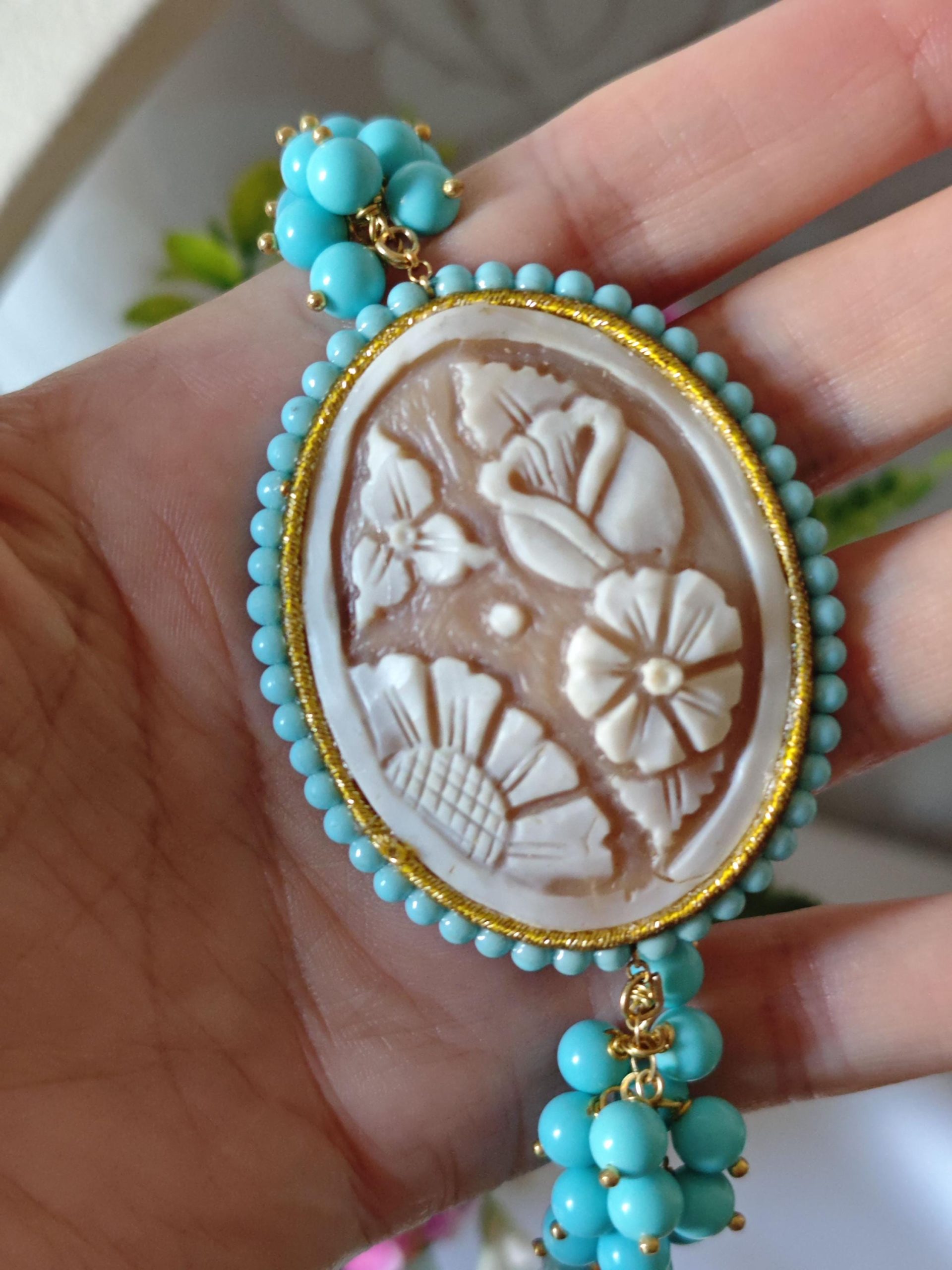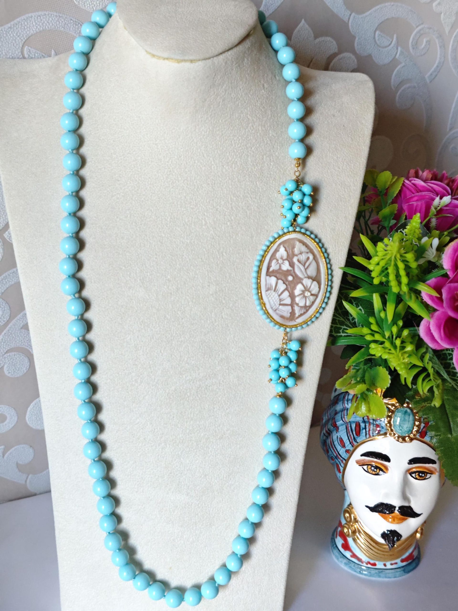Collana annodata a mano con perle pasta di turchese imitazione 12 mm e con cammeo autentico in conchiglia sardonica scolpita a mano a Torre del greco raffigurante fiori, 5,5×4,5 cm dimensioni, con cornice perline e grappolo perle pasta di turchese.