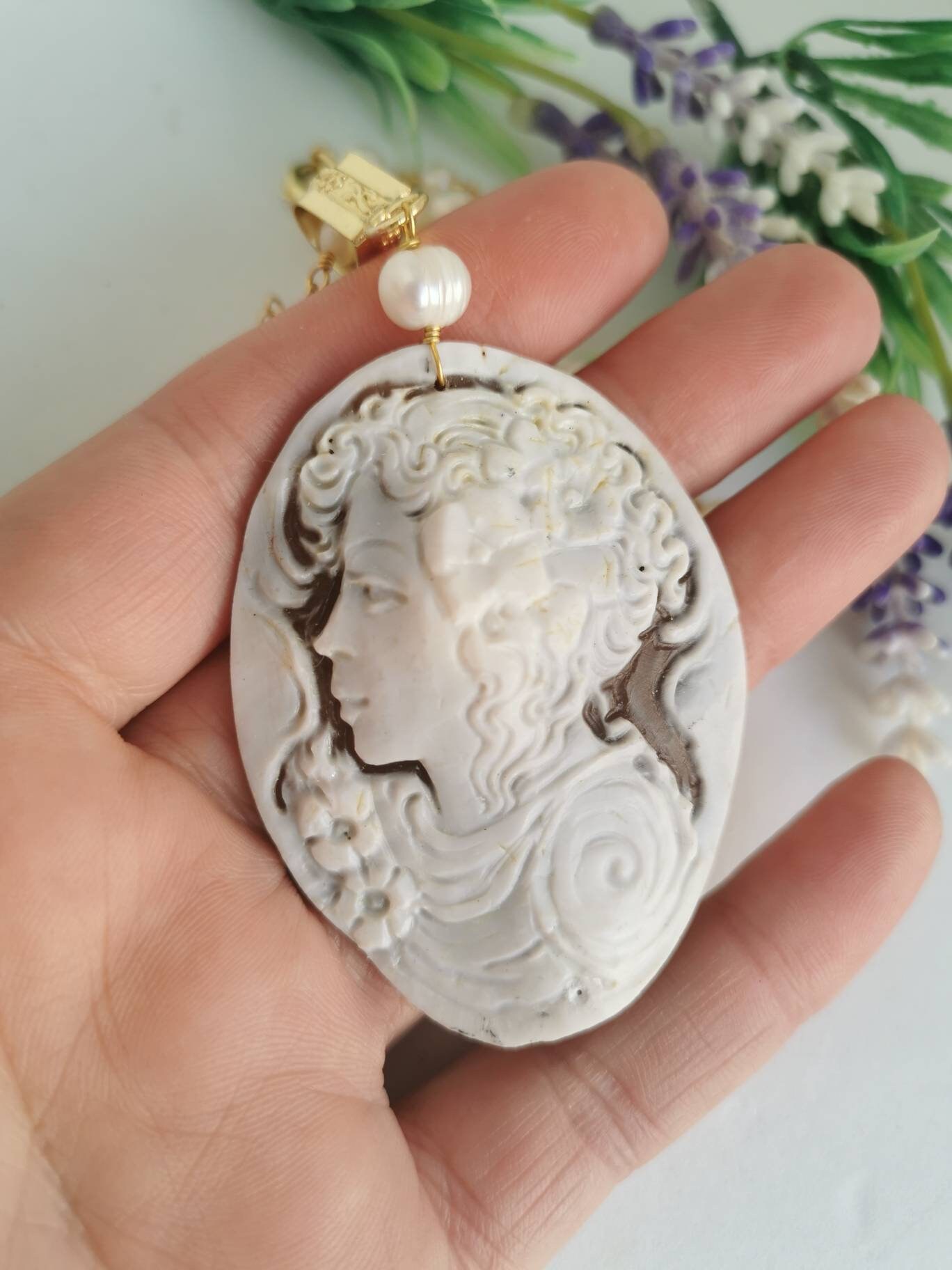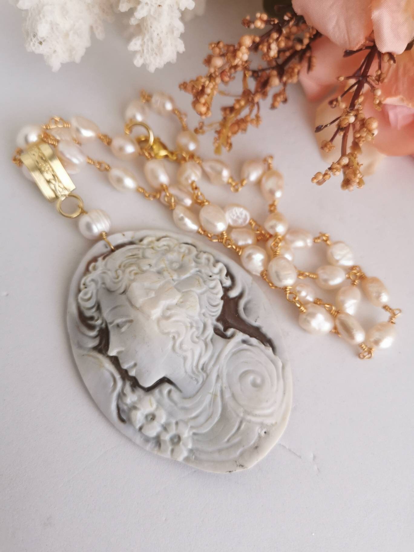 Collana a rosario con perle bianche naturali e pendente in cammeo autentico in conchiglia sardonica scolpita a mano a Torre del greco raffigurante volto di donna, 5,5×4,5 cm.