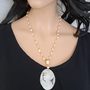 Collana cammeo conchiglia con perle bianche e pietre quarzo citrino, gioielli italiani