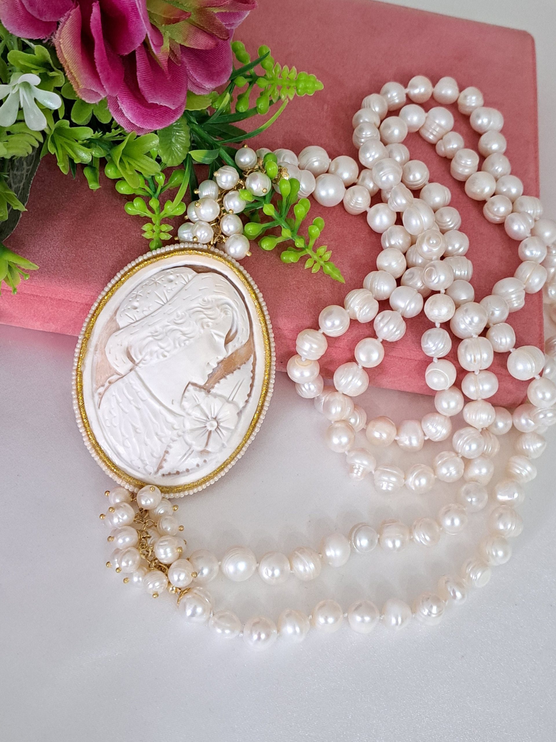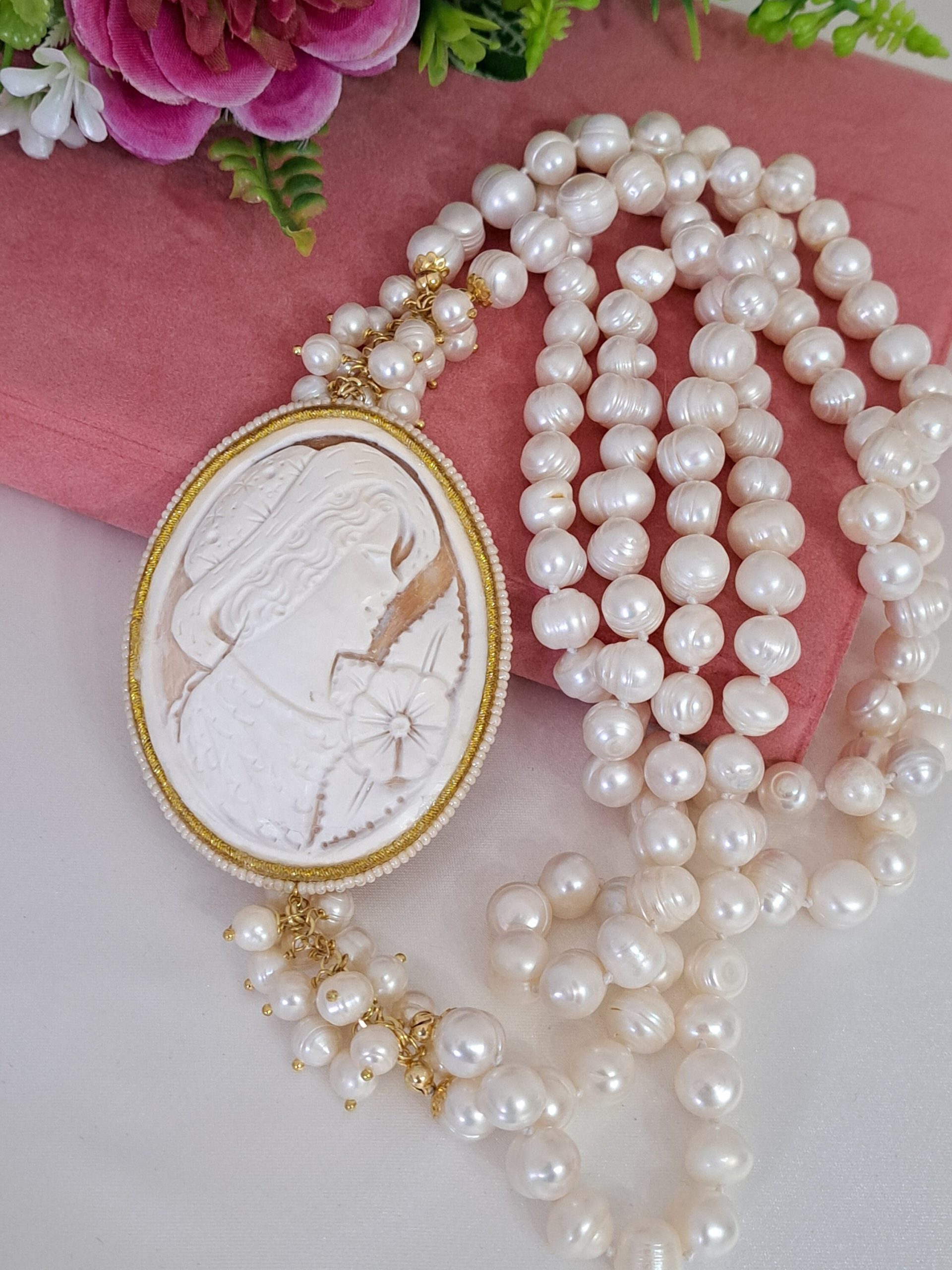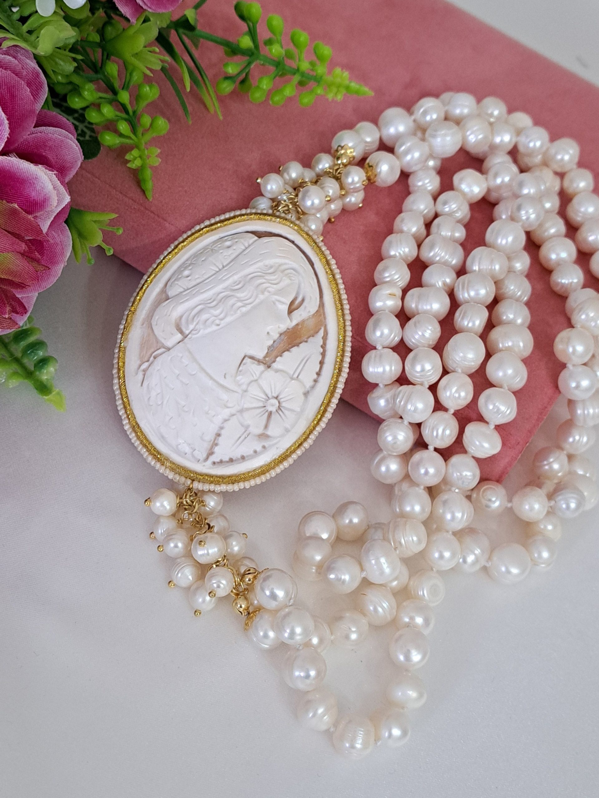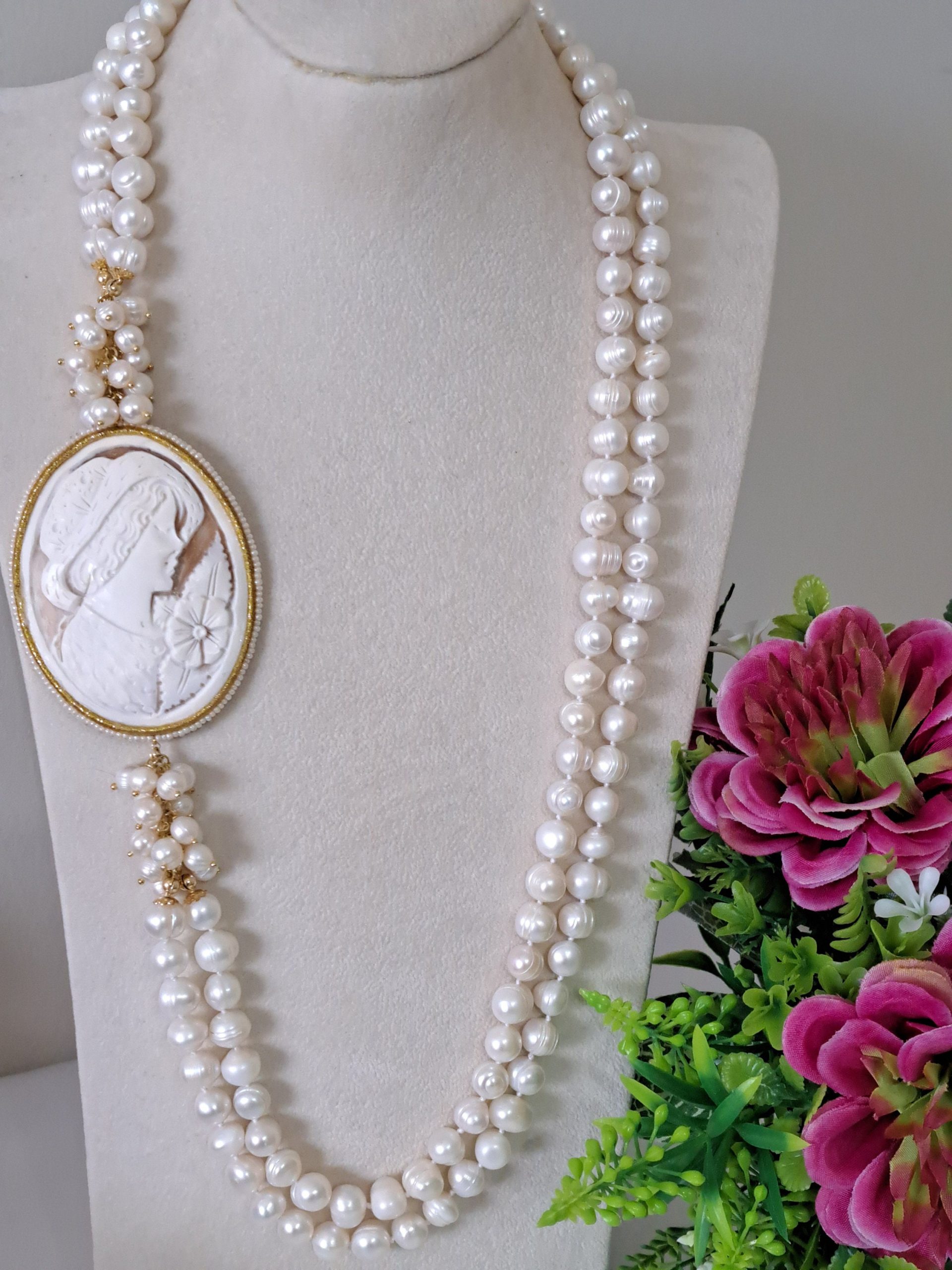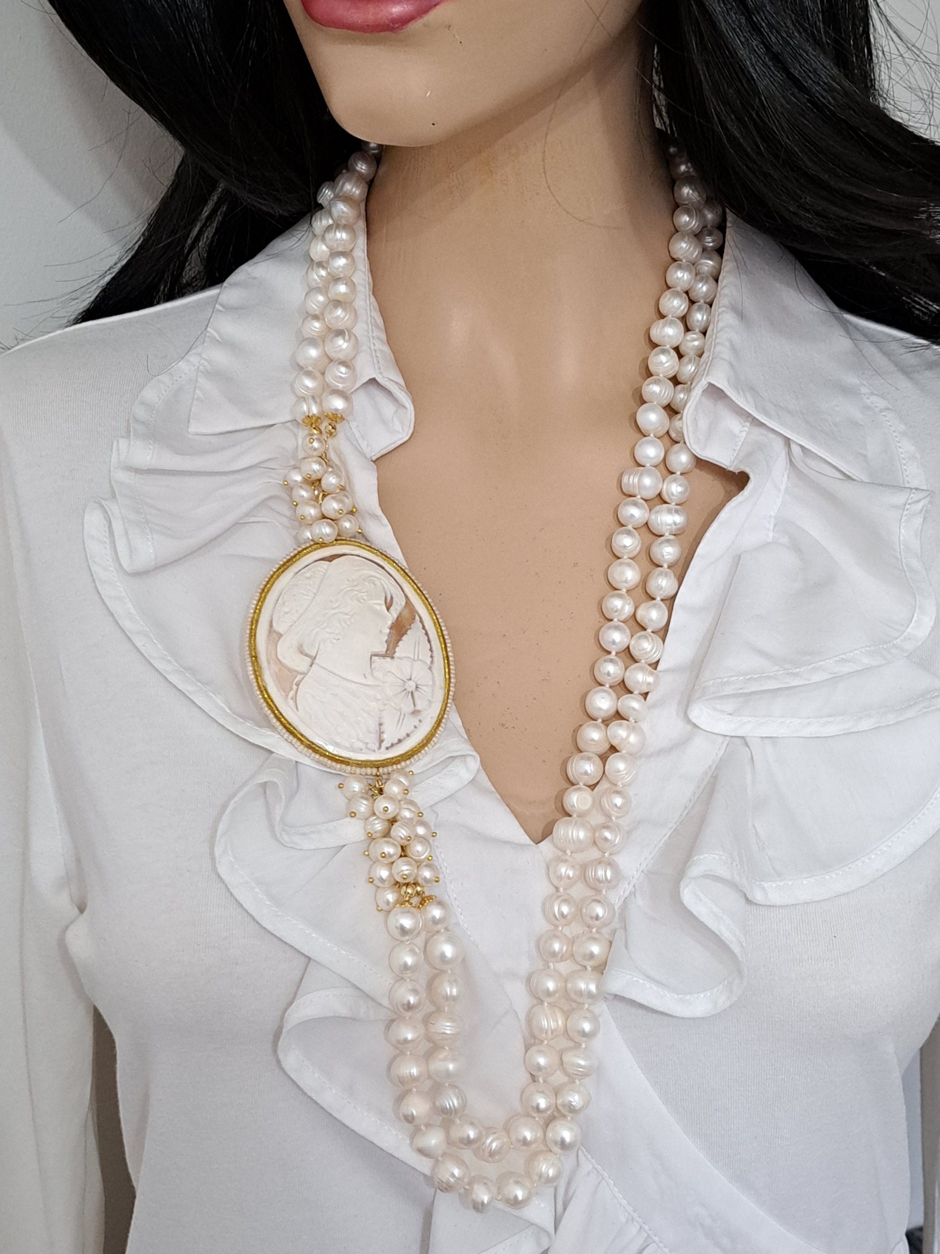 Collana cammeo conchiglia sardonica , perle naturali bianche , collana multifilo, collana 2 fili, gioielli italiani